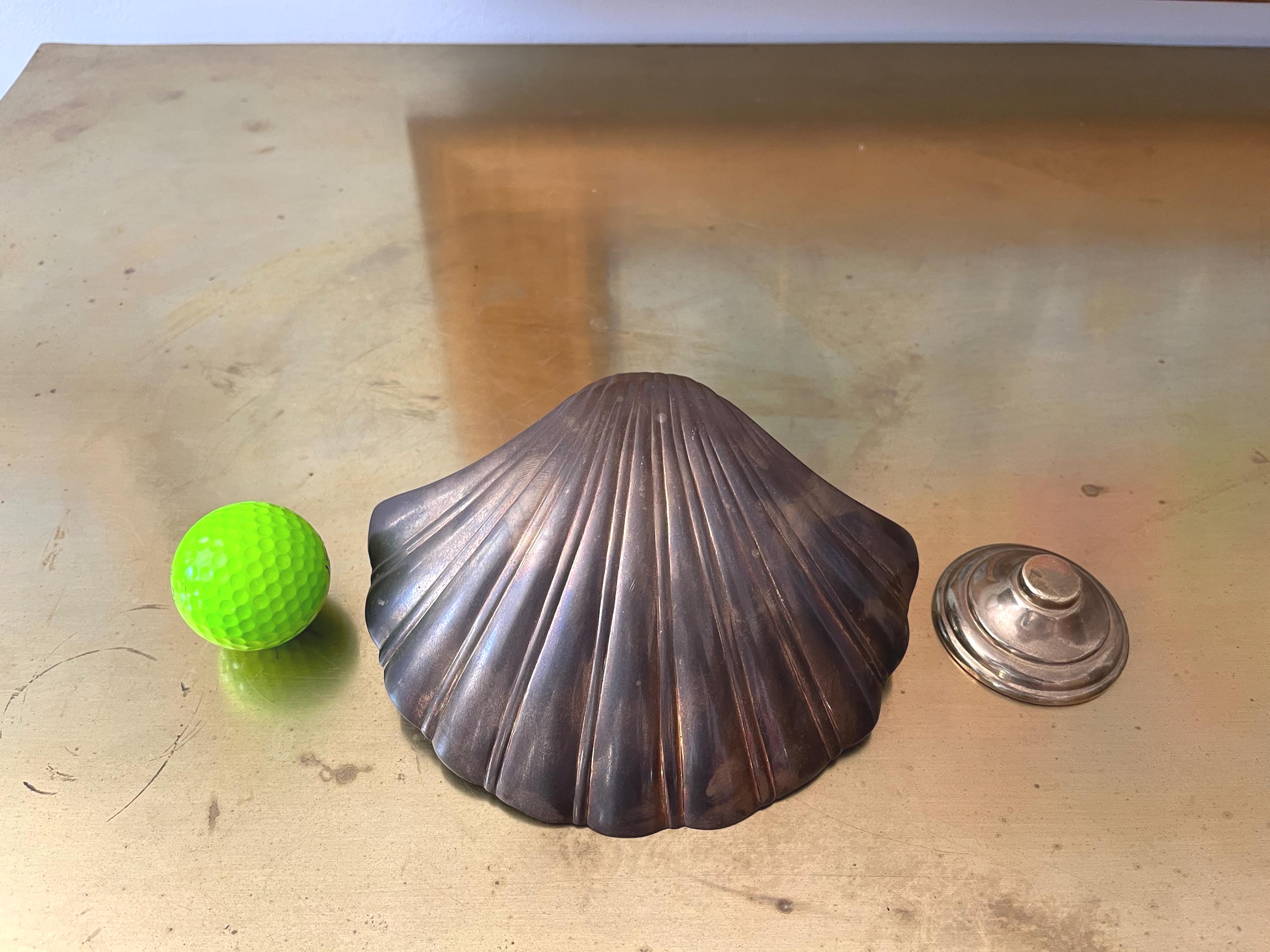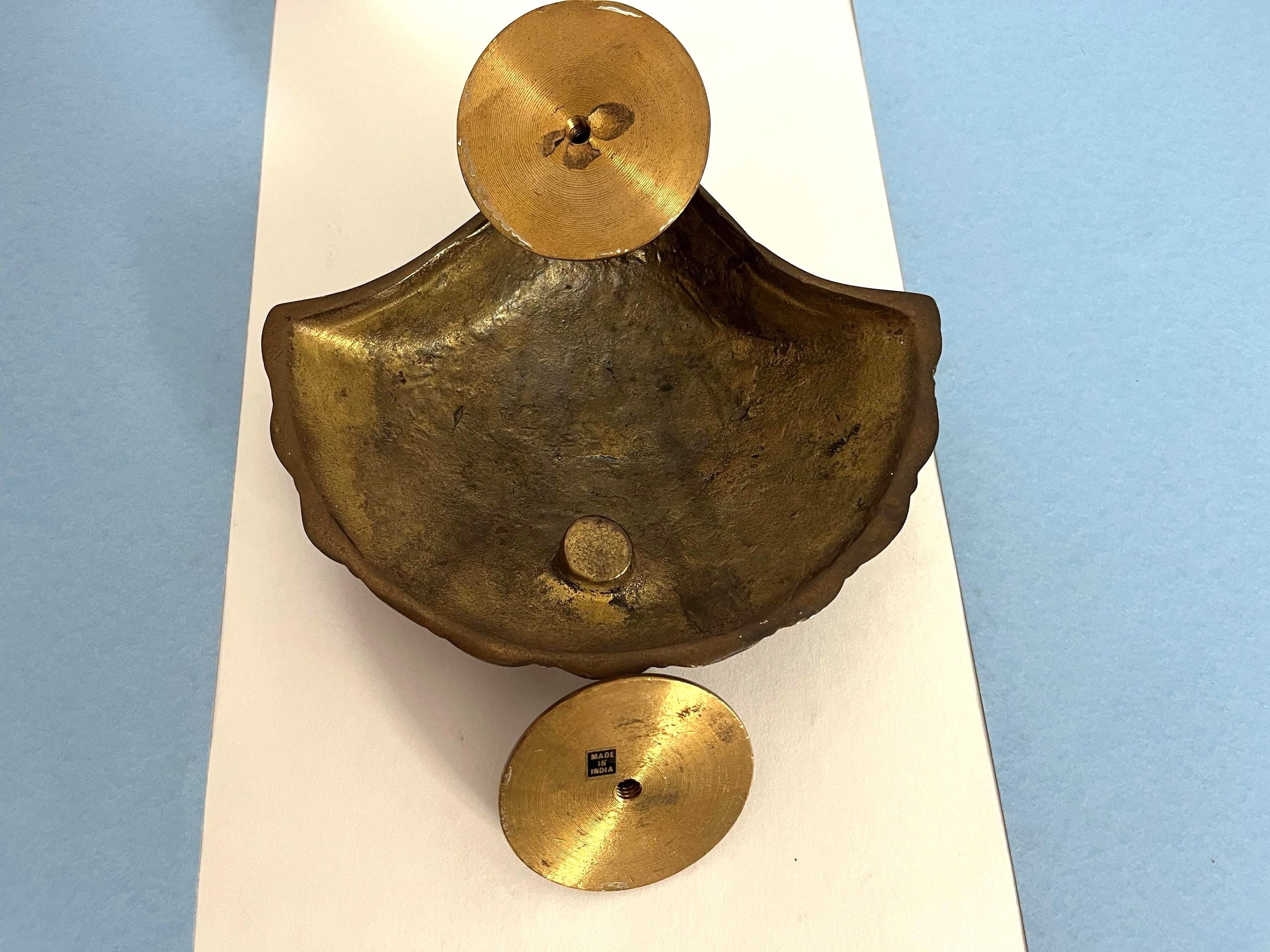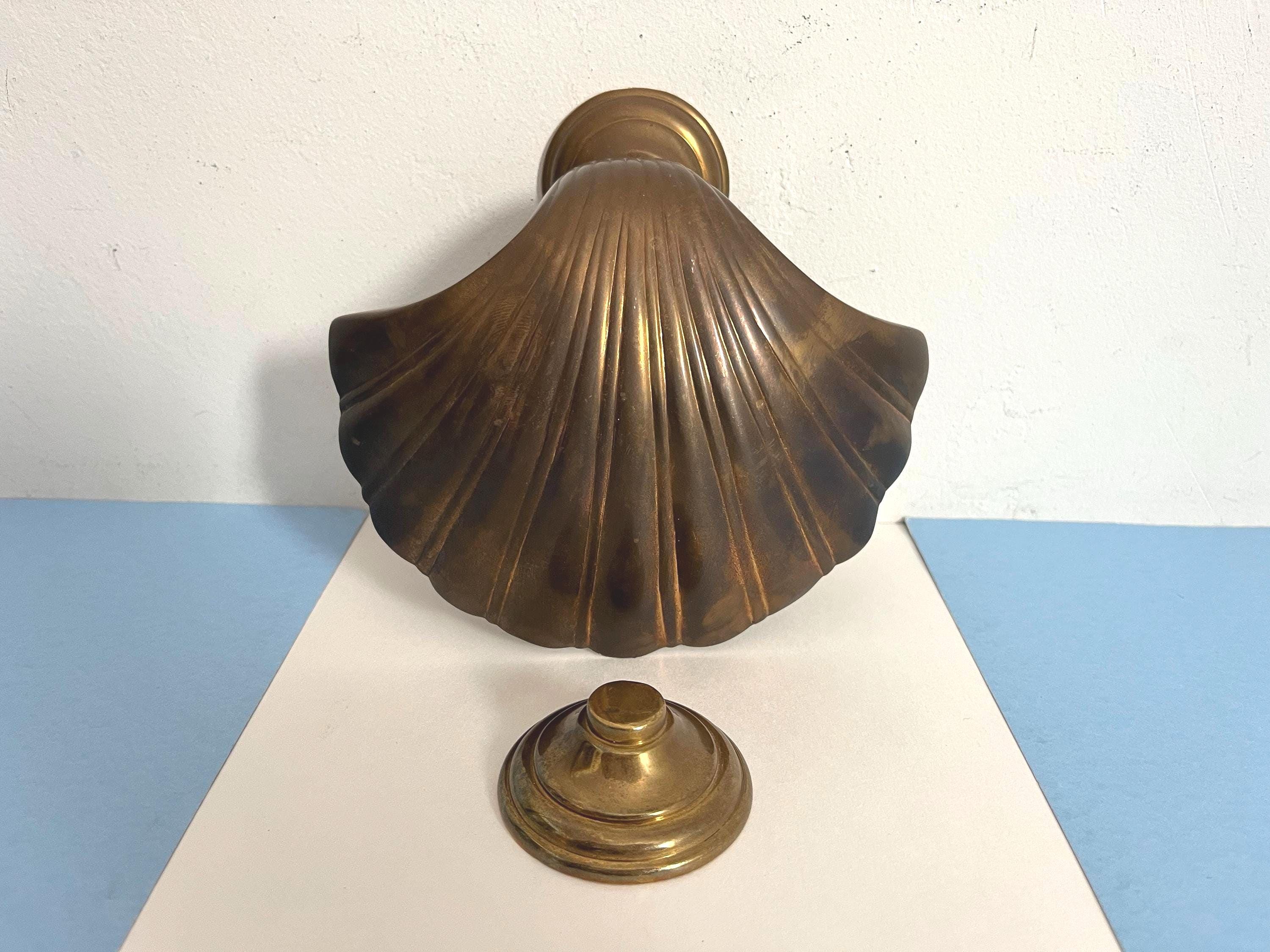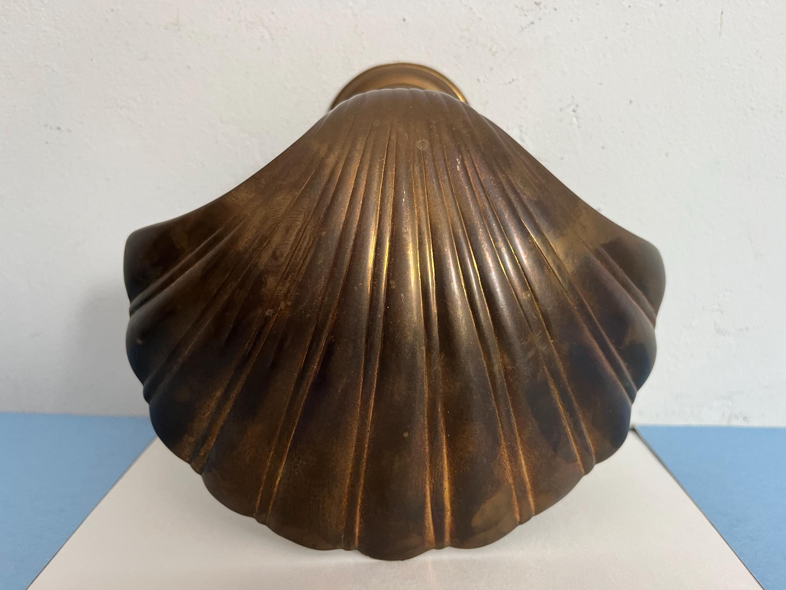 Big beautiful brass clam shell door knocker from the 1960s/70s with sleek incised curvy lines, aged finish, and original strike plate. Marked, made in India.