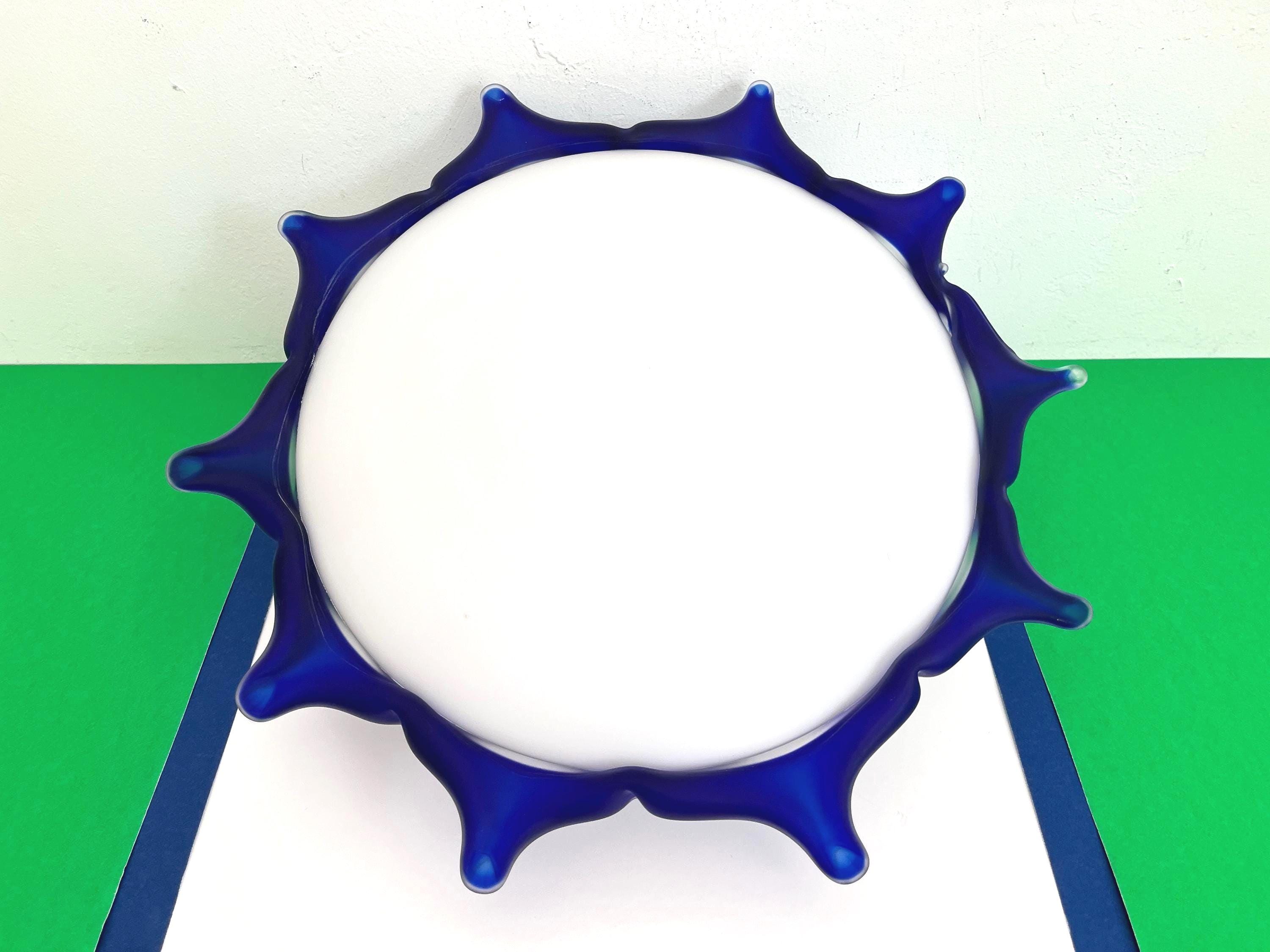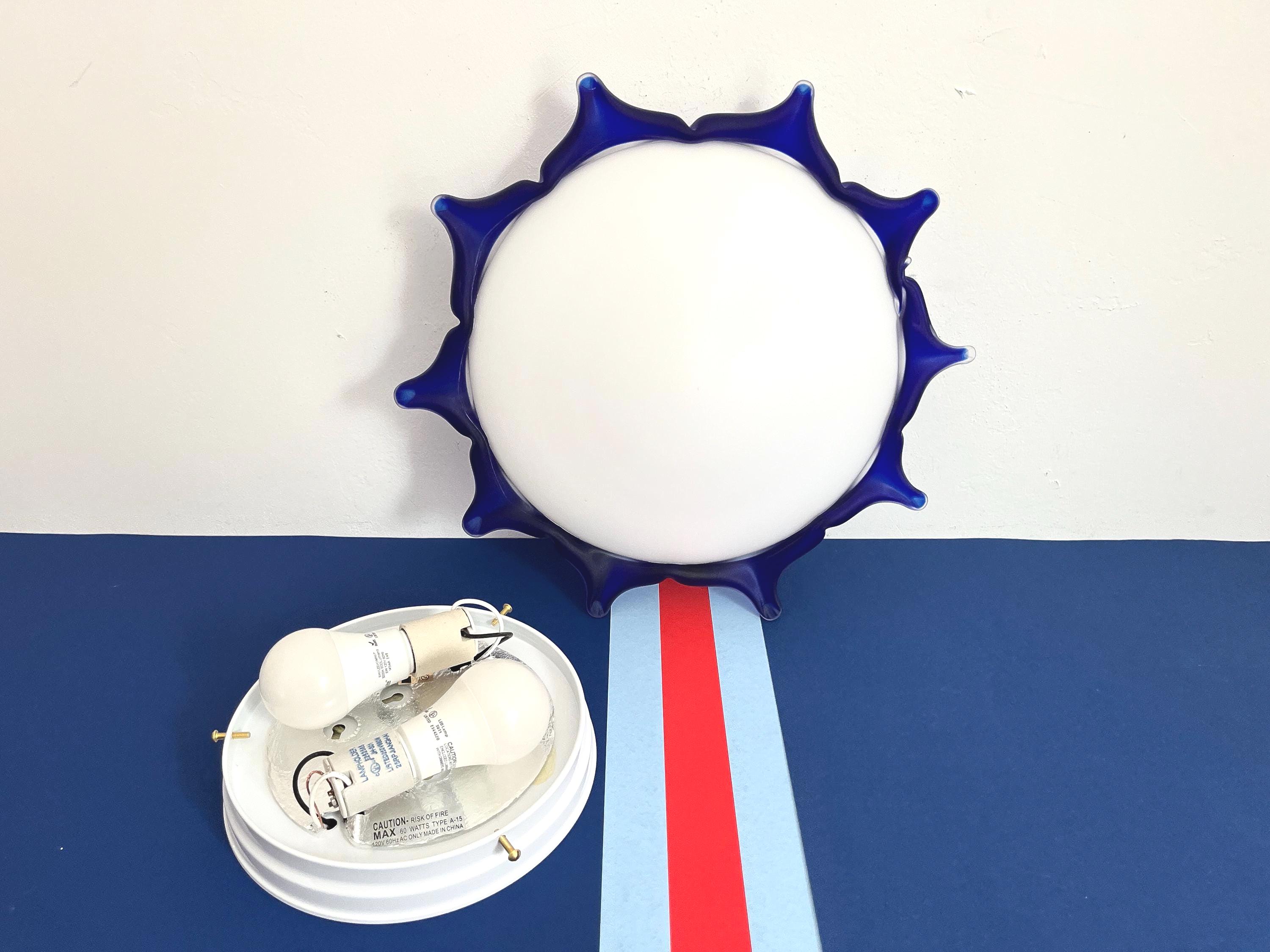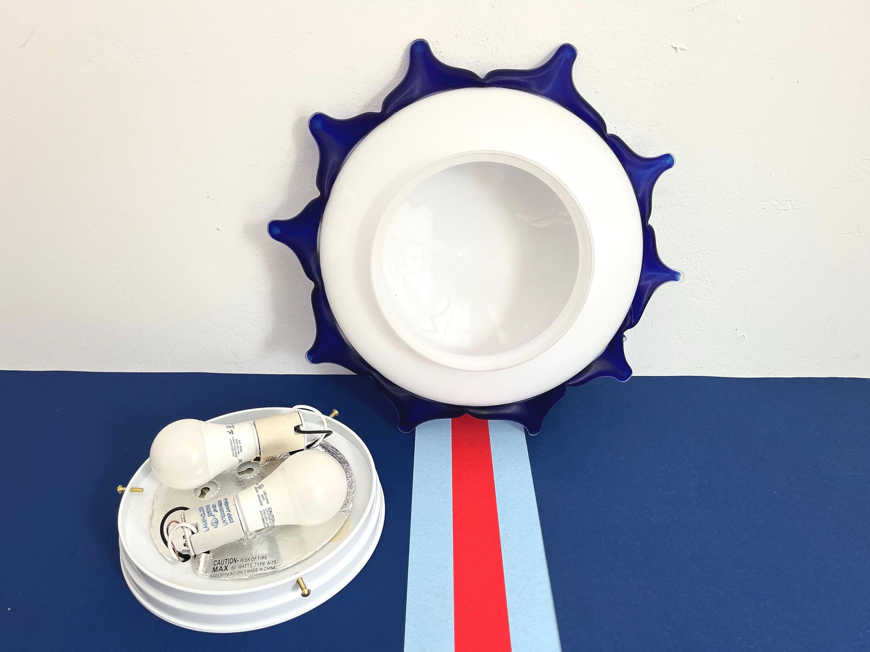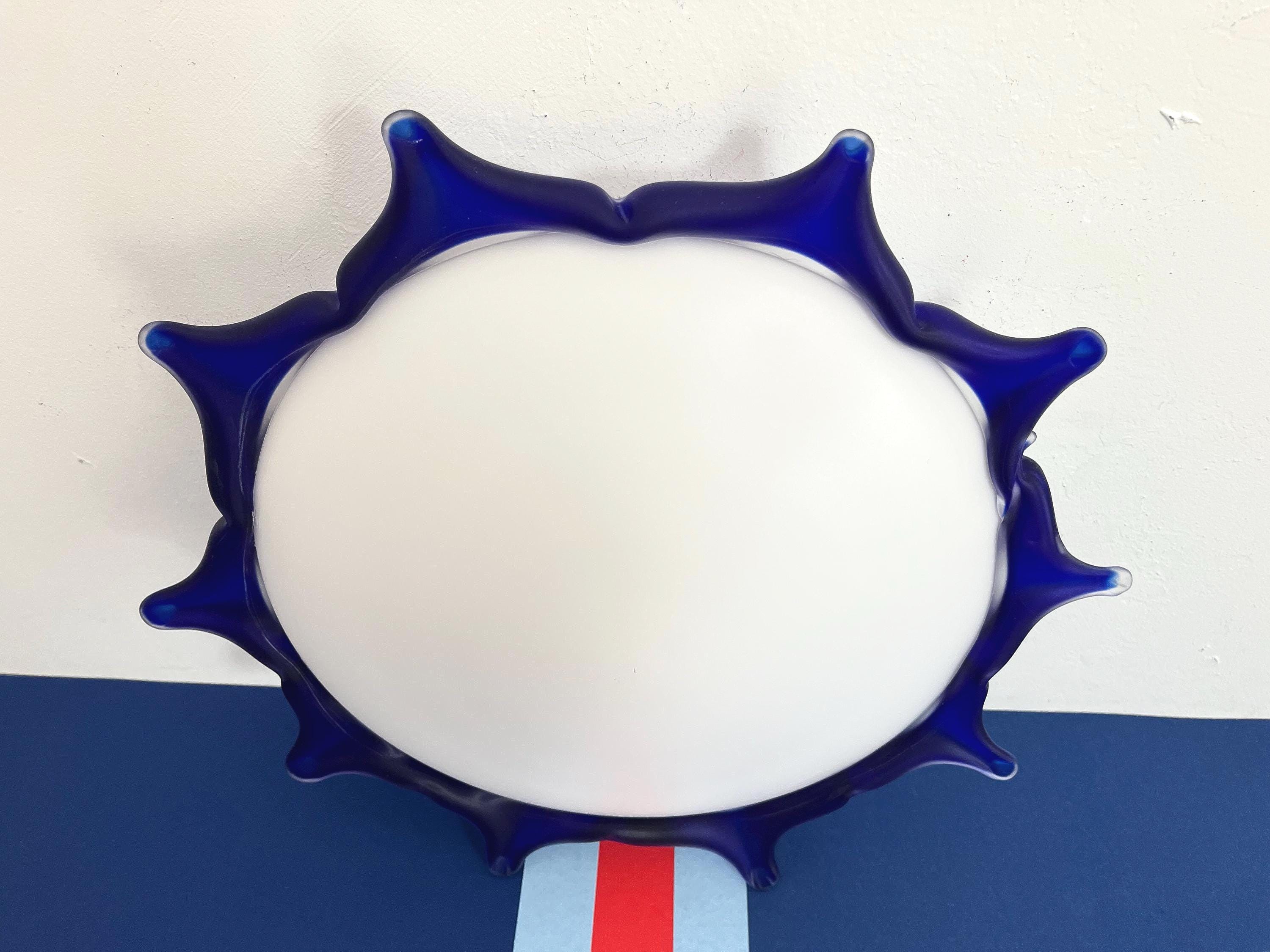 Stunning 1960s Italian hand blown glass sun flush mount ceiling or wall light in opaque white frosted Venetian glass with dimensional Yves Klein blue rays by S. Dona' di Piave. Newly wired with new sockets for standard bulbs. Comes ready to install with white metal mounting plate and hardware.
