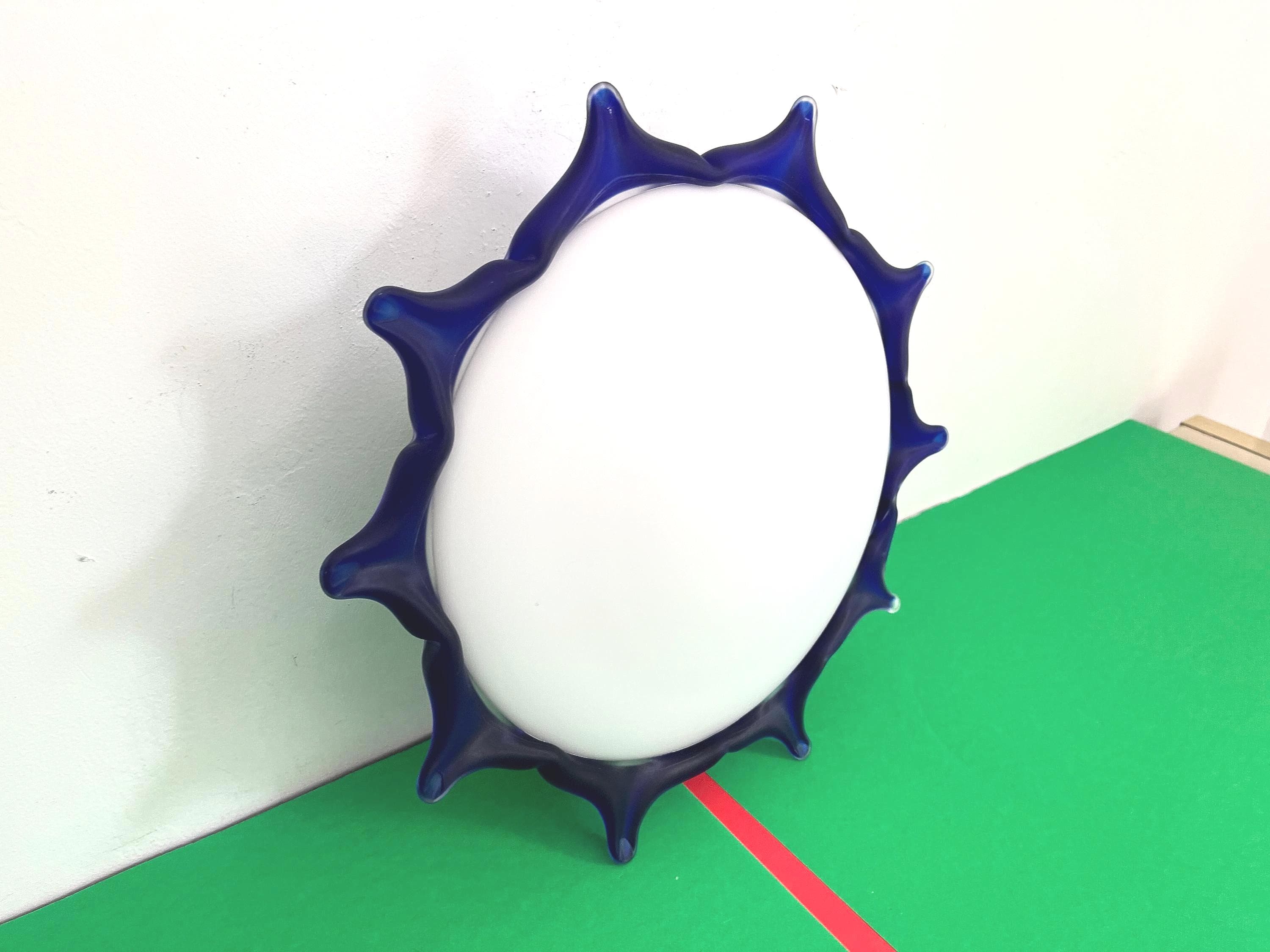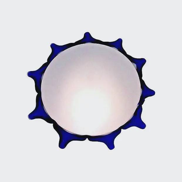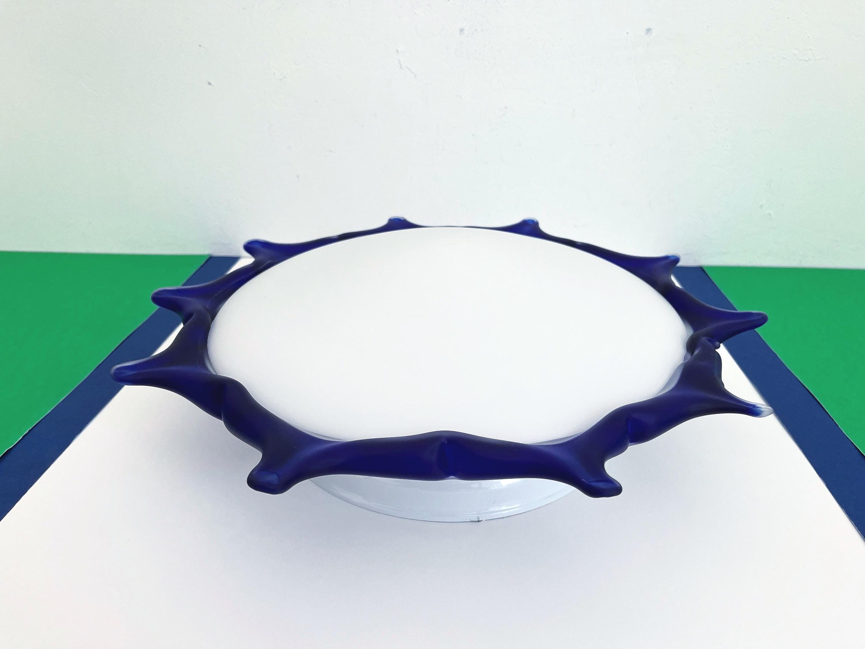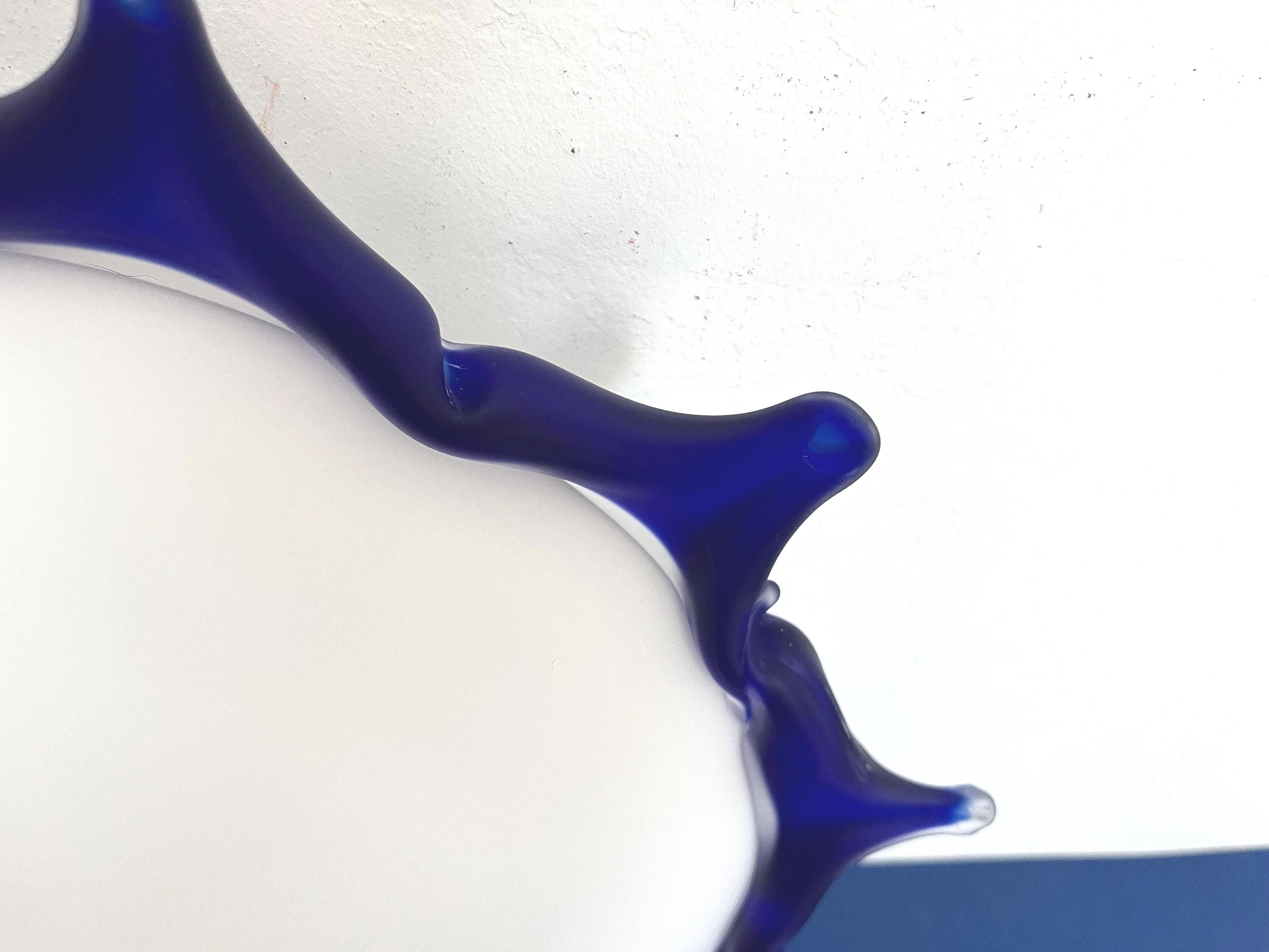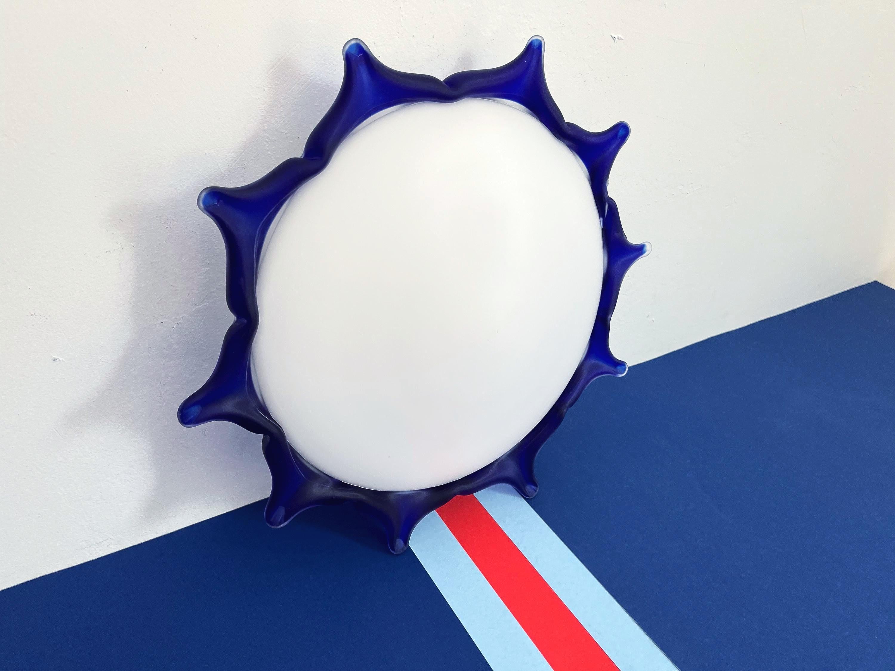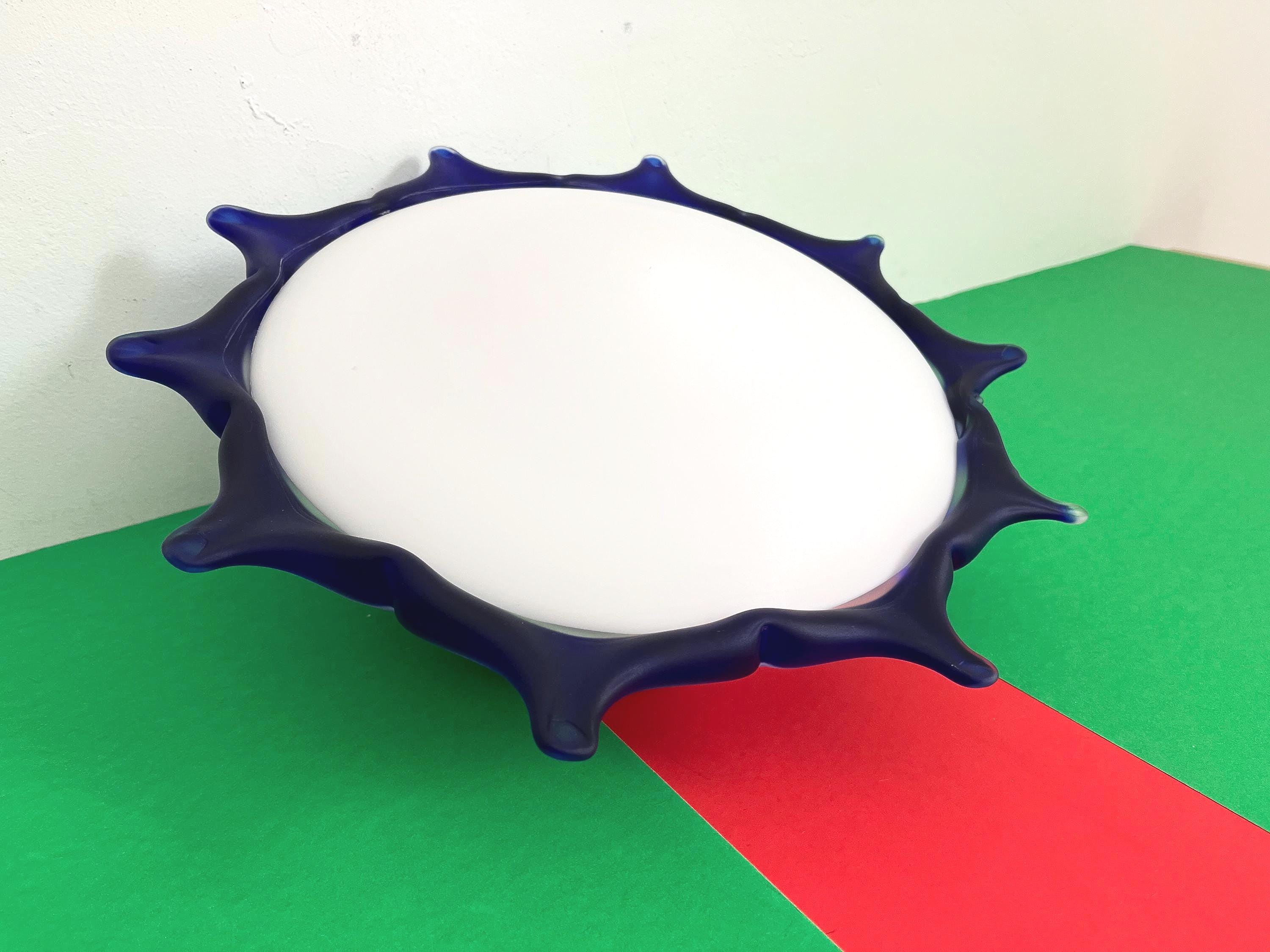 Stunning 1960s Italian hand blown glass sun flush mount ceiling or wall light in opaque white frosted Venetian glass with dimensional Yves Klein blue rays by S. Dona' di Piave. Newly wired with new sockets for standard bulbs. Comes ready to install with white metal mounting plate and hardware.