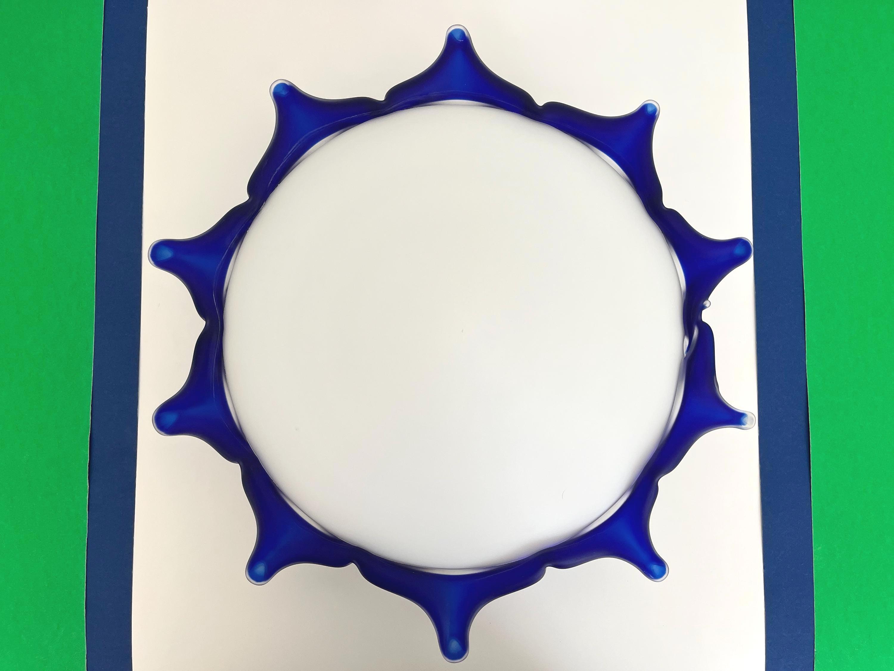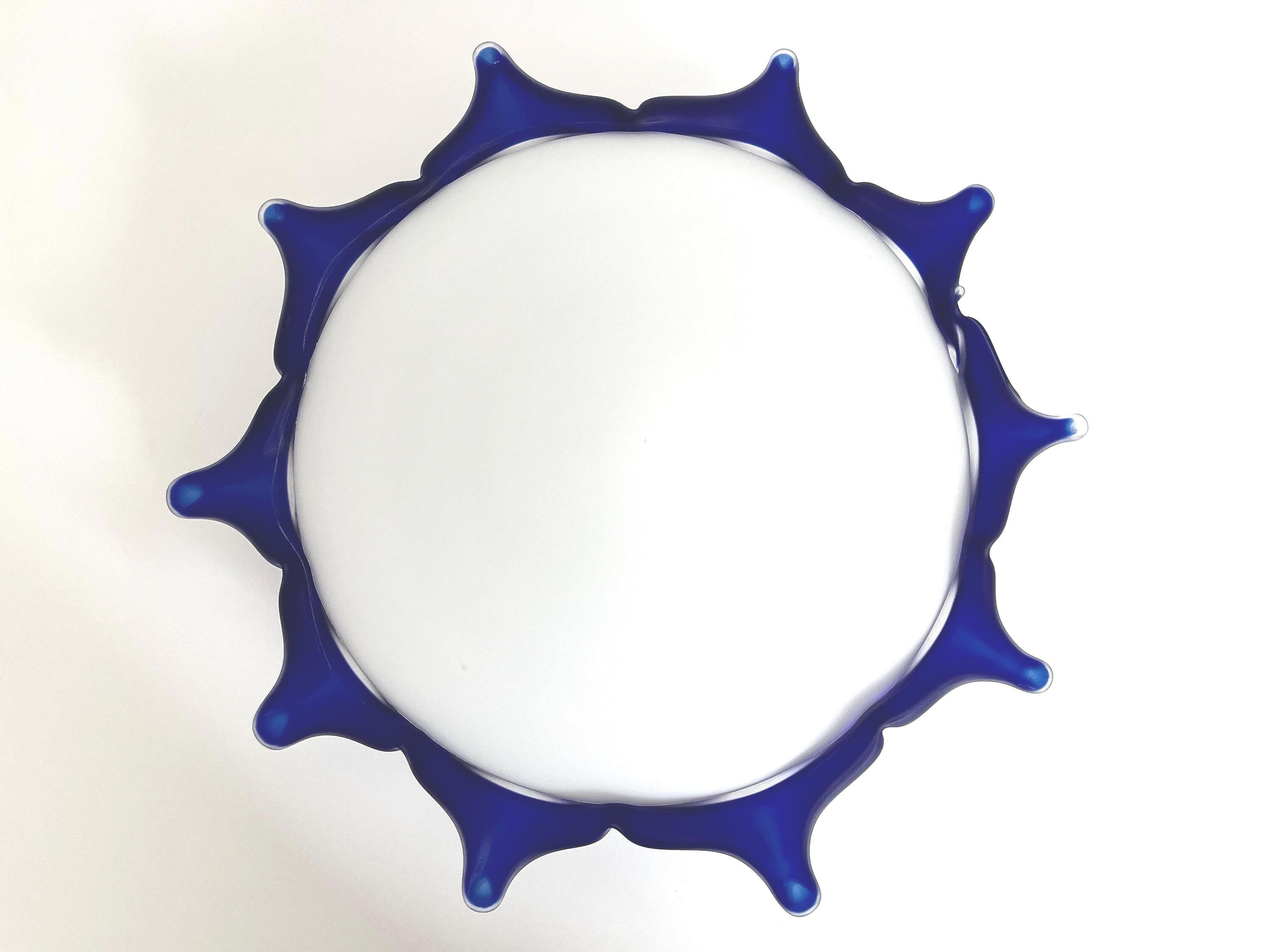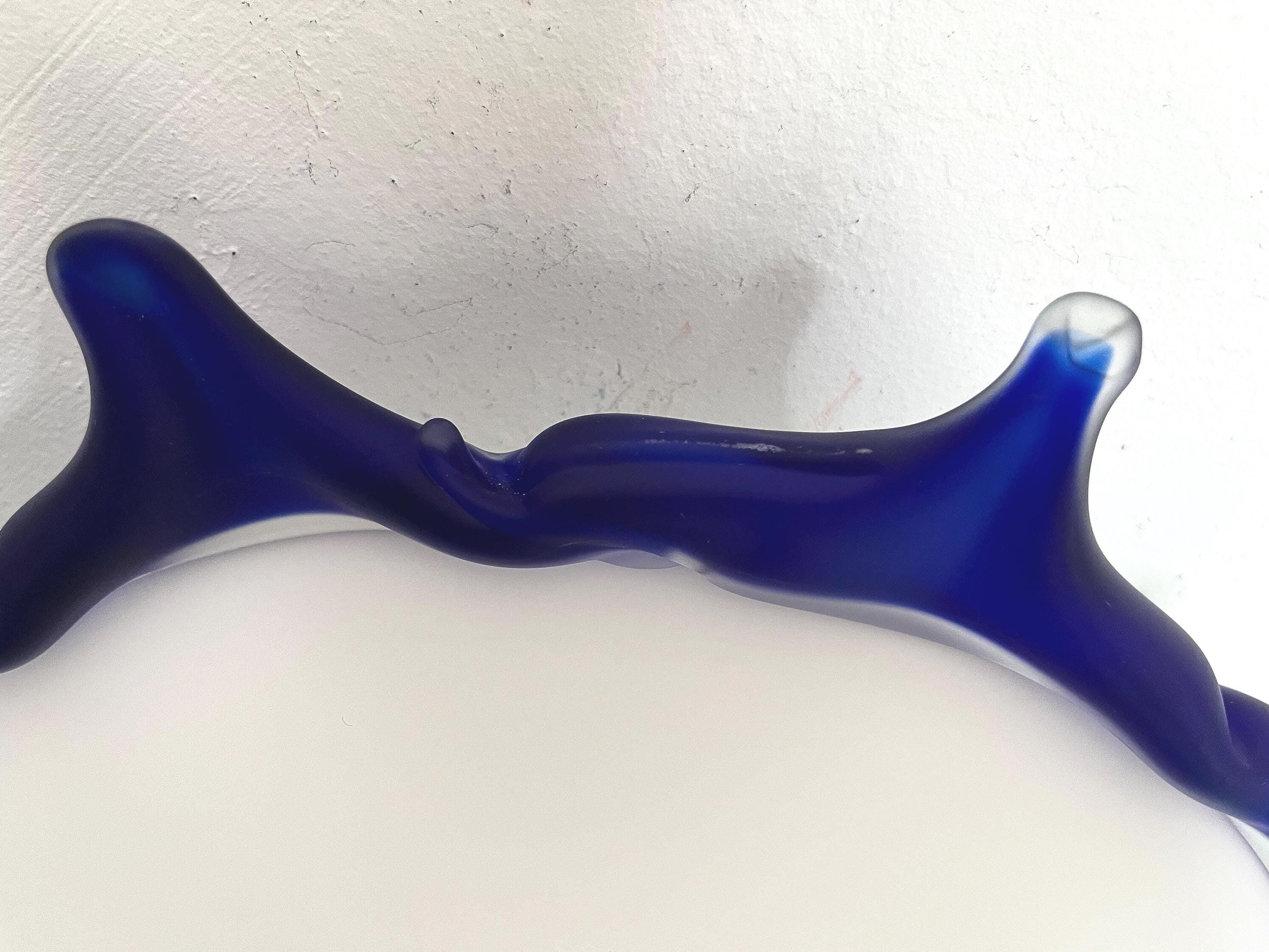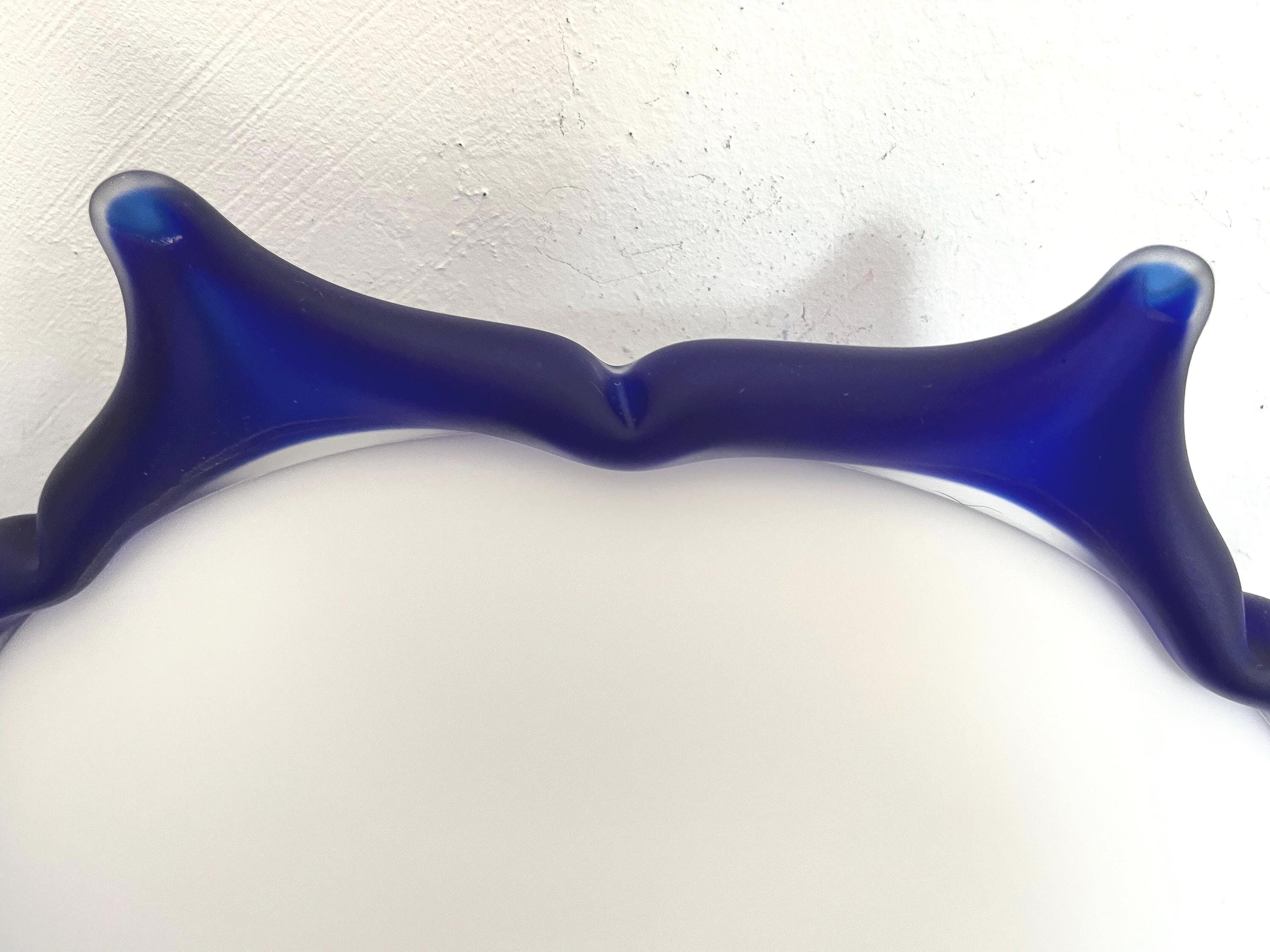 Stunning 1960s Italian hand blown glass sun flush mount ceiling or wall light in opaque white frosted Venetian glass with dimensional Yves Klein blue rays by S. Dona' di Piave. Newly wired with new sockets for standard bulbs. Comes ready to install with white metal mounting plate and hardware.