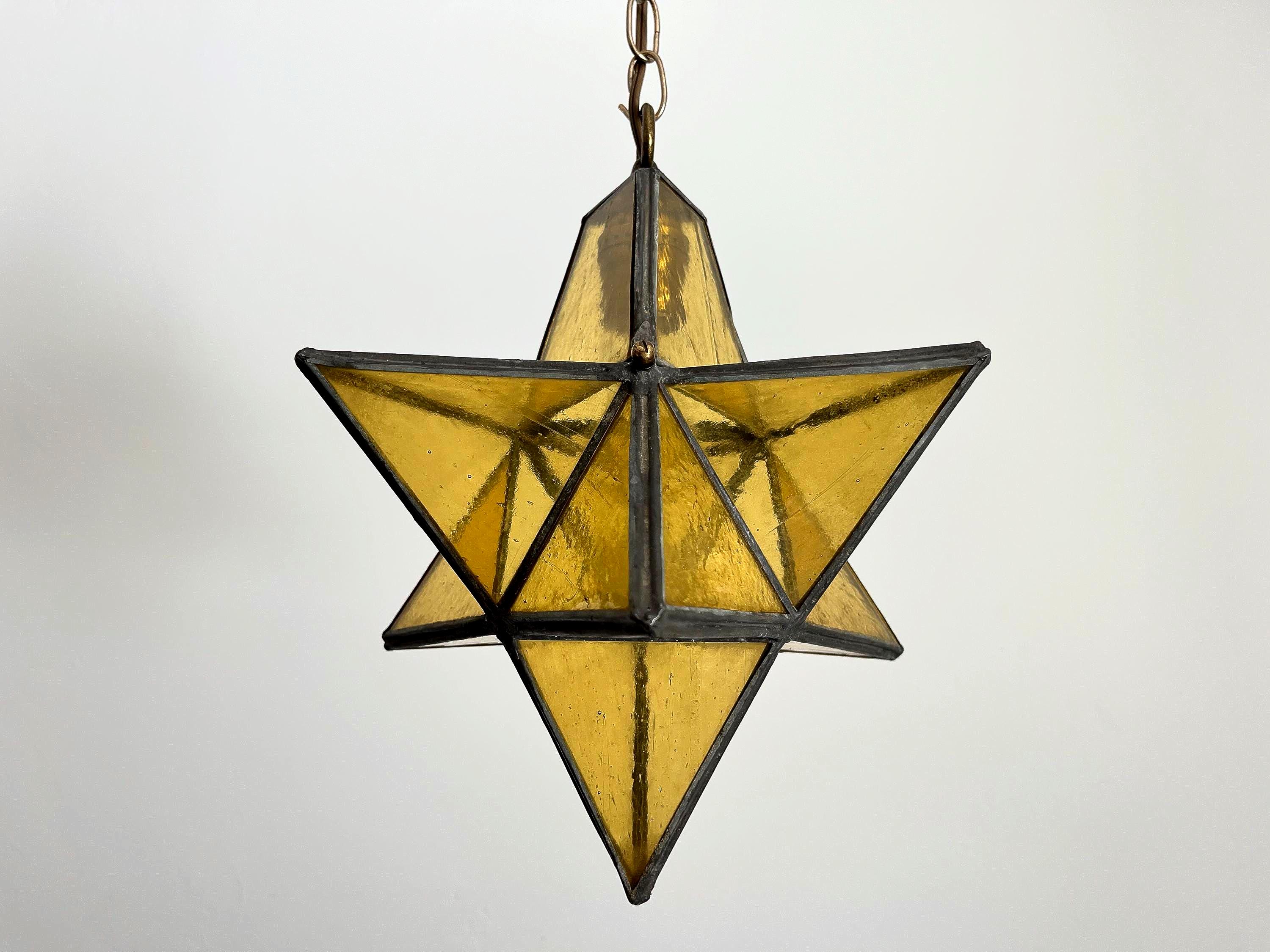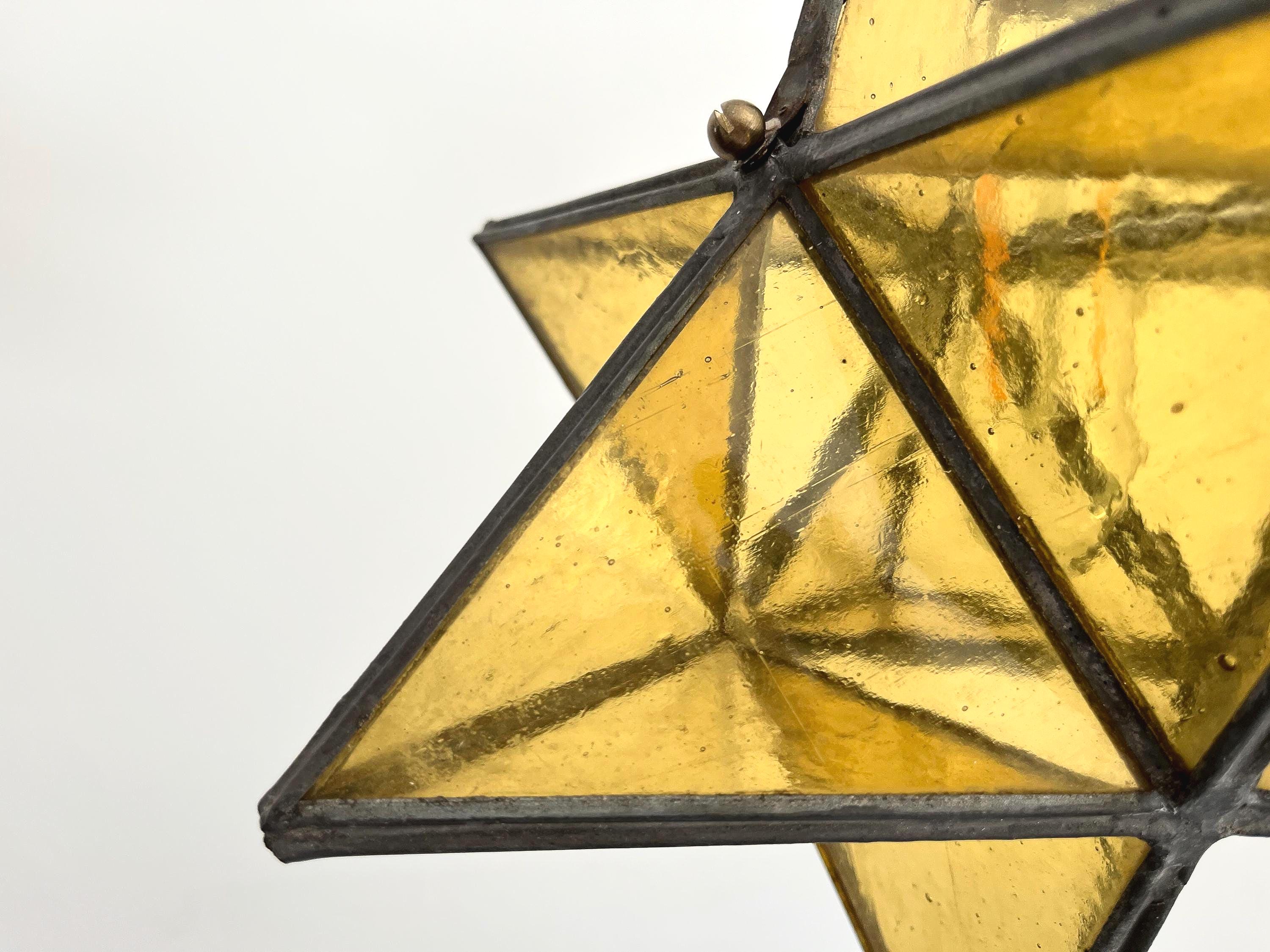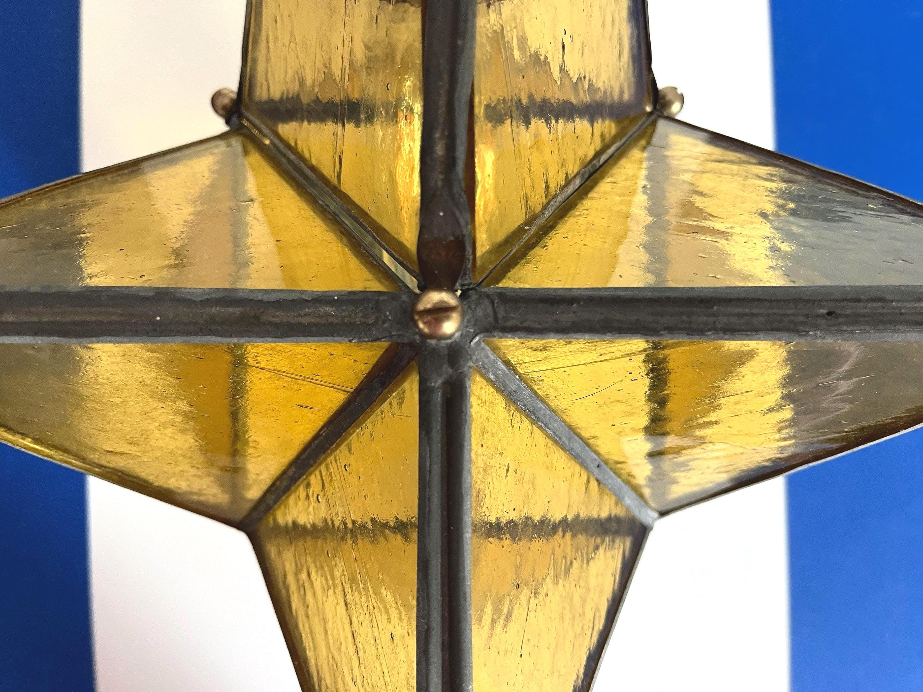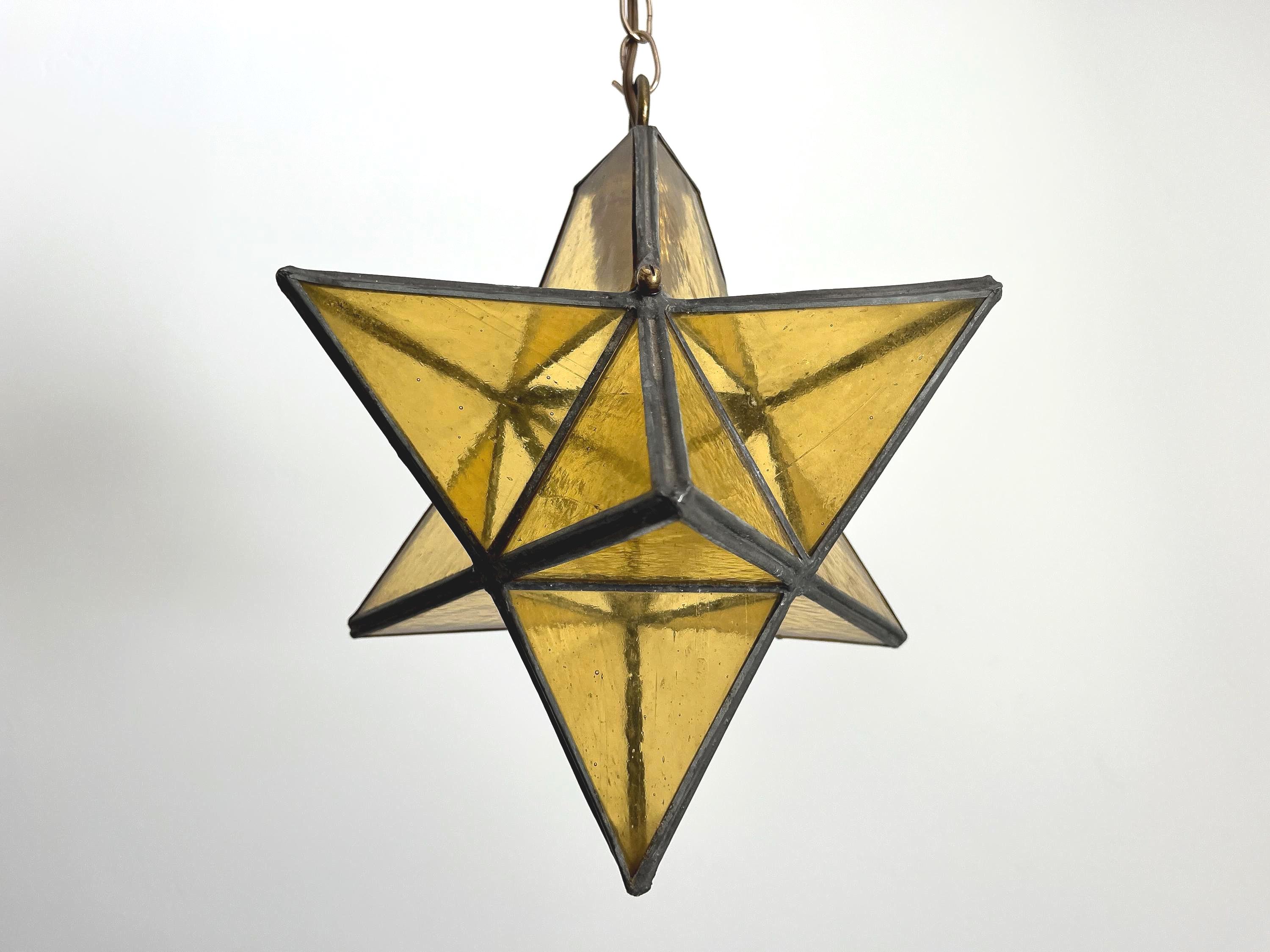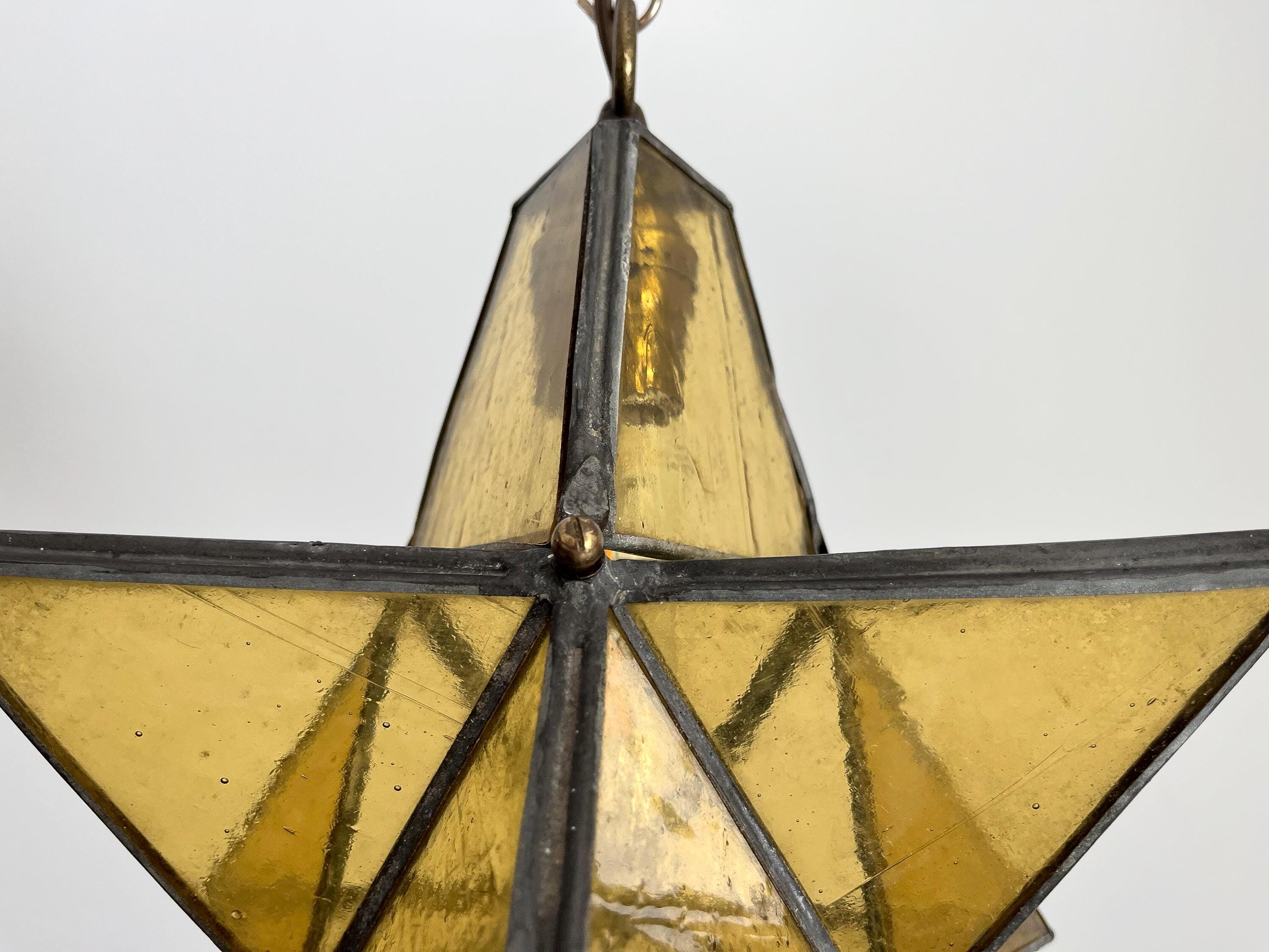 Gorgeous petite mid century honey gold seeded and striated glass pendant light in the shape of a star with zinc panels and central light. Professionally restored with new wiring and socket for standard bulb.