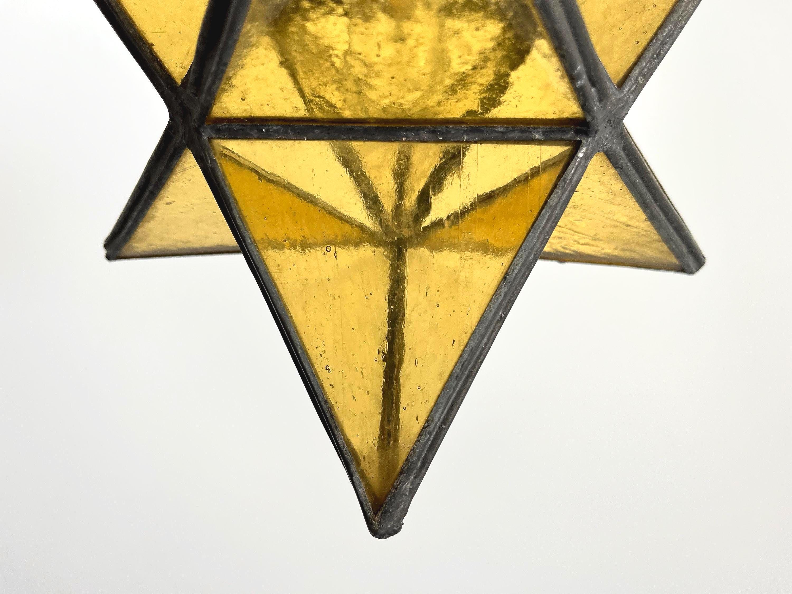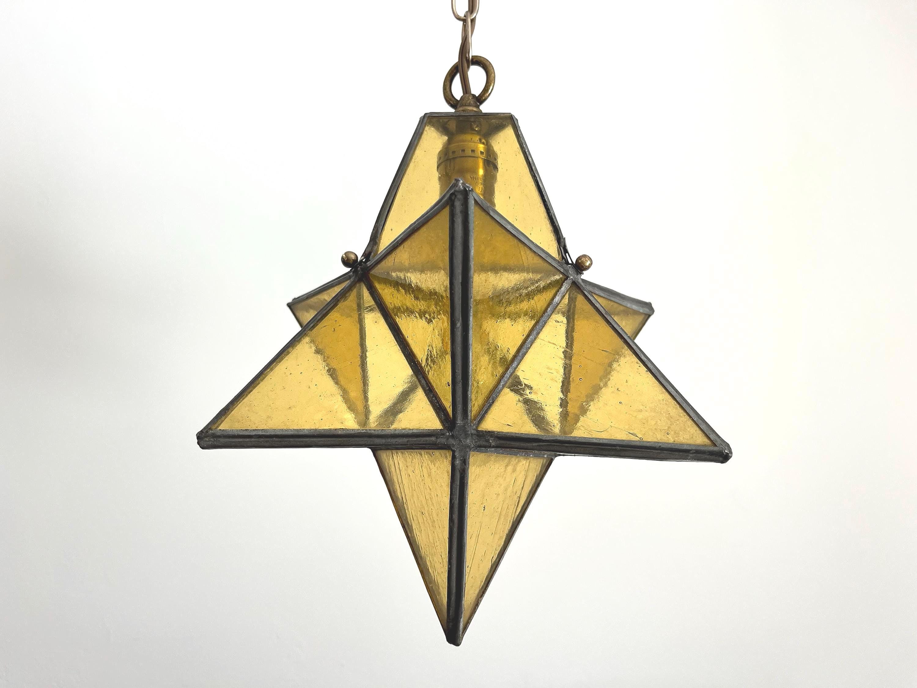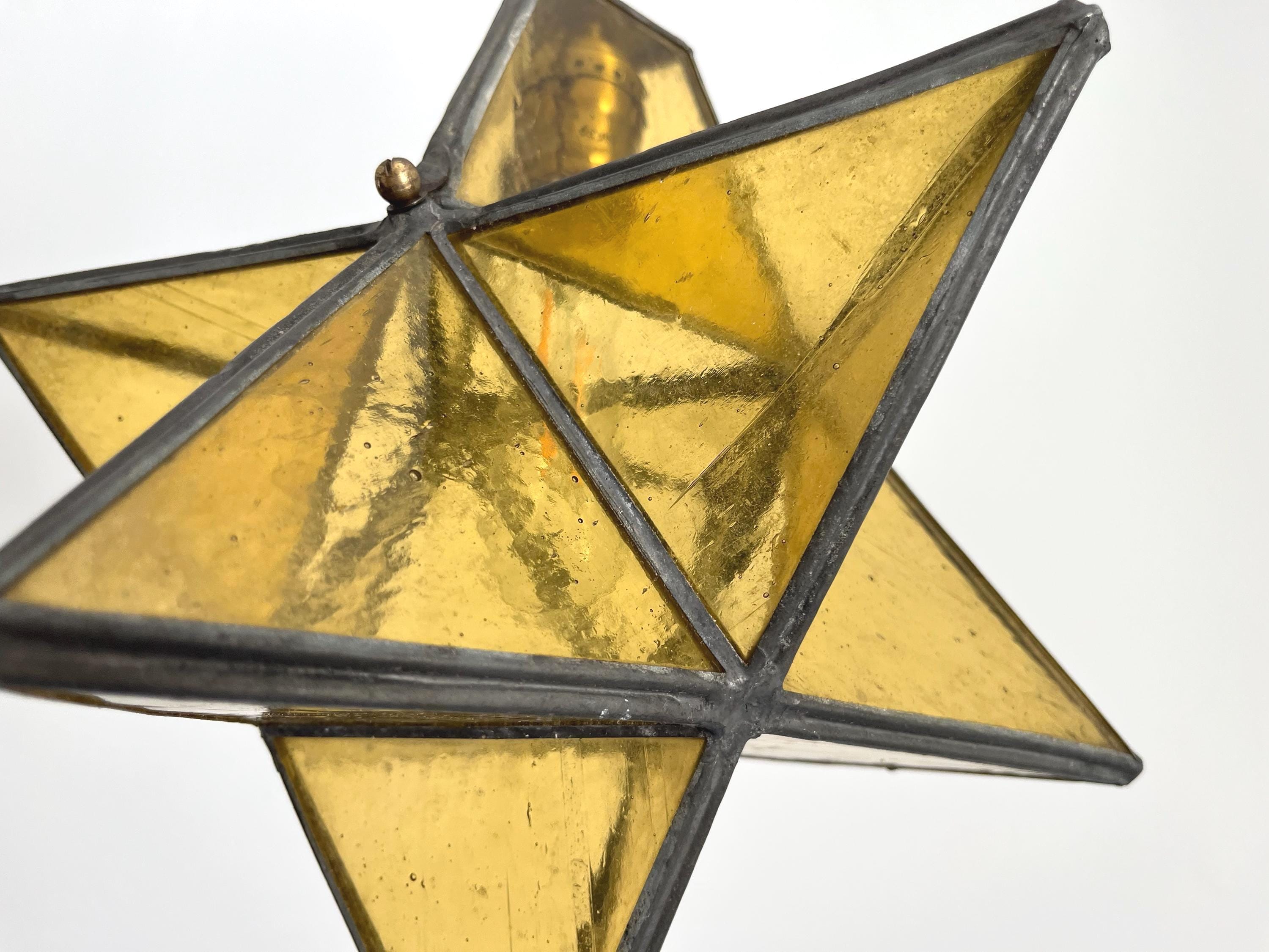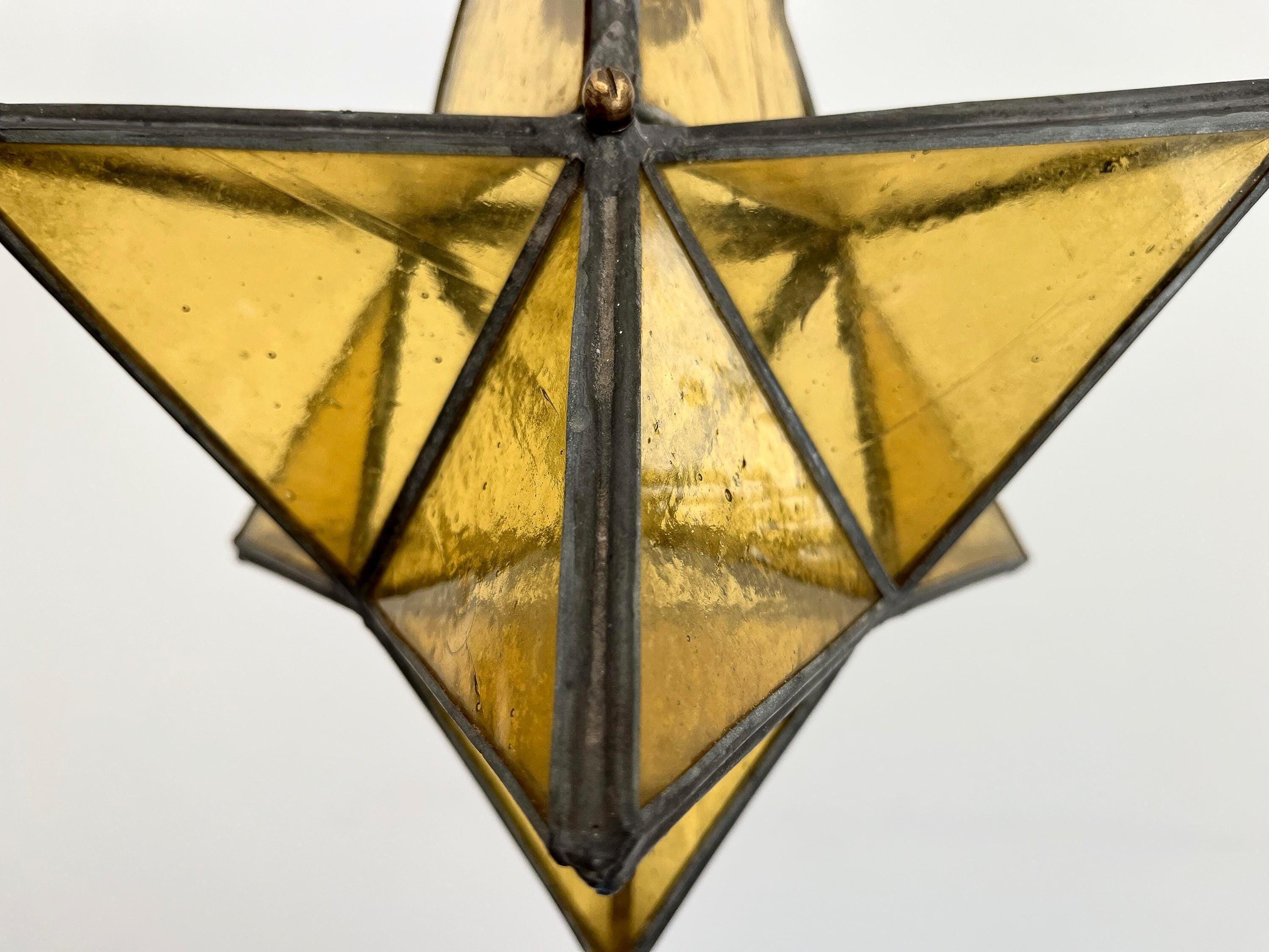 Gorgeous petite mid century honey gold seeded and striated glass pendant light in the shape of a star with zinc panels and central light. Professionally restored with new wiring and socket for standard bulb.