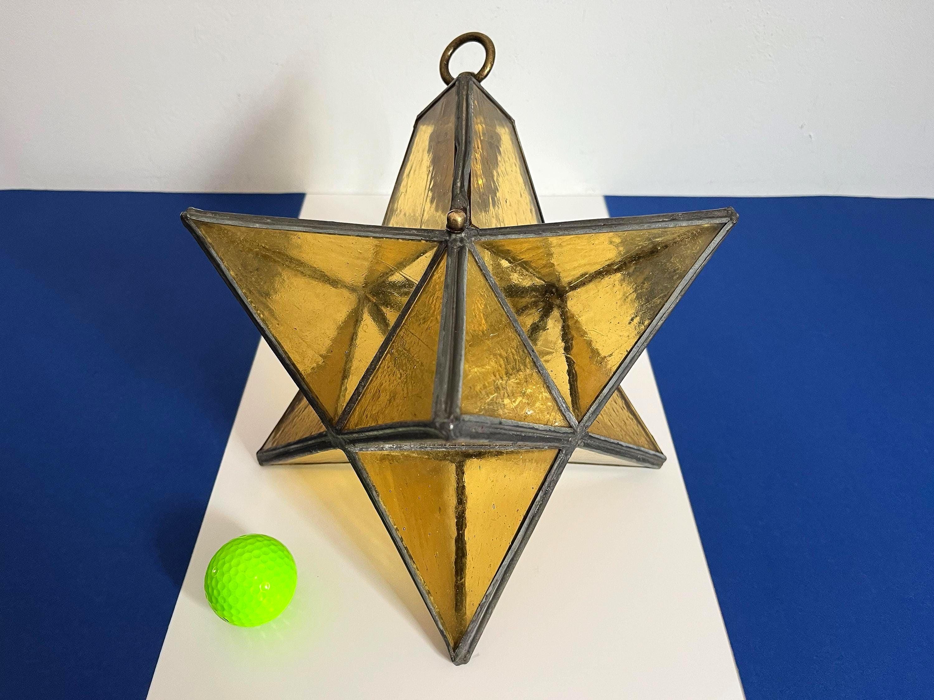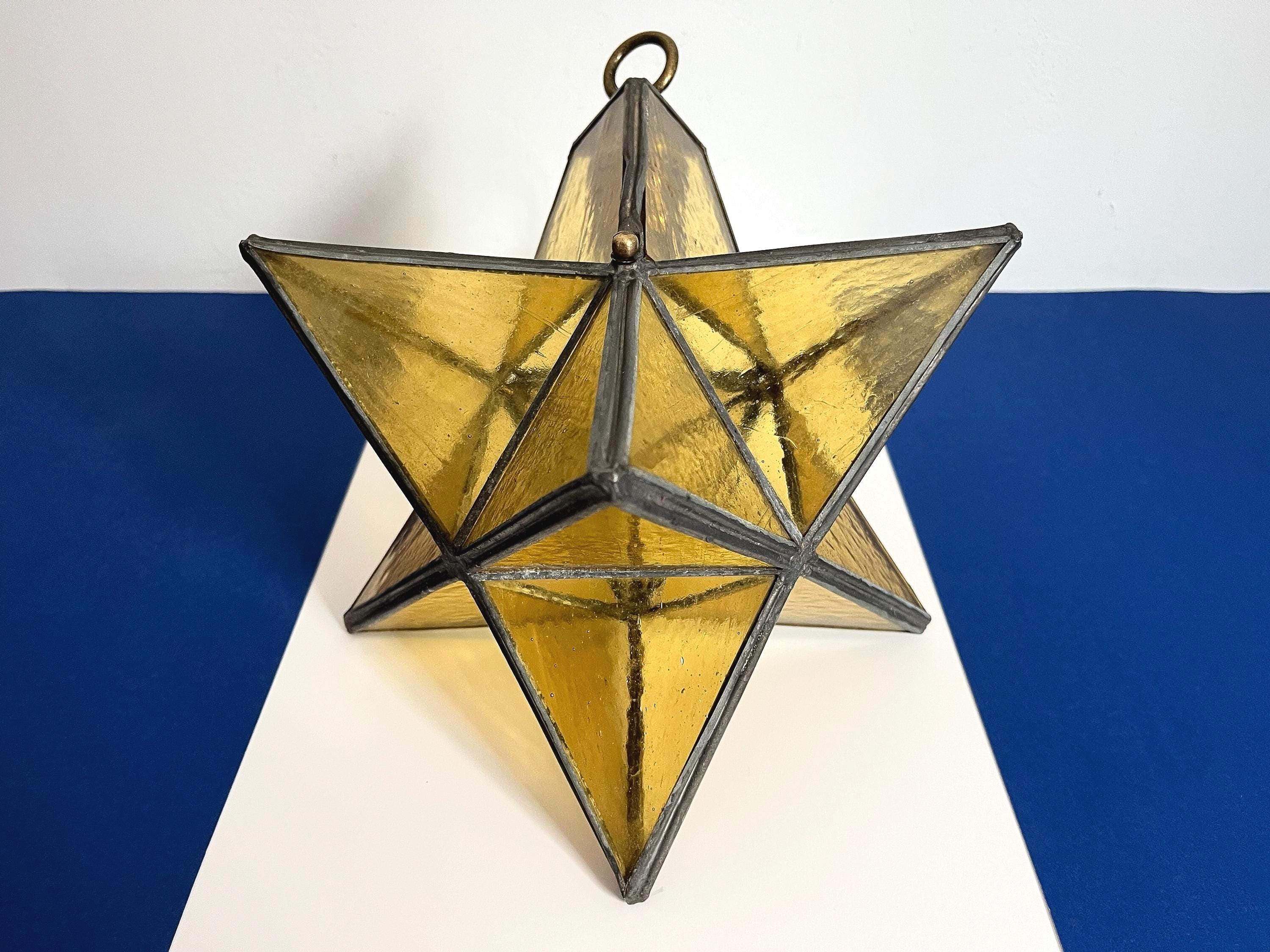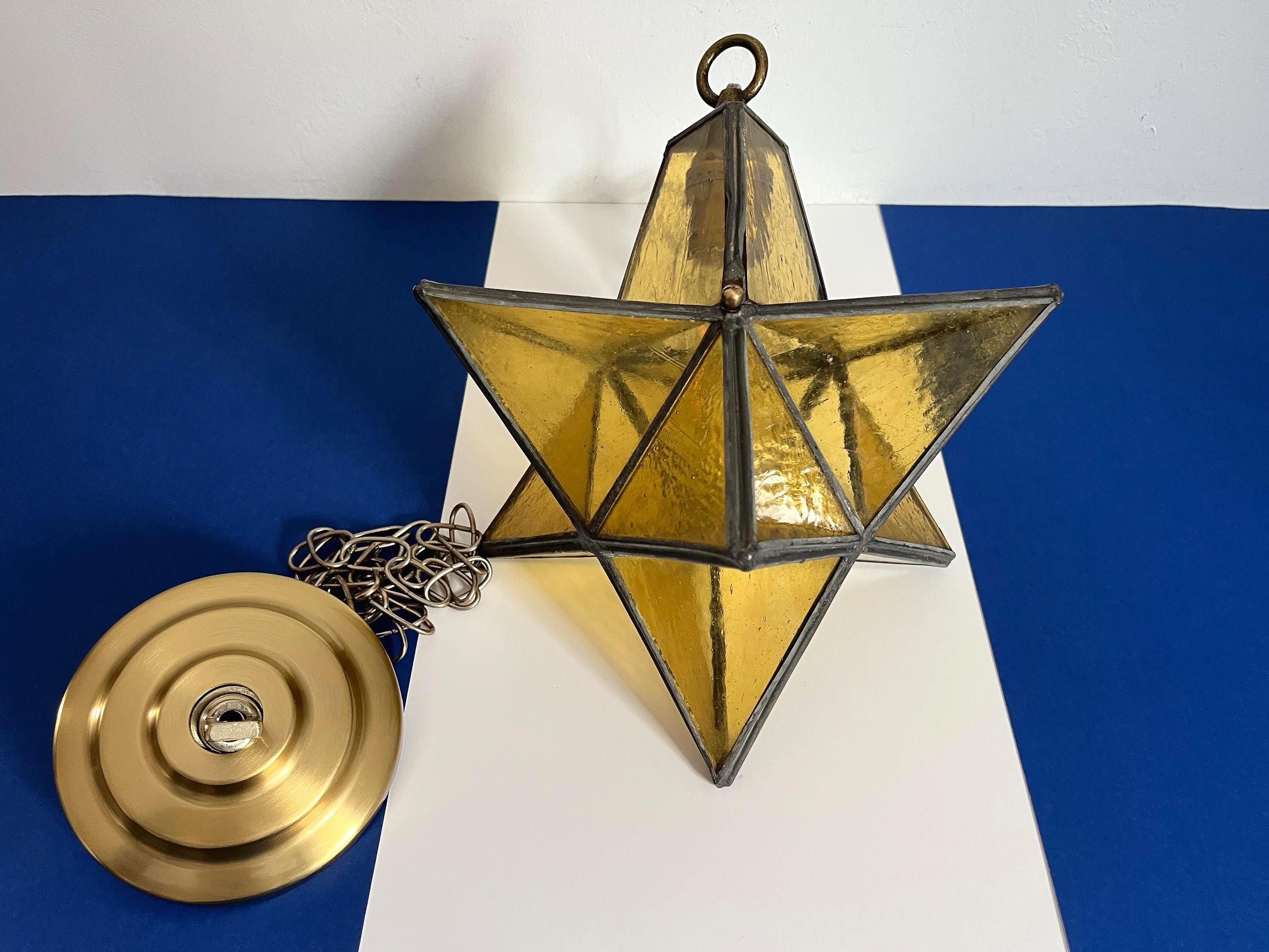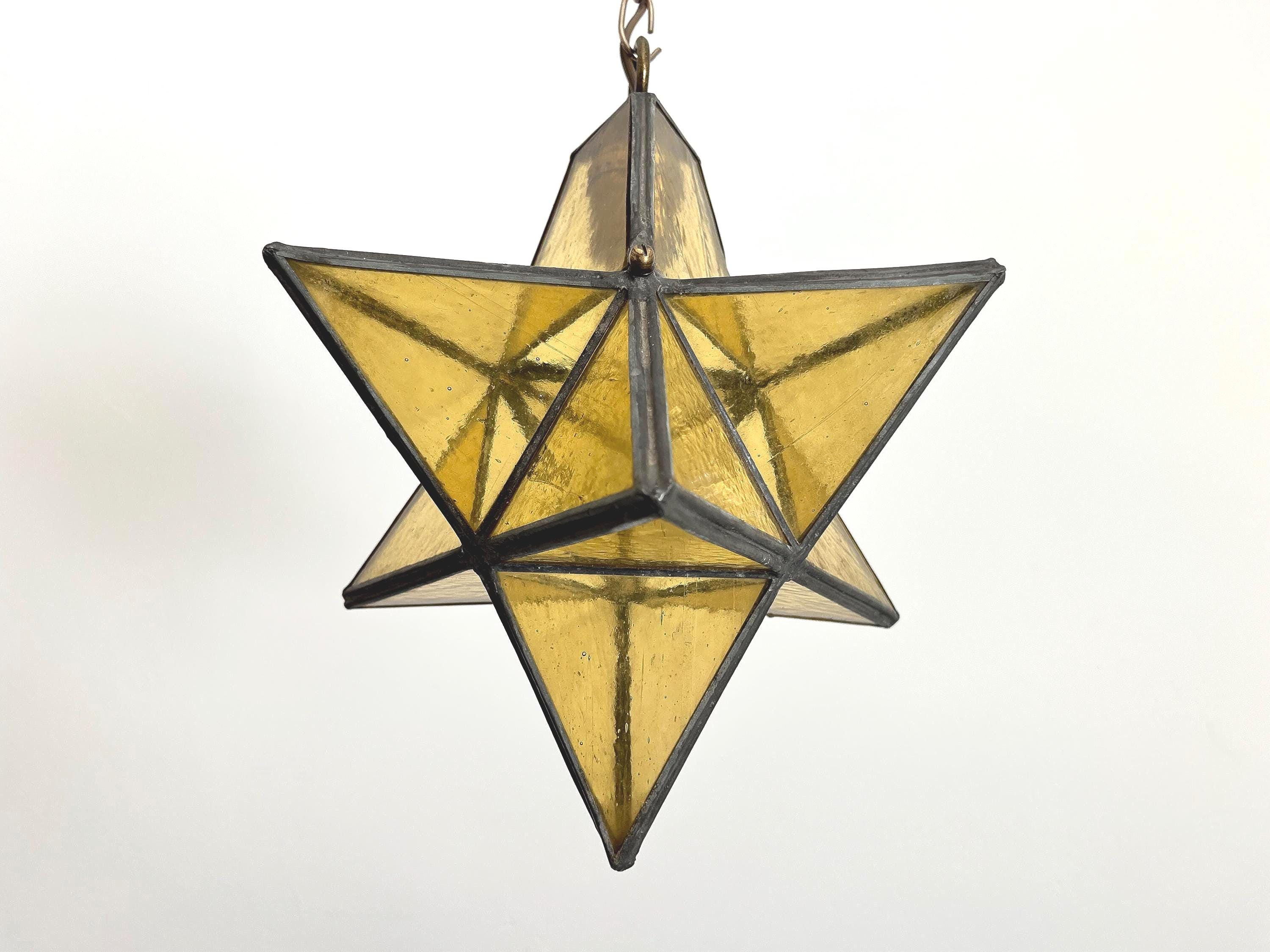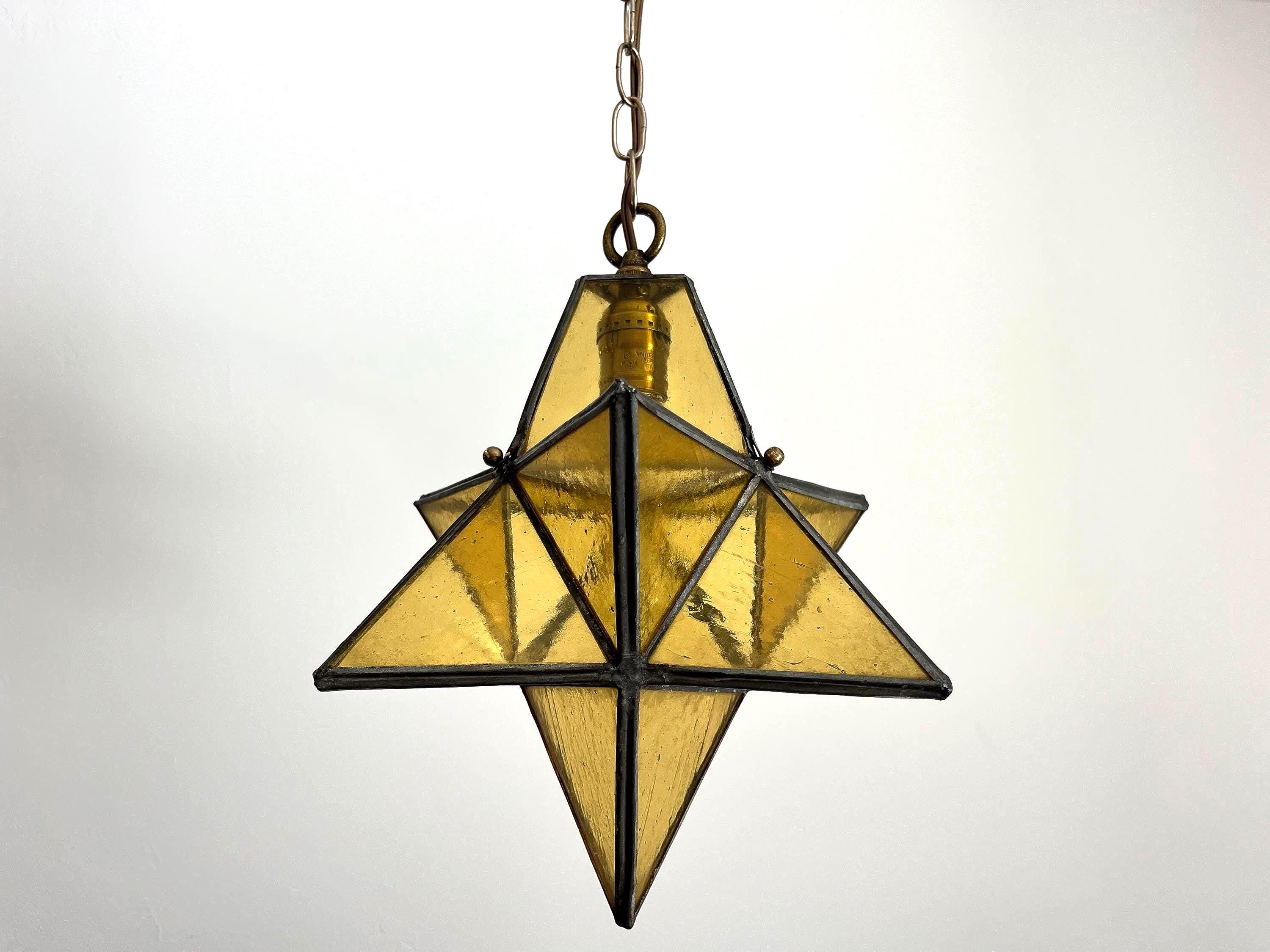 Gorgeous petite mid century honey gold seeded and striated glass pendant light in the shape of a star with zinc panels and central light. Professionally restored with new wiring and socket for standard bulb.