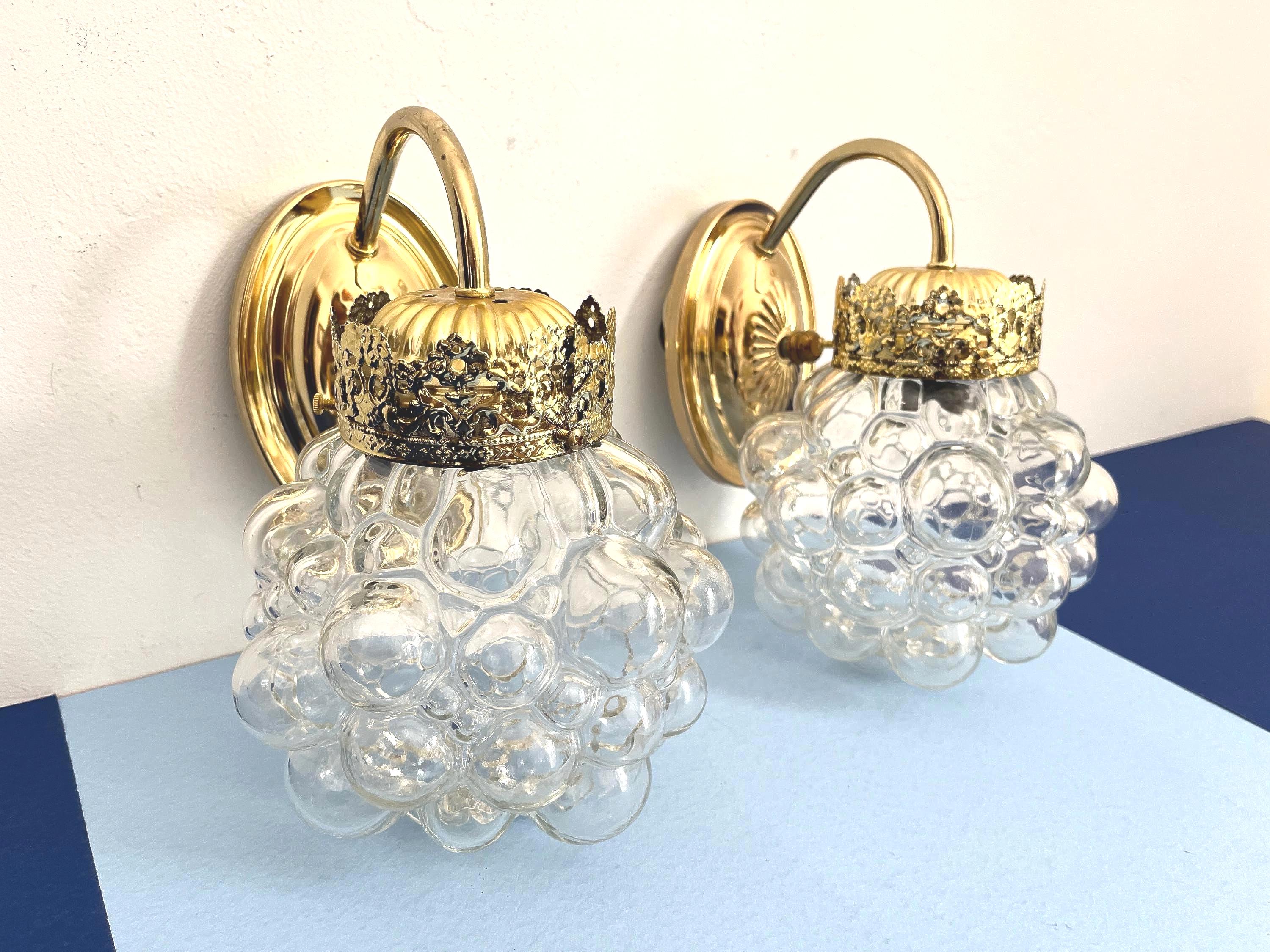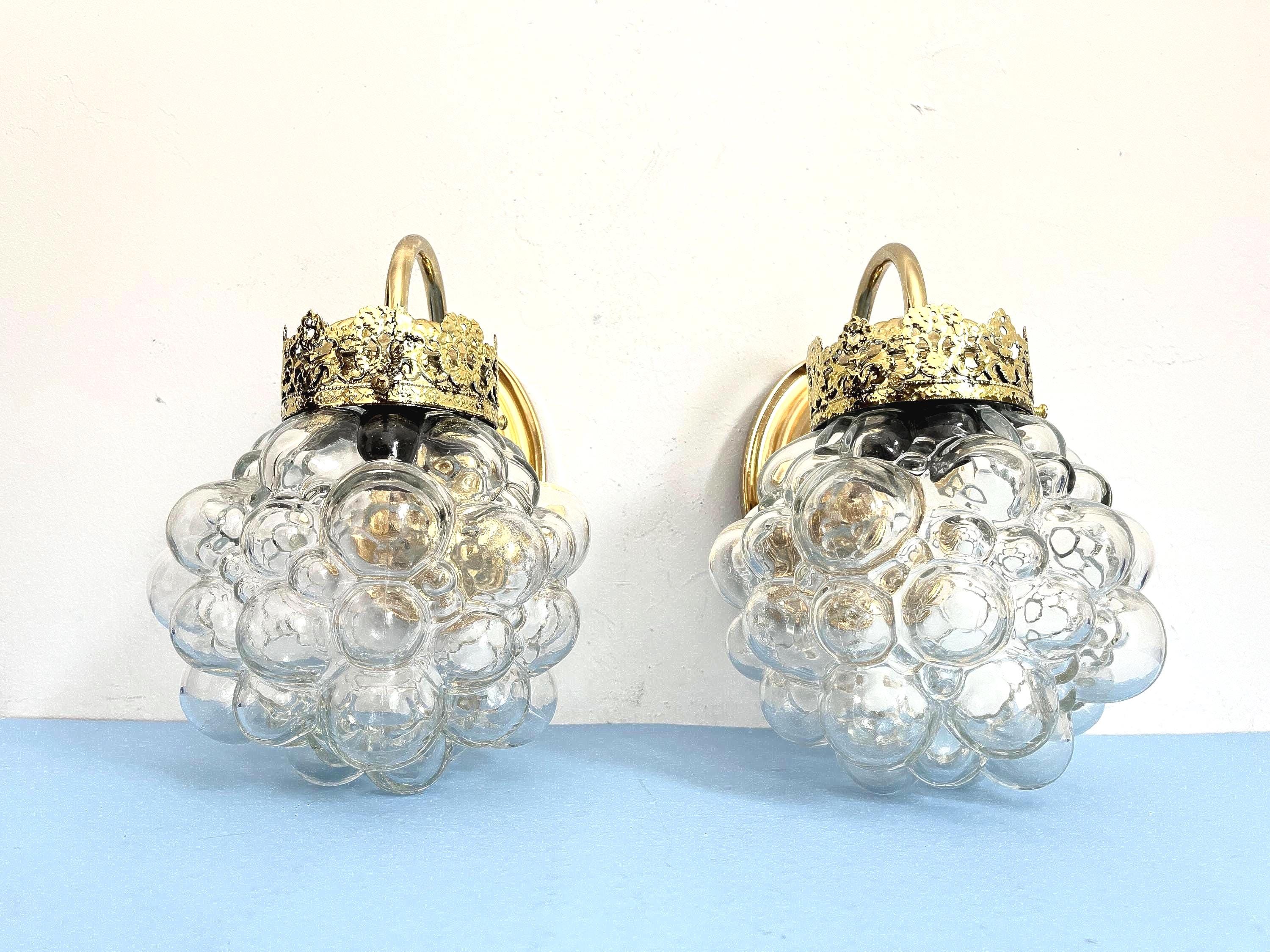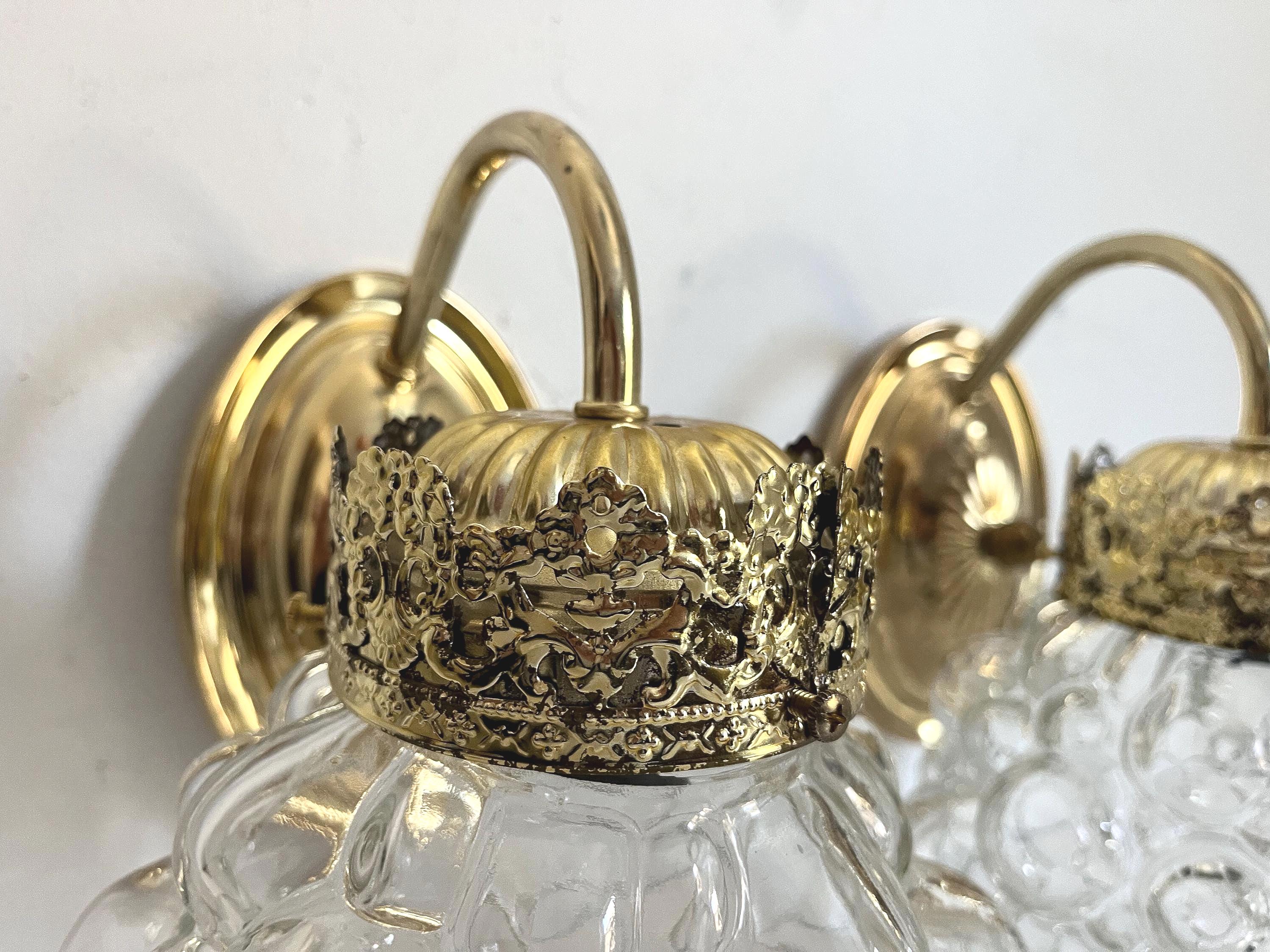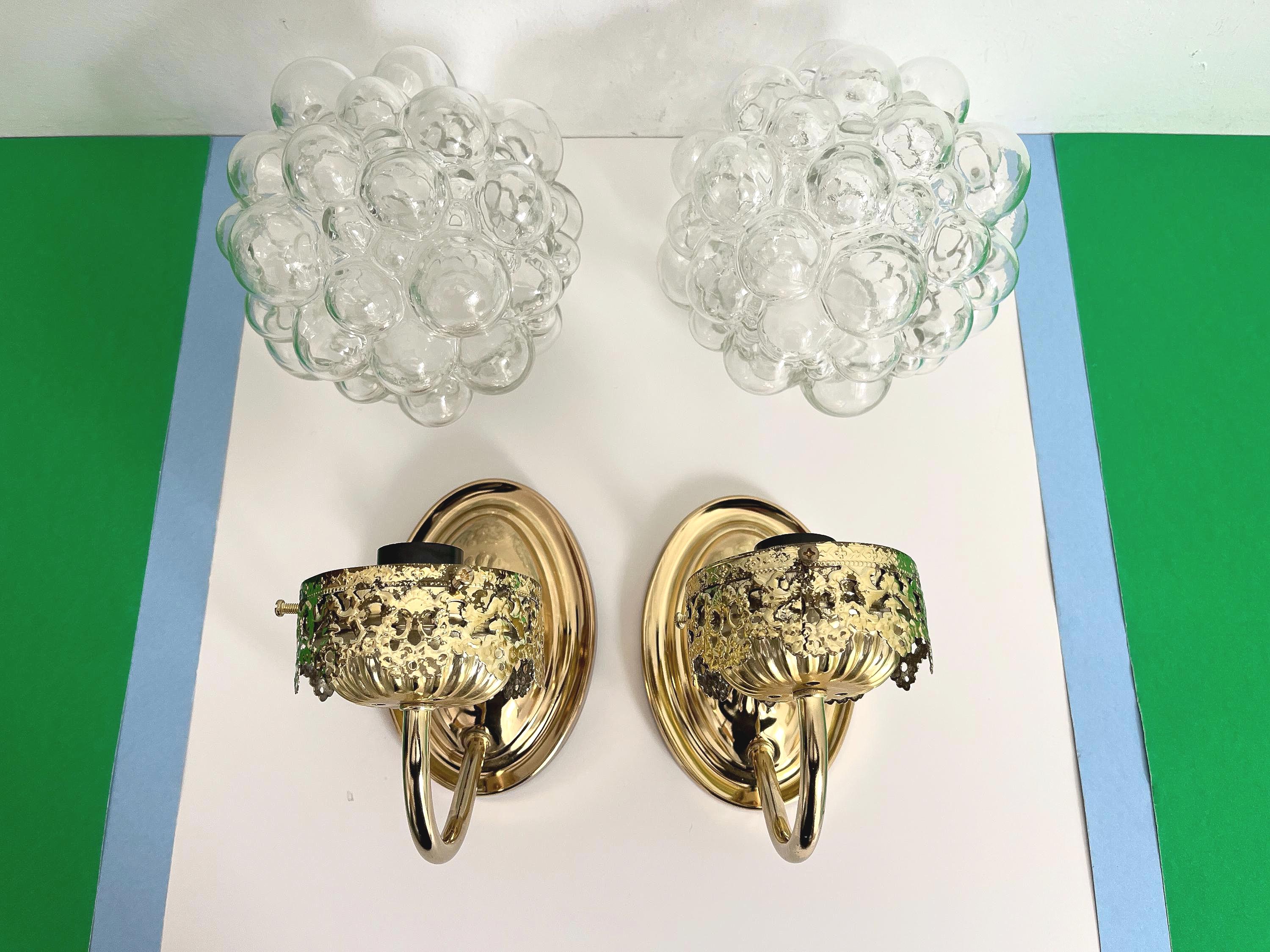 Gorgeous pair of mid century clear glass bubble sconces in the style of Helena Tynell capped by gold filigreed metal crown like tops with curvy arms and oval fan medallion back plates. Professionally restored with new wiring and sockets for standard bulbs. Come ready to install with mounting hardware.
