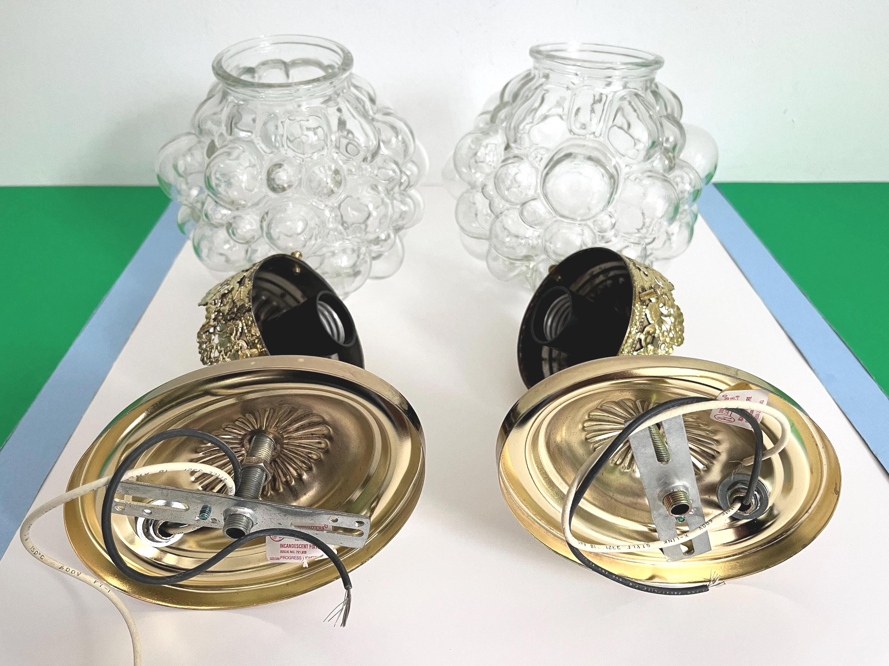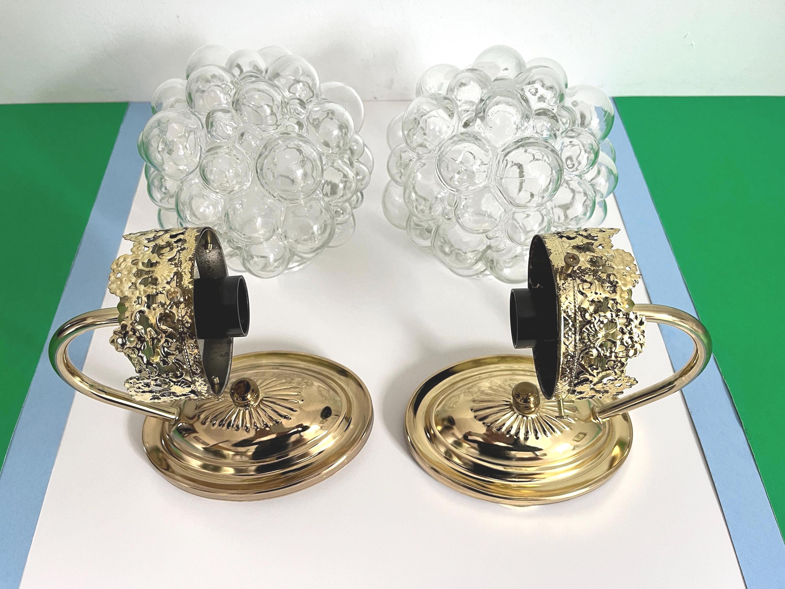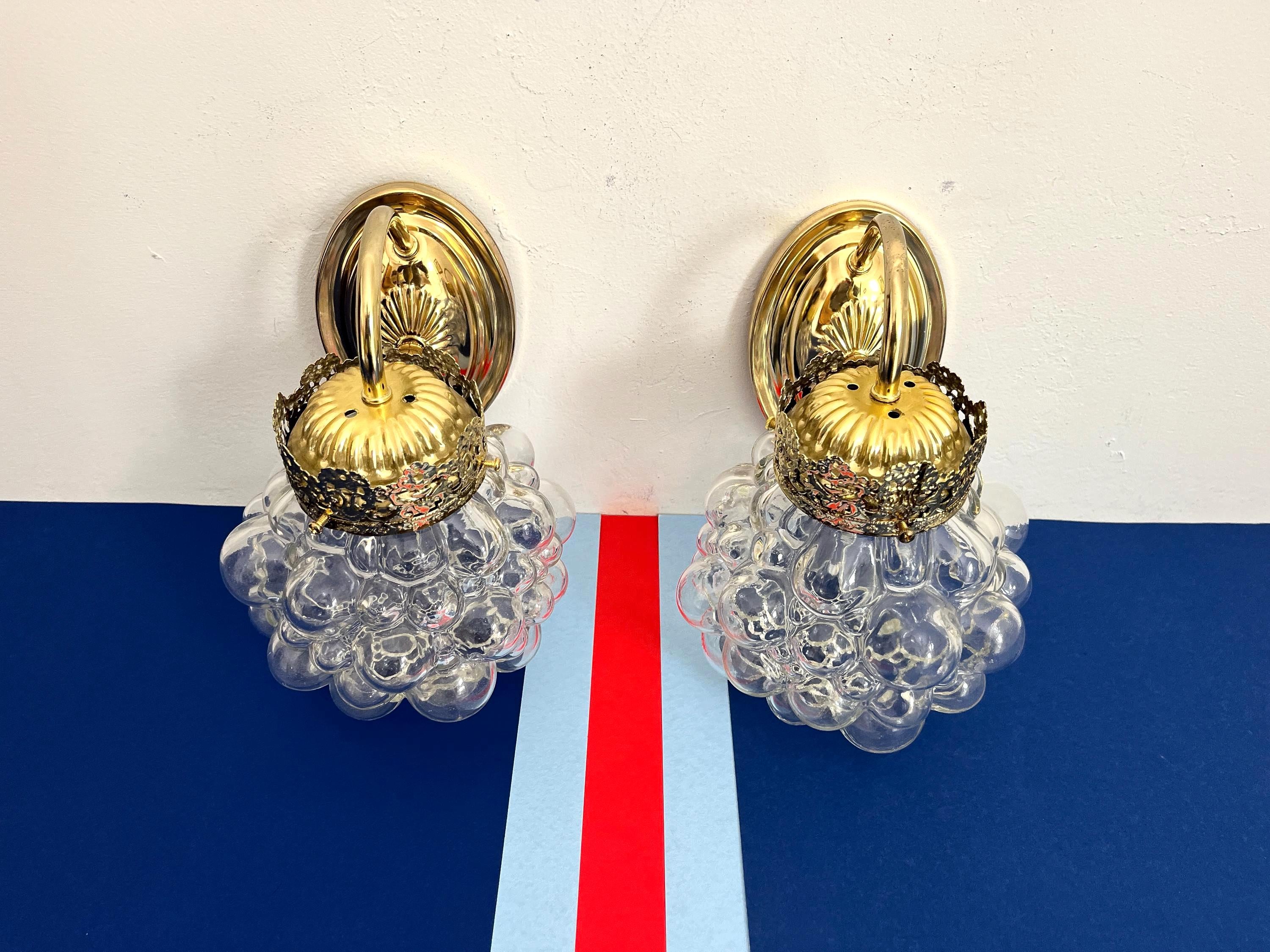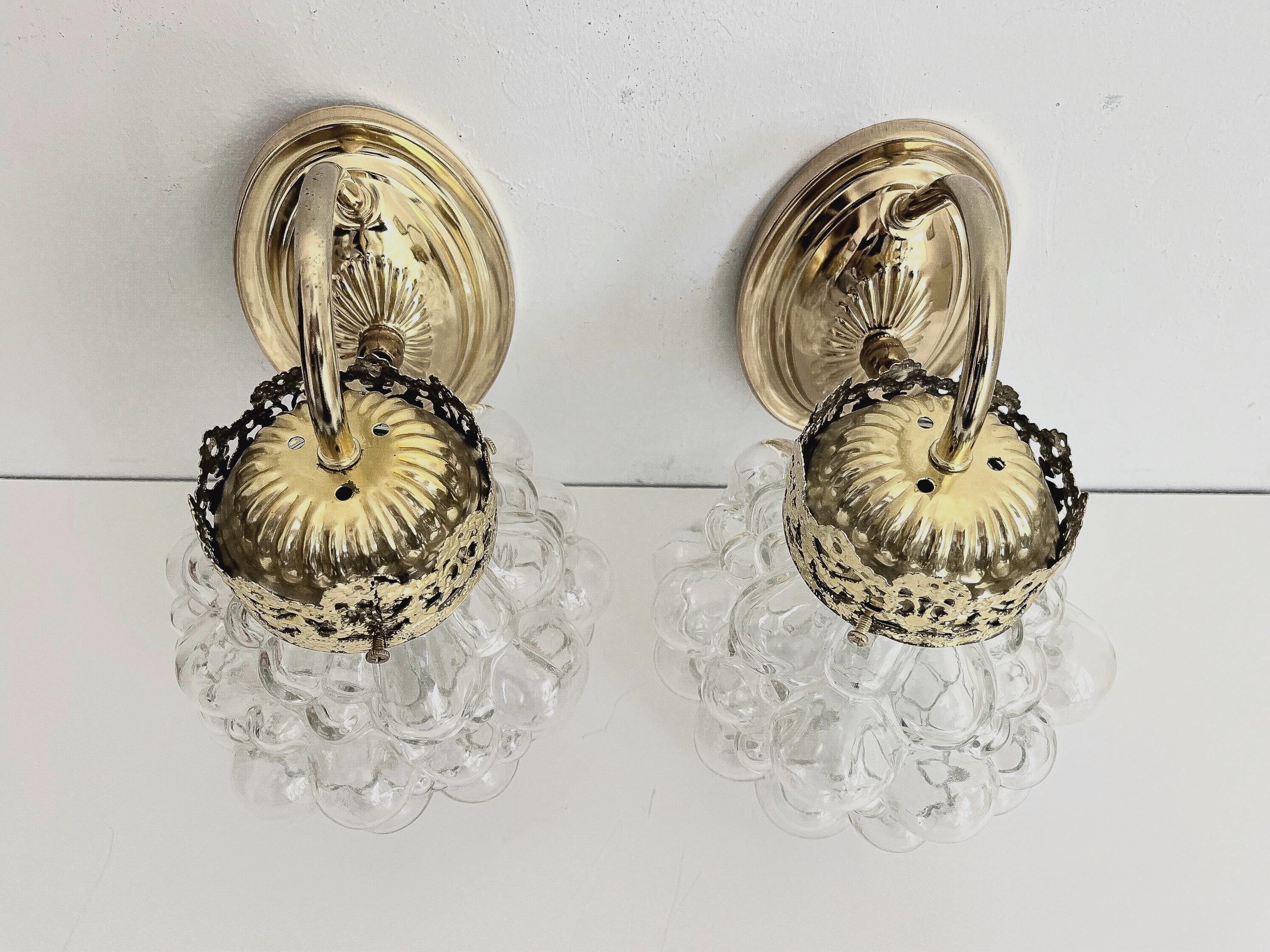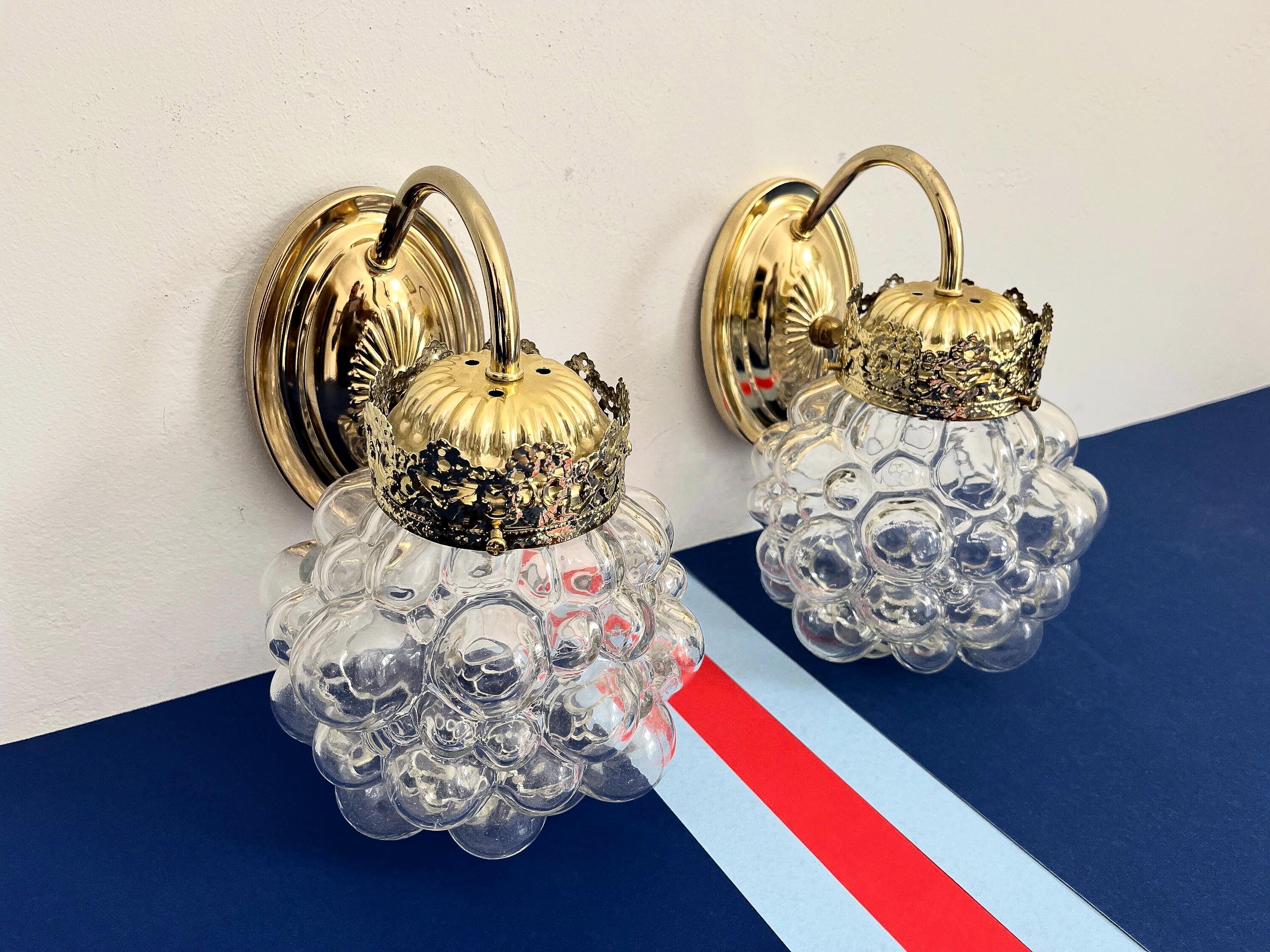 Gorgeous pair of mid century clear glass bubble sconces in the style of Helena Tynell capped by gold filigreed metal crown like tops with curvy arms and oval fan medallion back plates. Professionally restored with new wiring and sockets for standard bulbs. Come ready to install with mounting hardware.