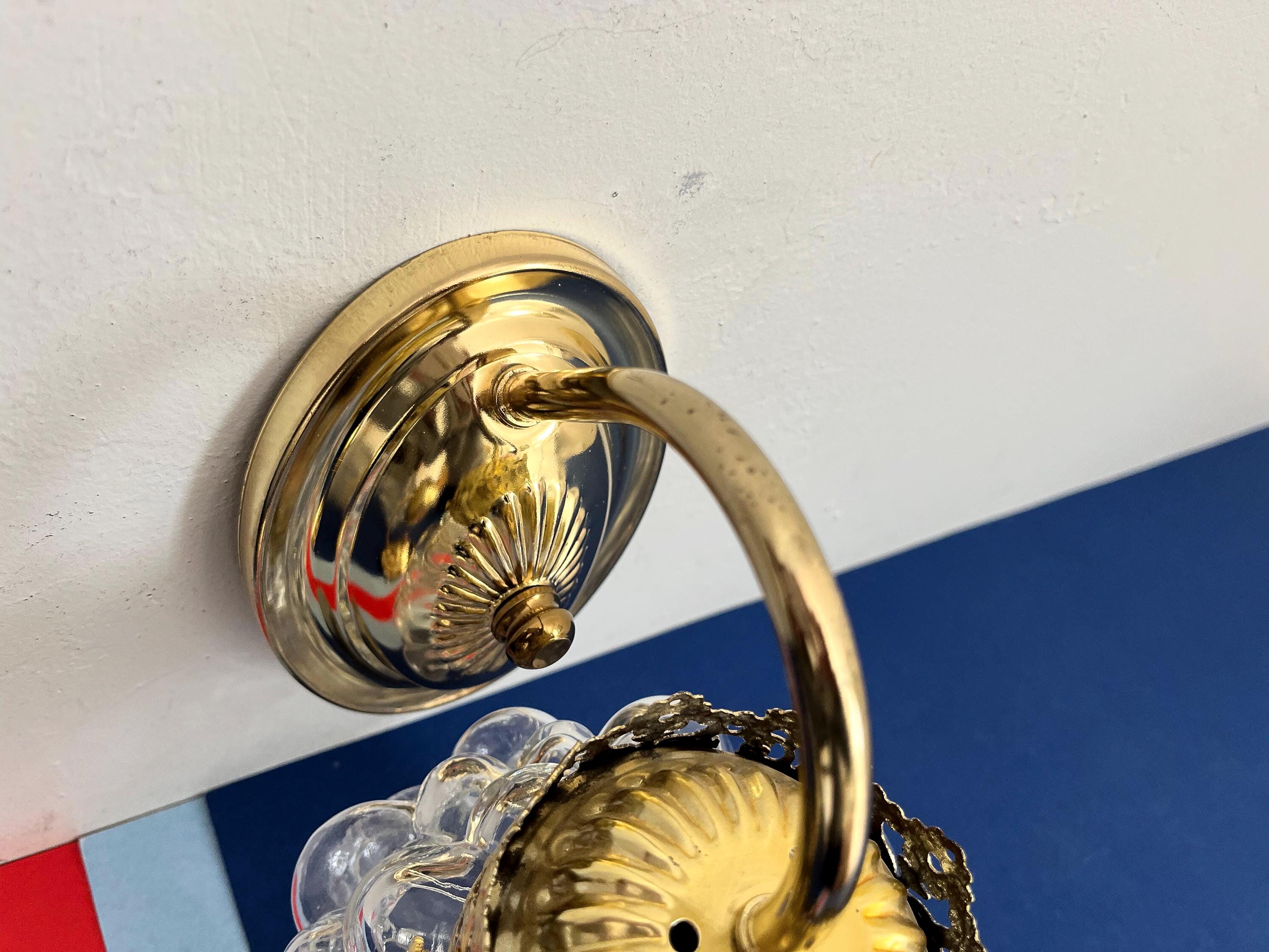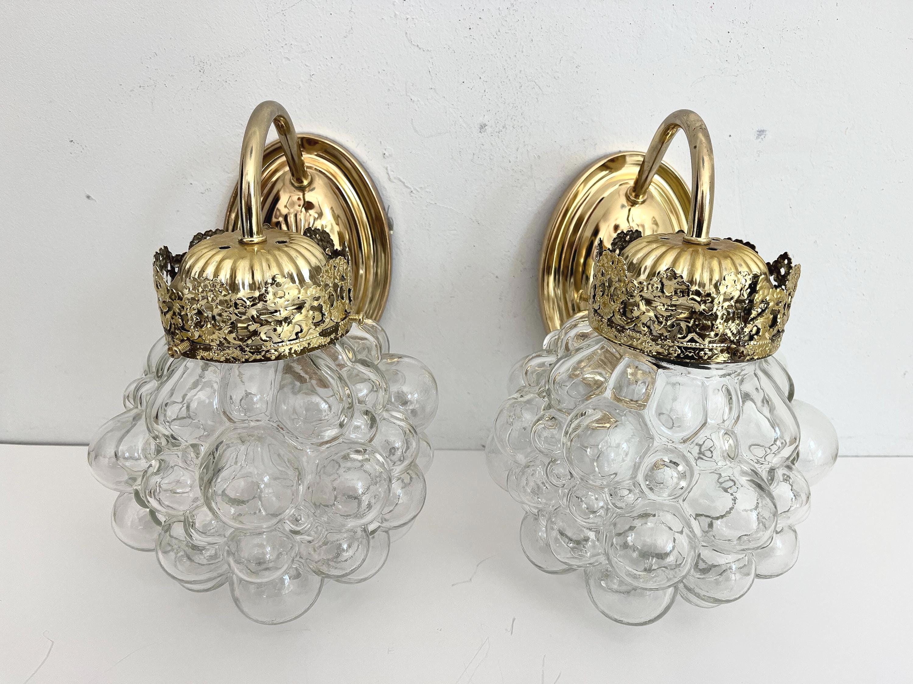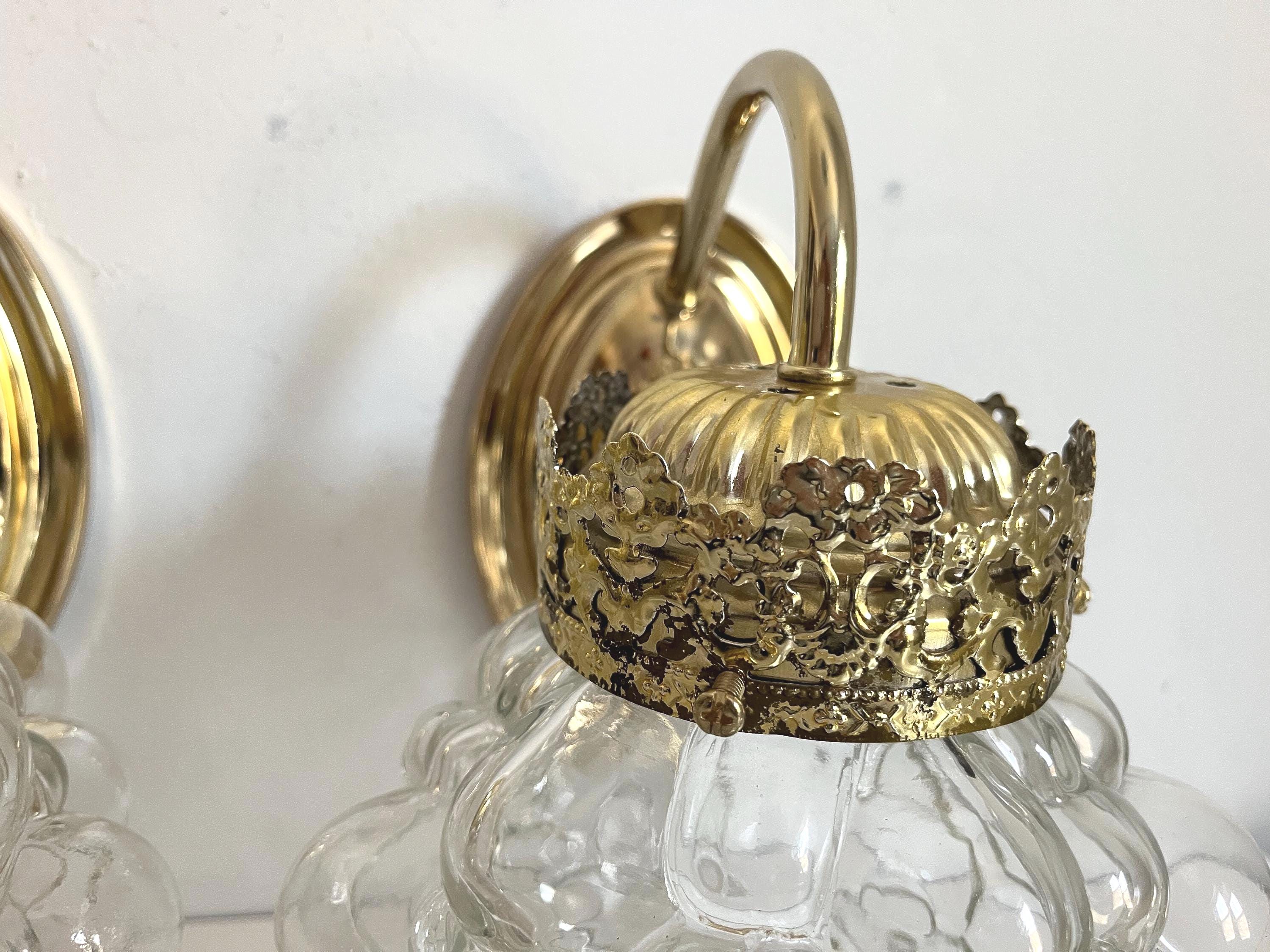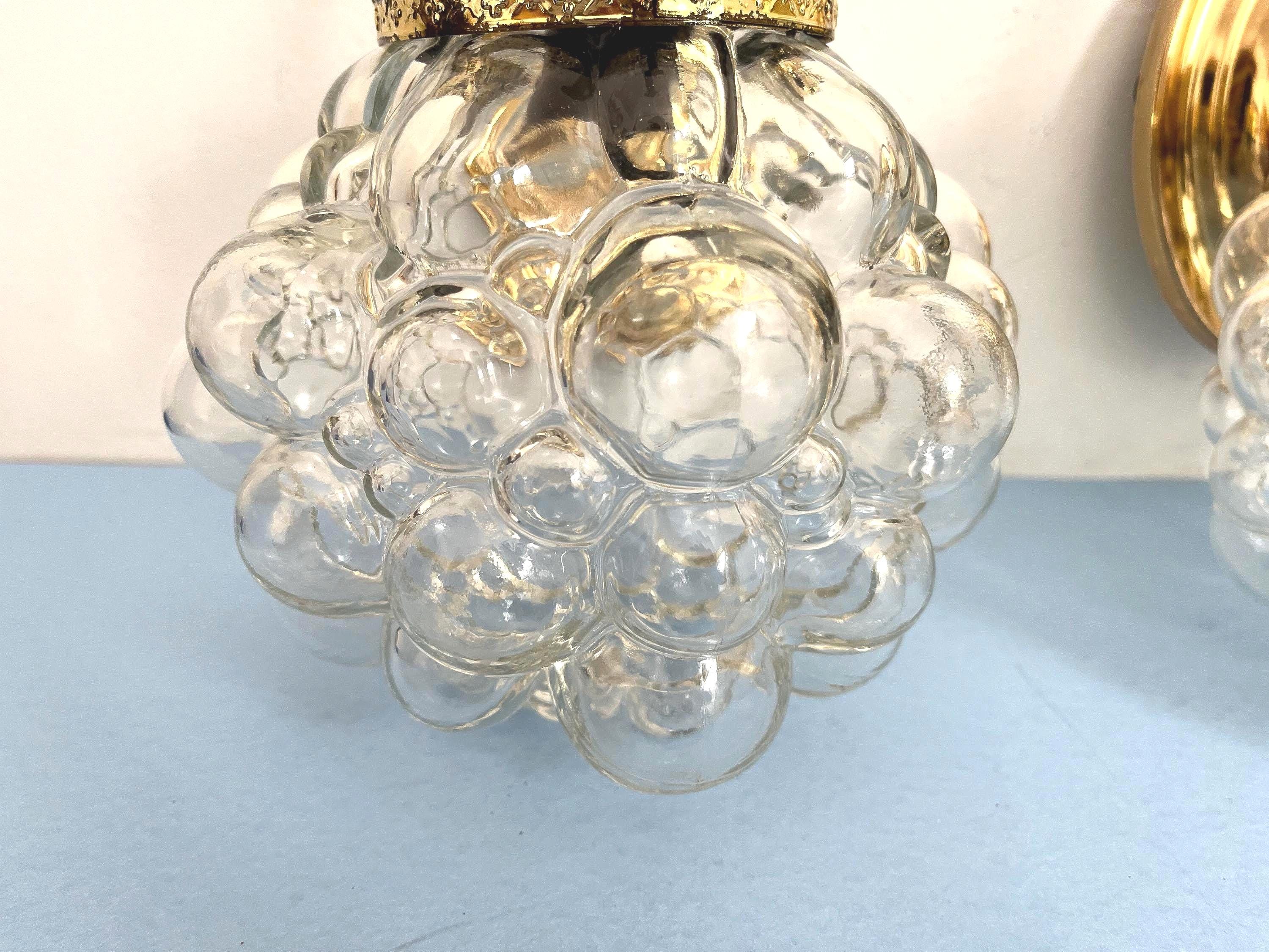Gorgeous pair of mid century clear glass bubble sconces in the style of Helena Tynell capped by gold filigreed metal crown like tops with curvy arms and oval fan medallion back plates. Professionally restored with new wiring and sockets for standard bulbs. Come ready to install with mounting hardware.