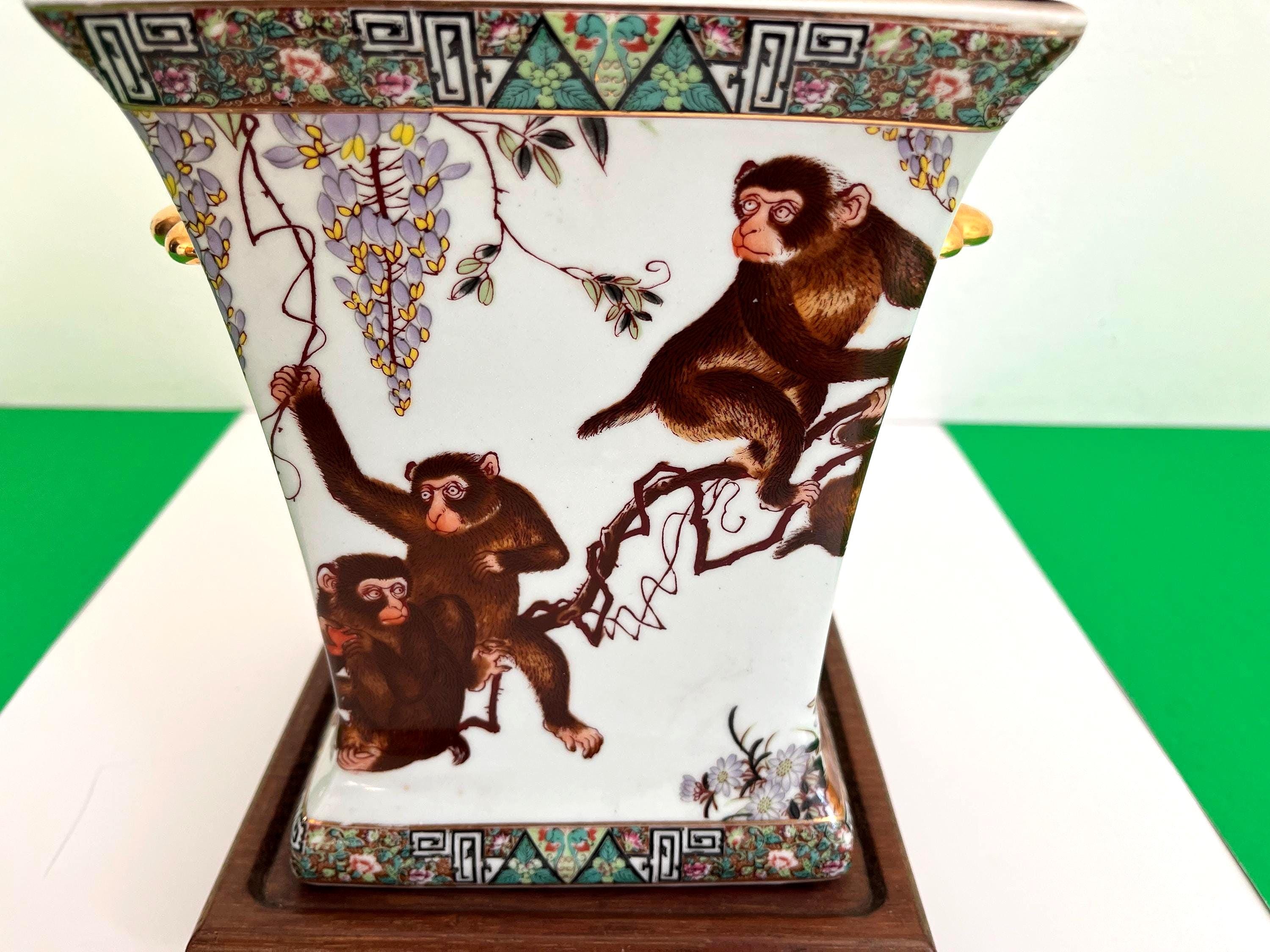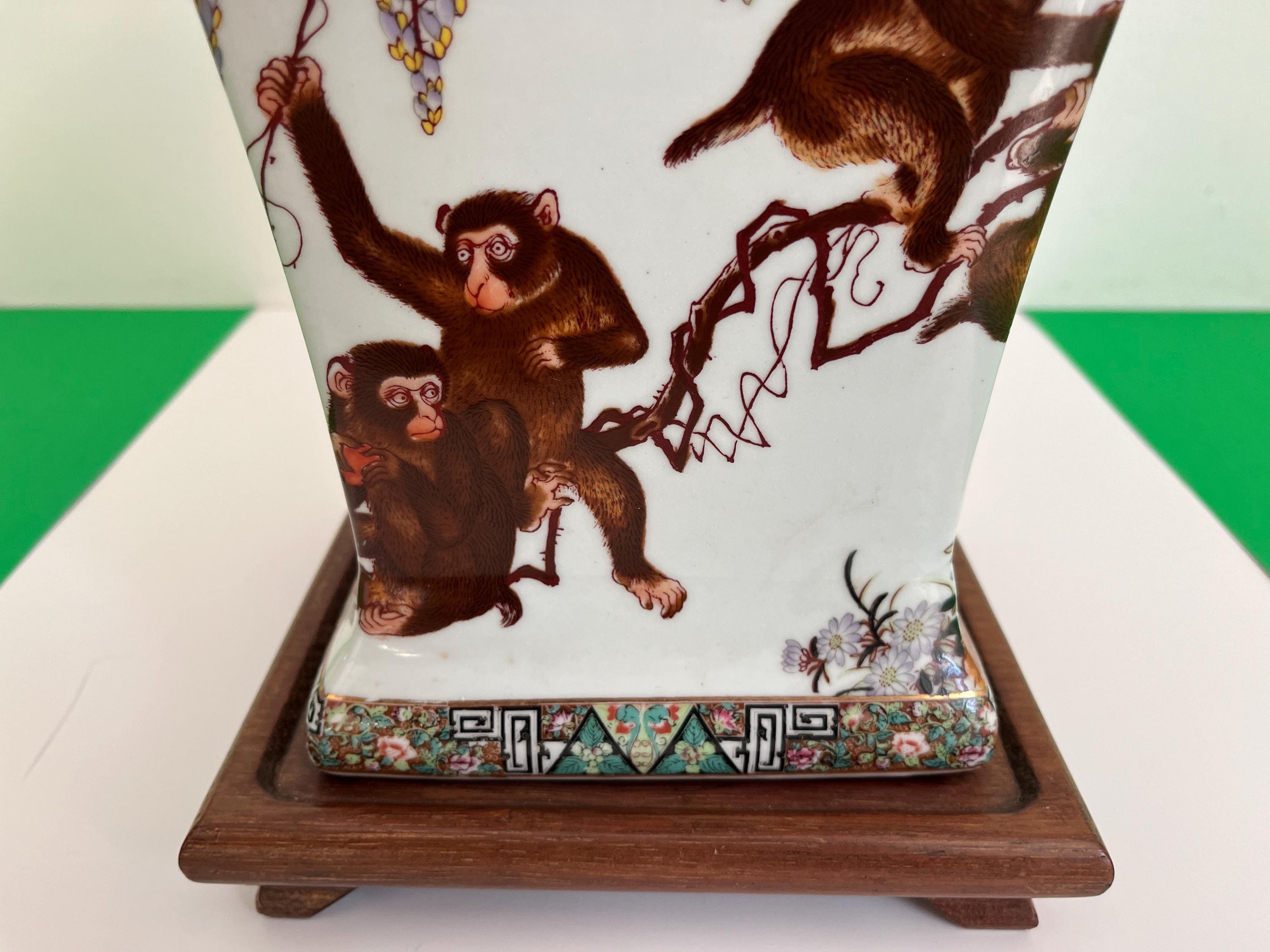Monkeys in Chinese porcelain design symbolize good fortune, intelligence, protection, and longevity drawing from the legend of the Monkey King. Jars like these were prevalent and popular in the 1940s/50s.