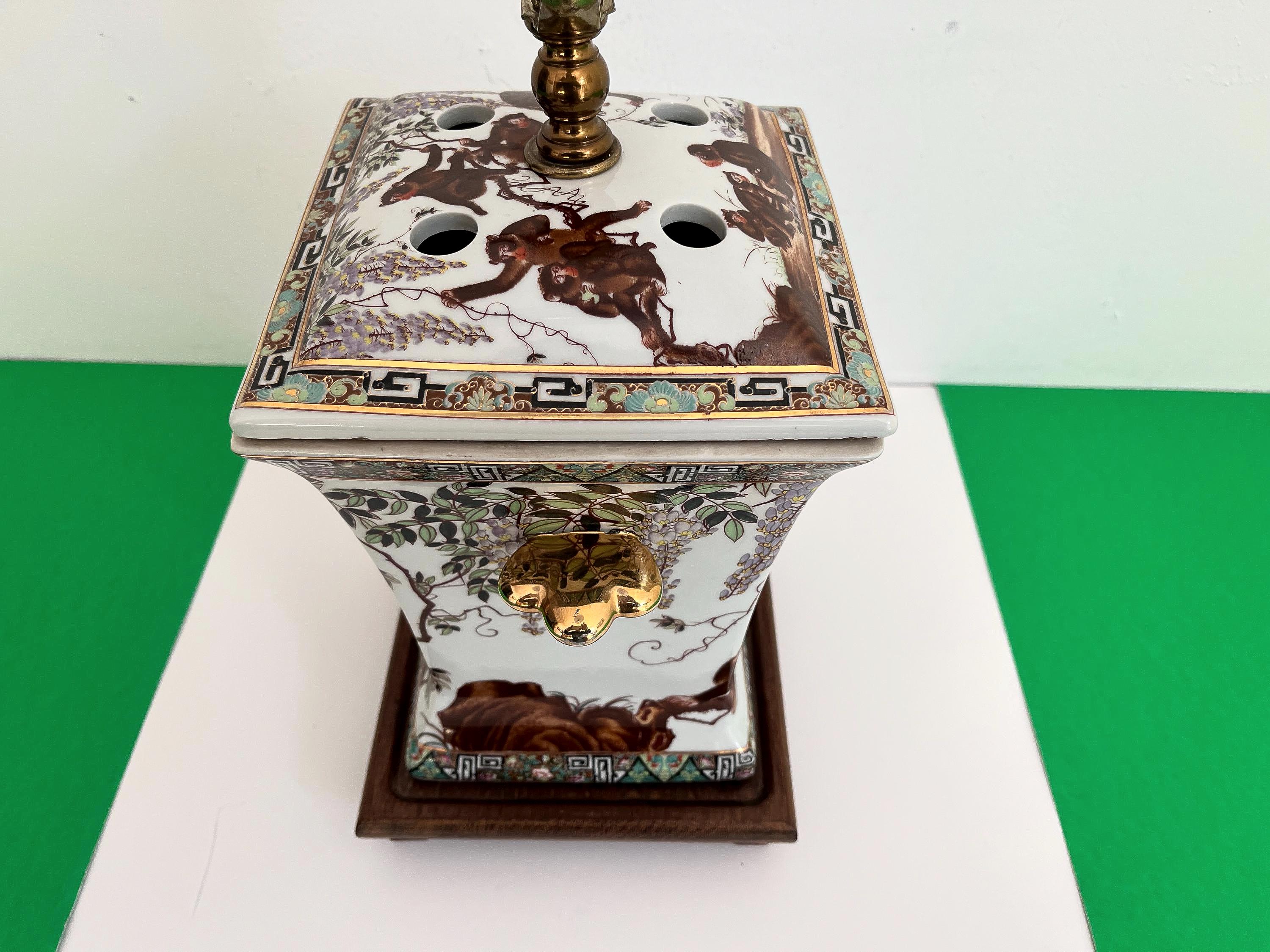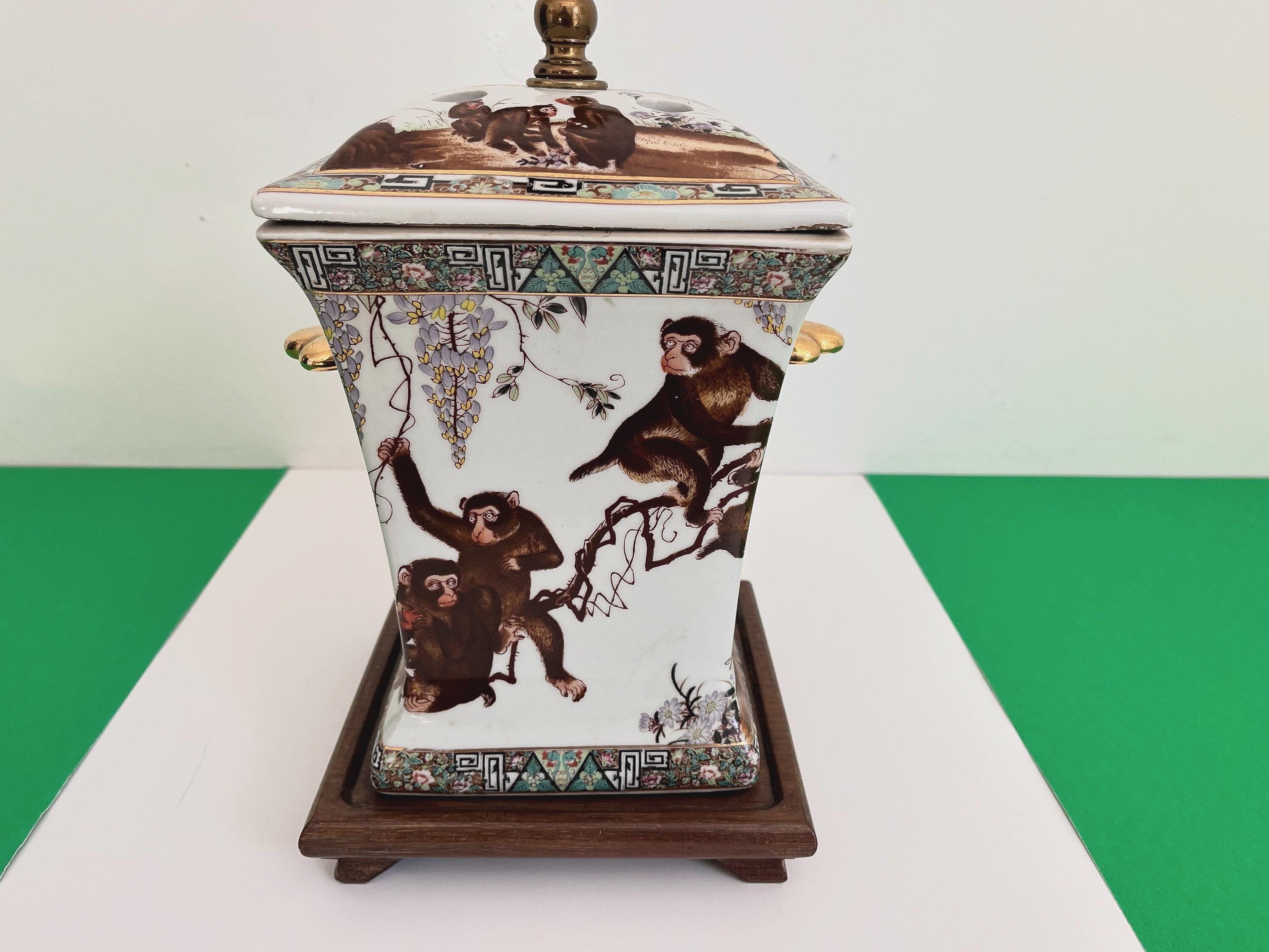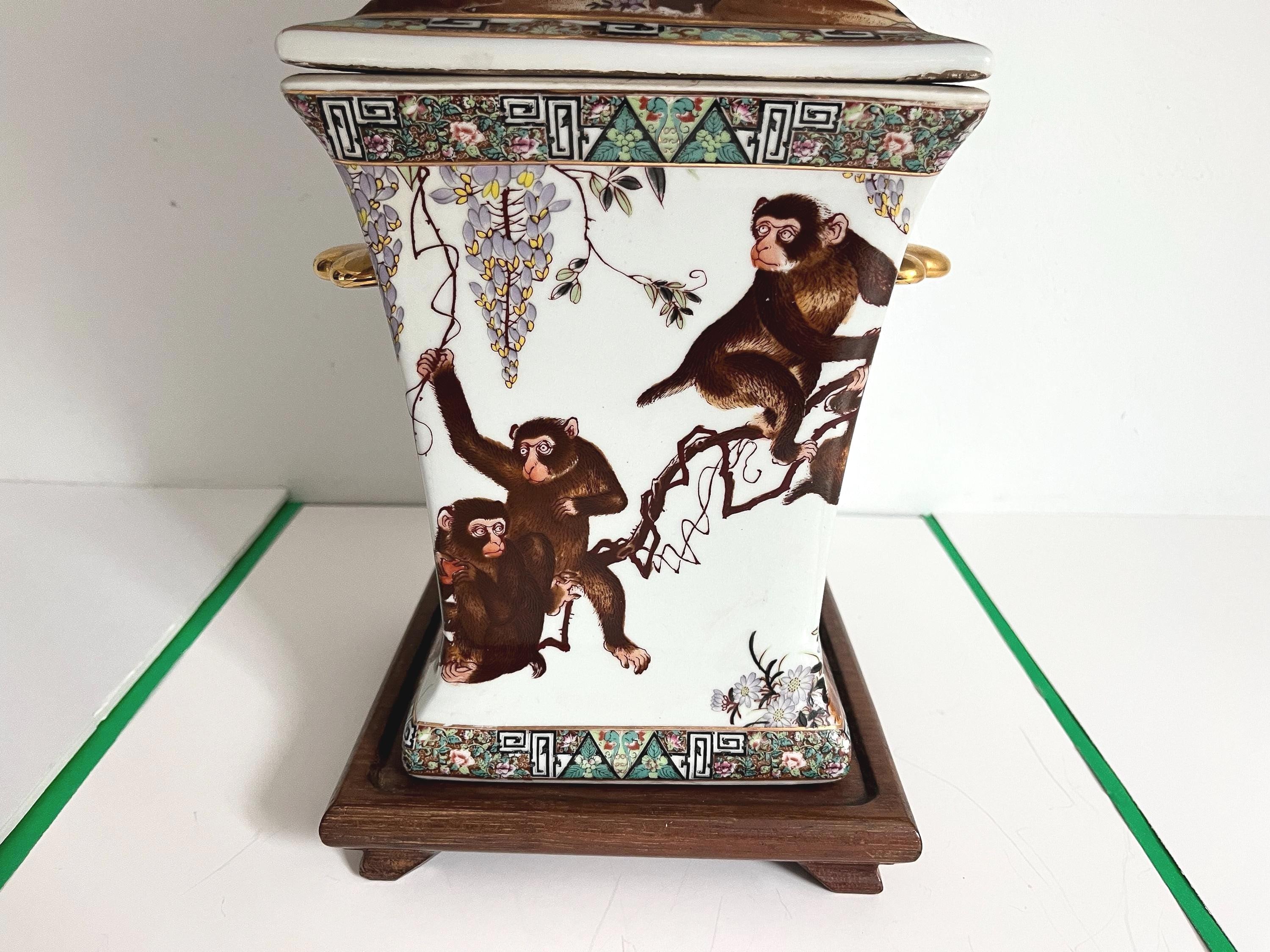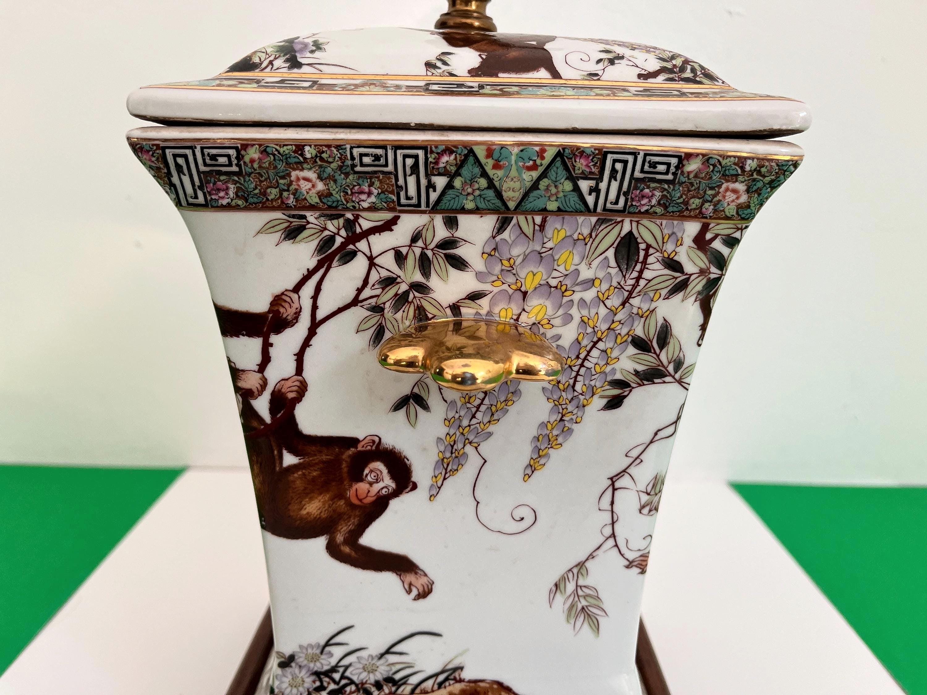 Gorgeous large lidded porcelain jar lamp hand painted with a whimsical family of monkeys climbing flowering vines accented by gold scalloped handles and colorful borders of Egyptian pyramids and Greek Key motifs. Professionally restored with new wiring and socket for standard bulb.