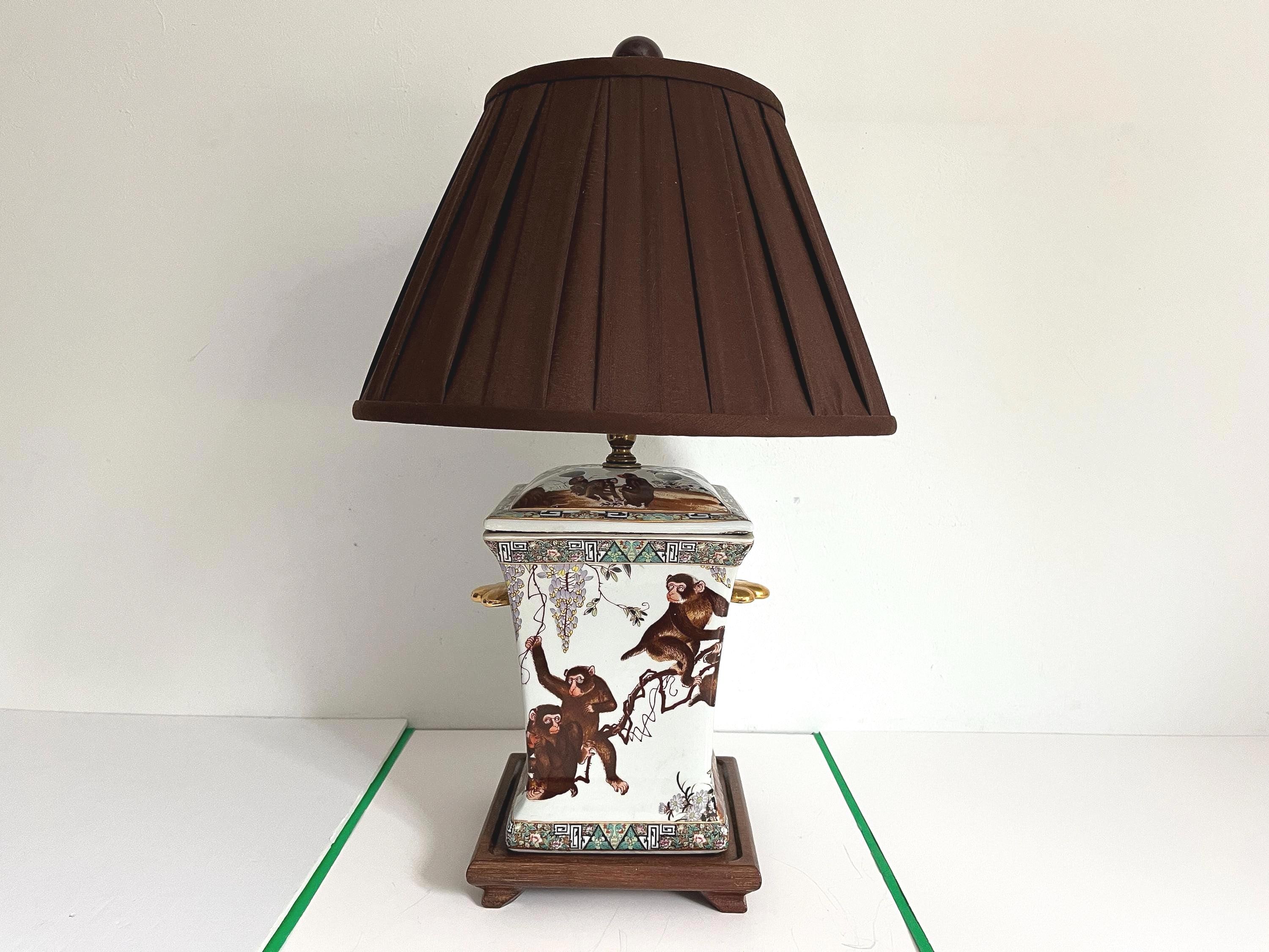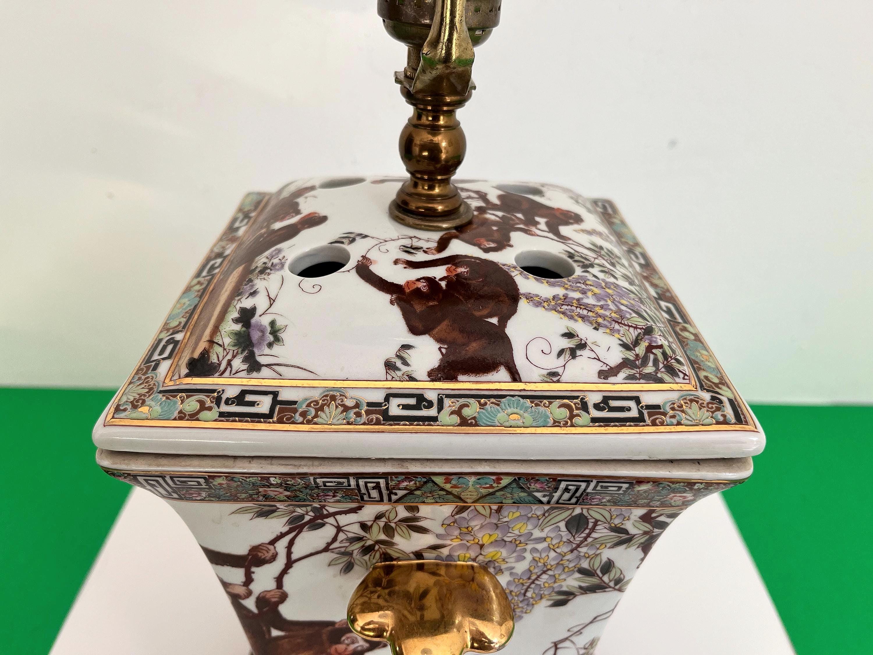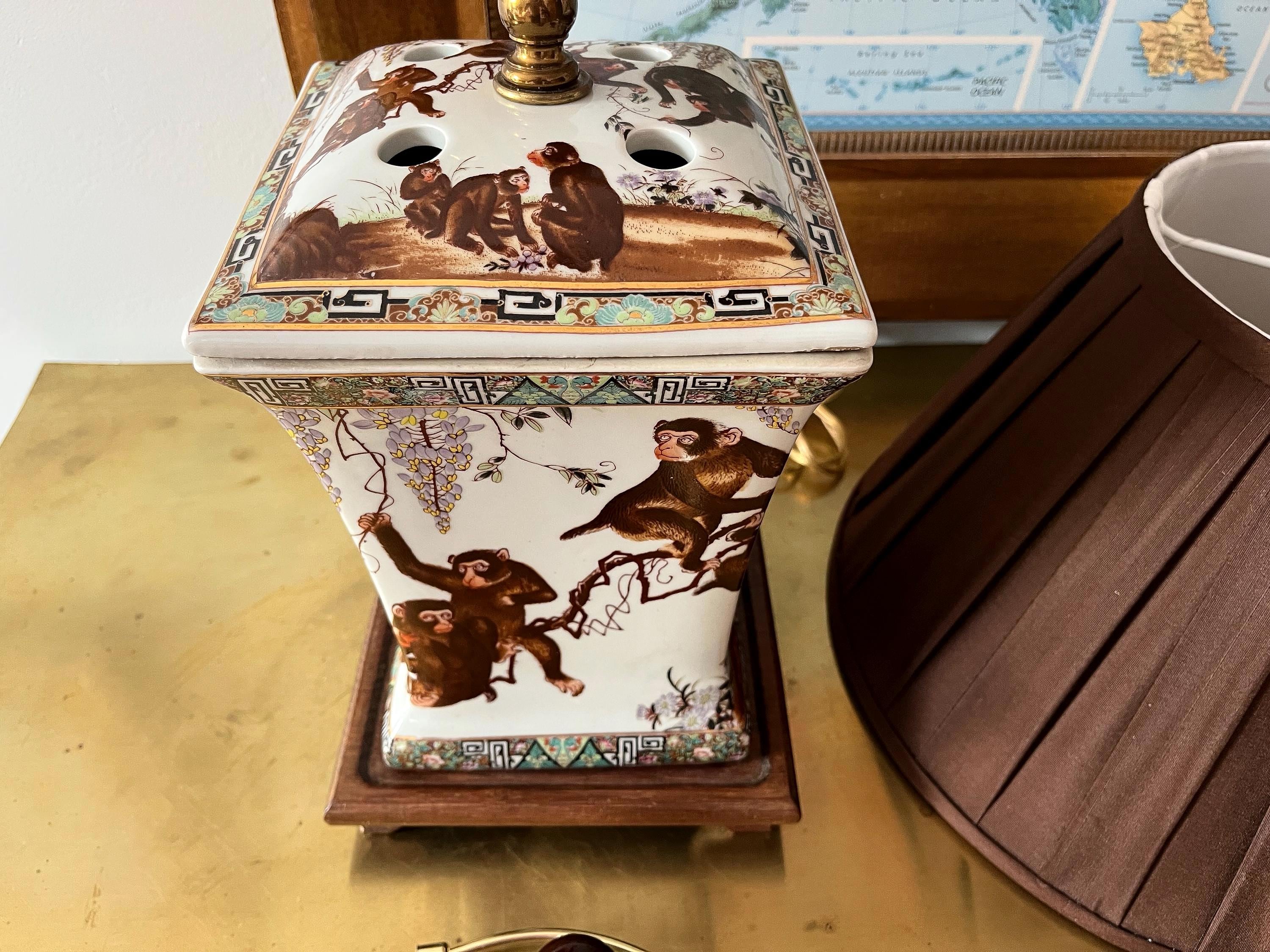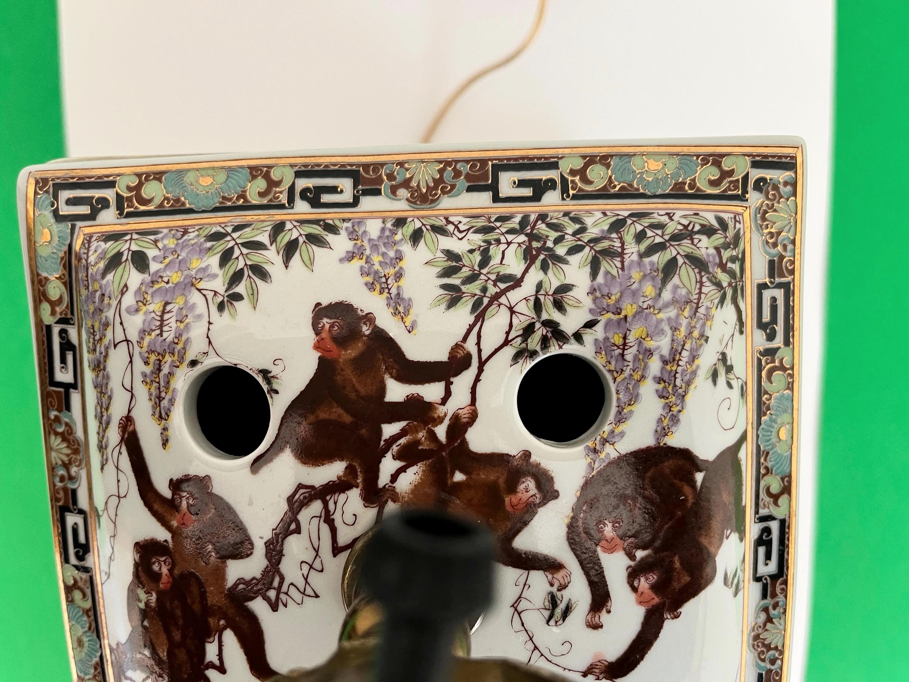 Gorgeous large lidded porcelain jar lamp hand painted with a whimsical family of monkeys climbing flowering vines accented by gold scalloped handles and colorful borders of Egyptian pyramids and Greek Key motifs. Professionally restored with new wiring and socket for standard bulb.