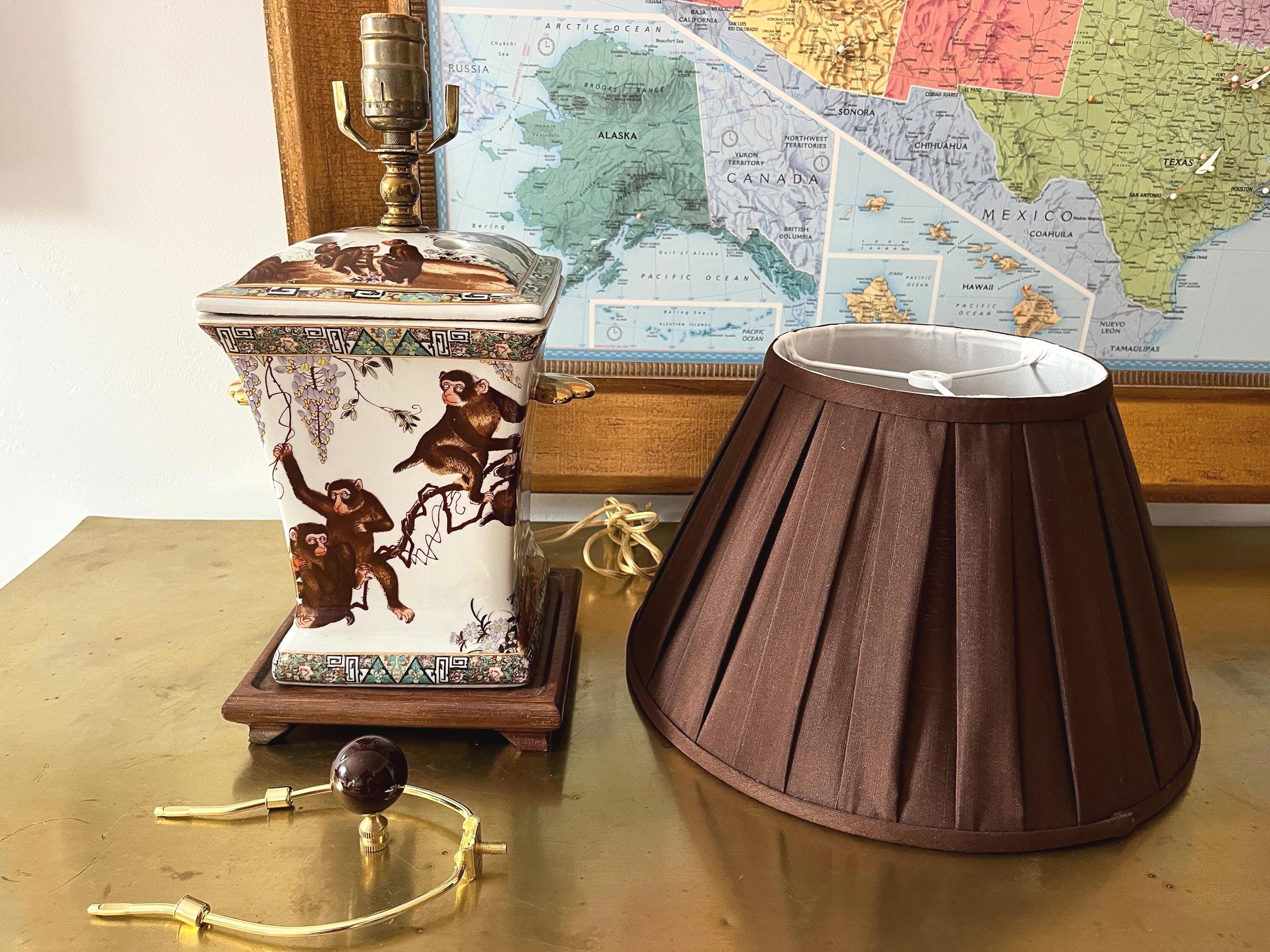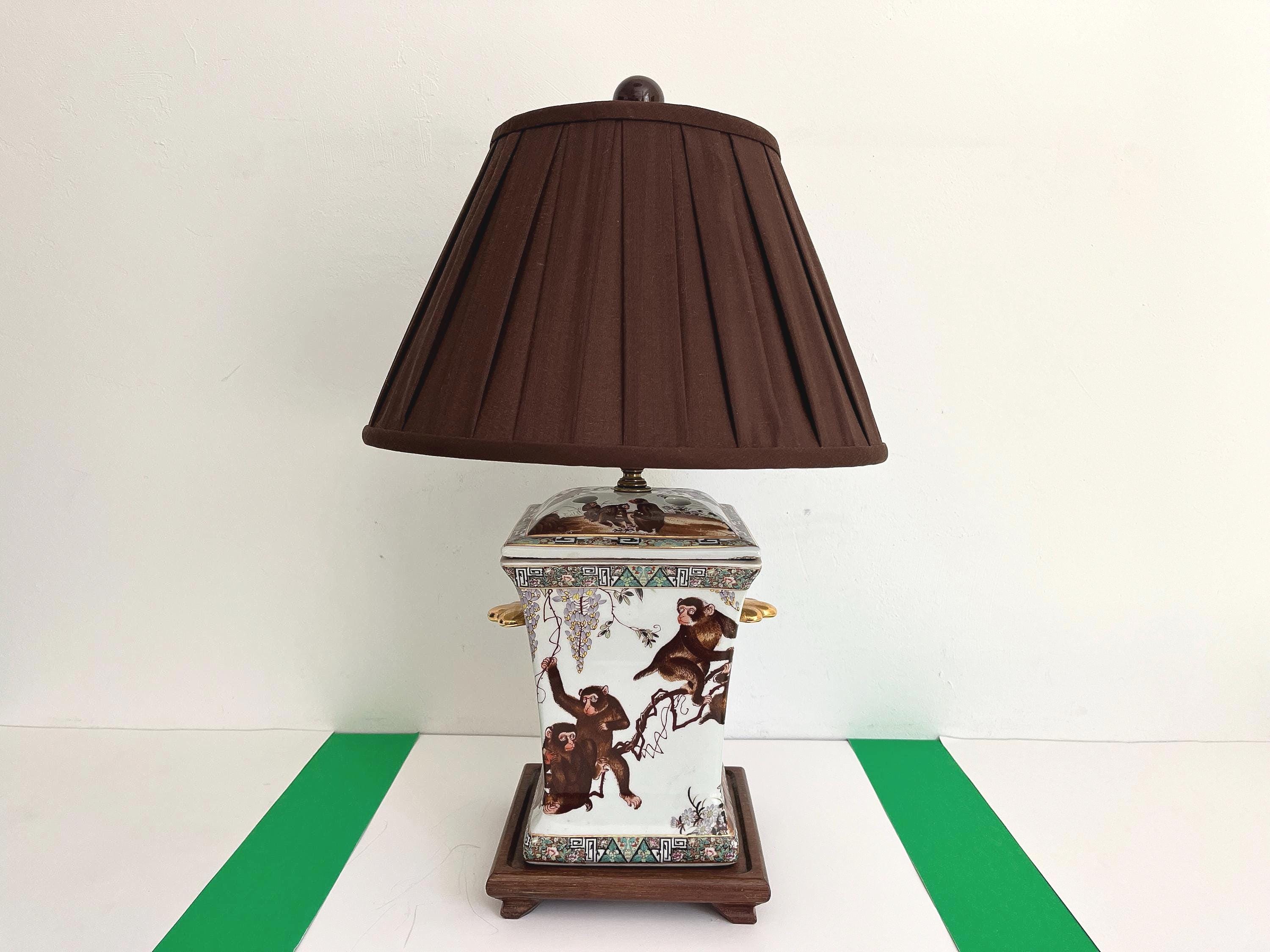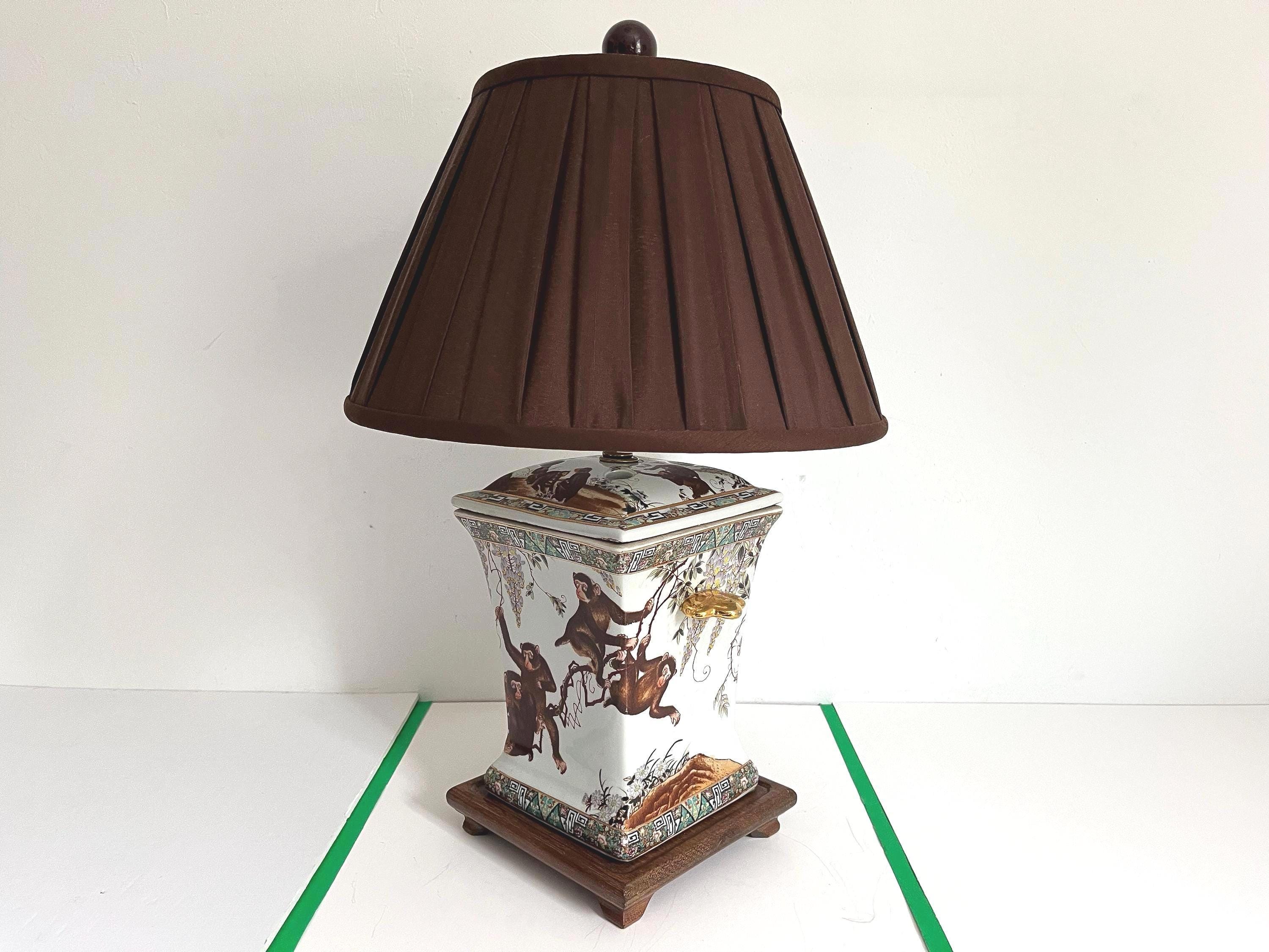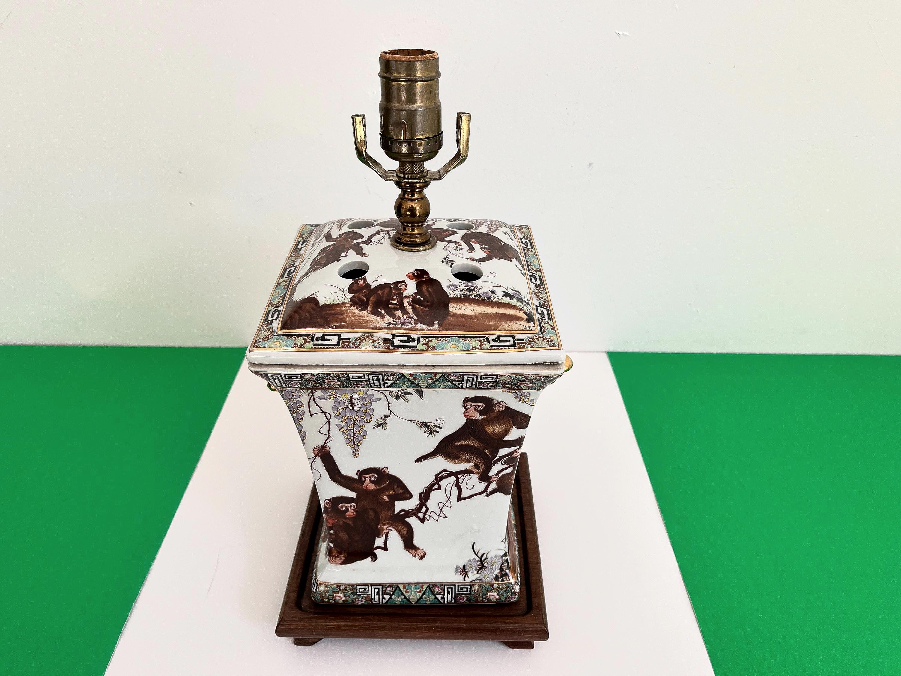 Gorgeous large lidded porcelain jar lamp hand painted with a whimsical family of monkeys climbing flowering vines accented by gold scalloped handles and colorful borders of Egyptian pyramids and Greek Key motifs. Professionally restored with new wiring and socket for standard bulb.