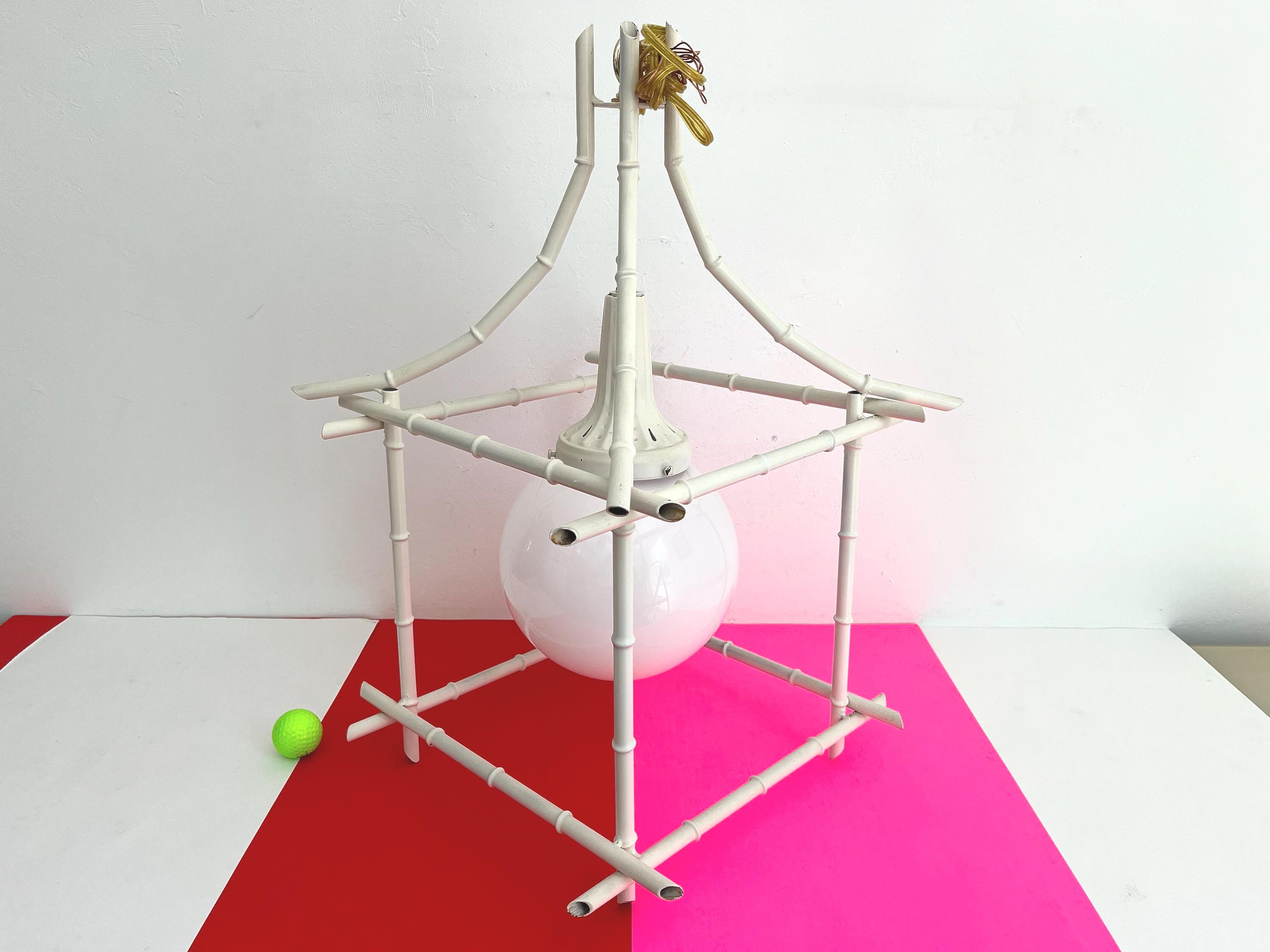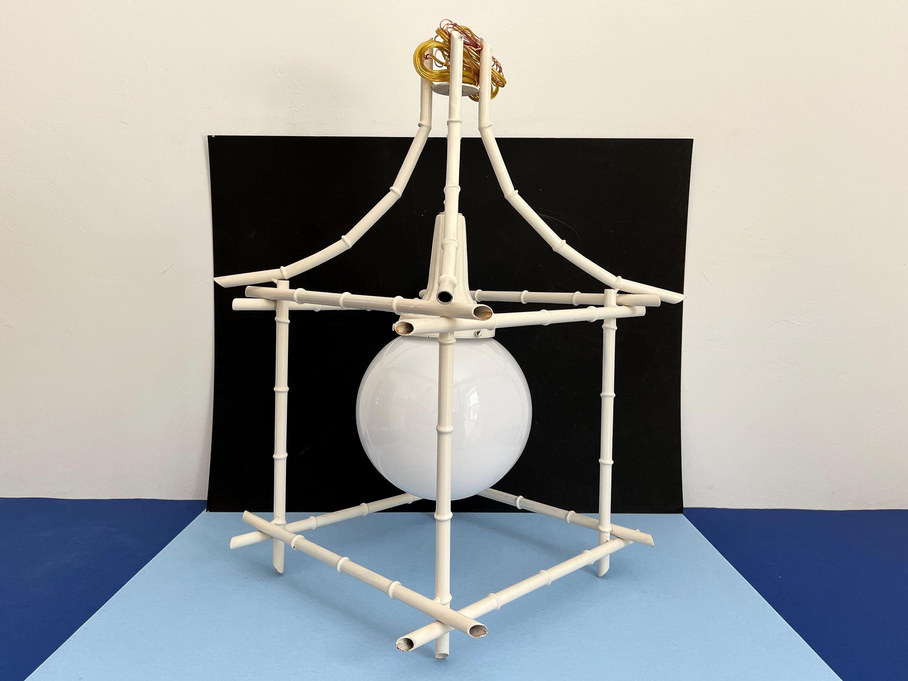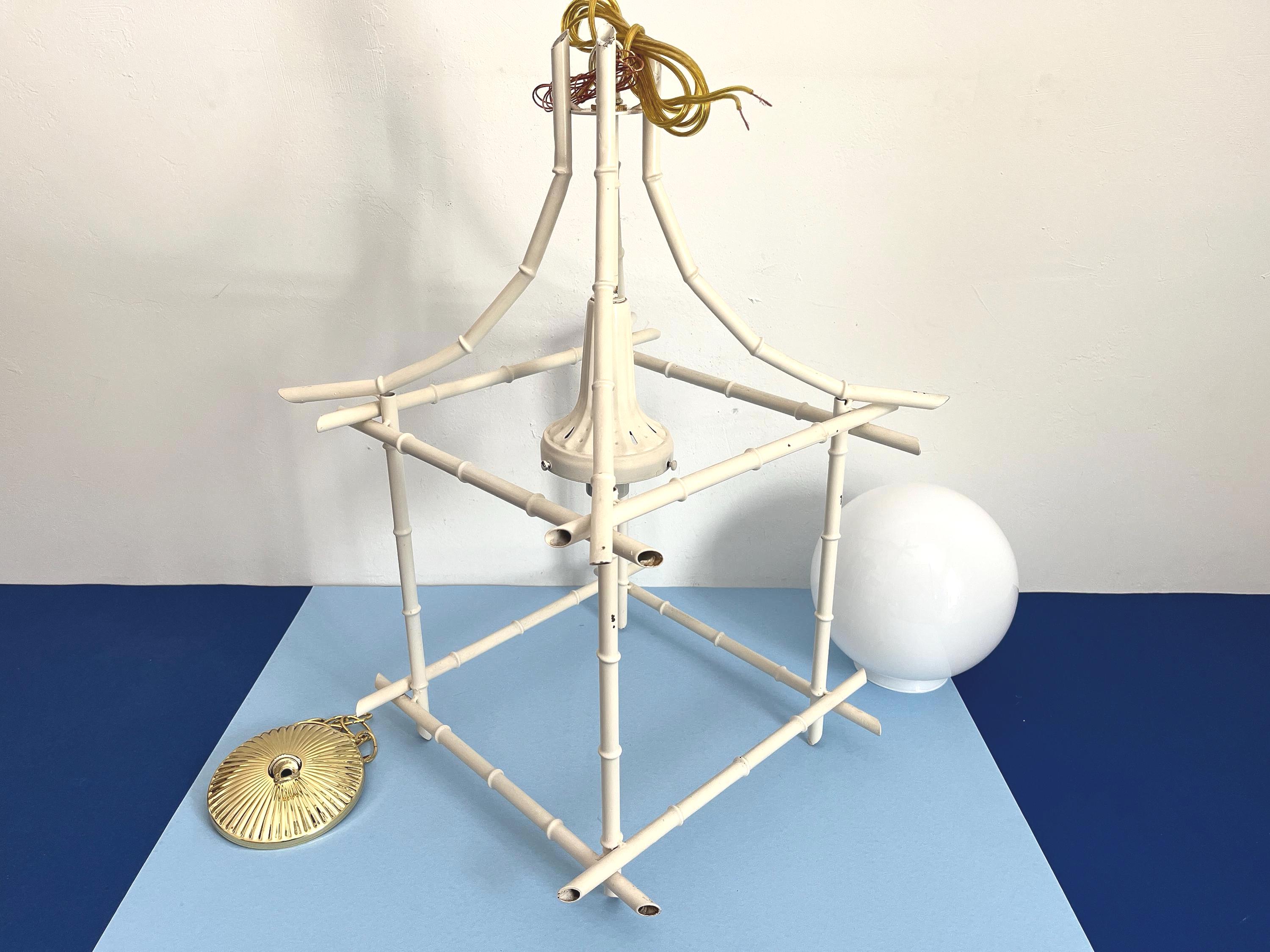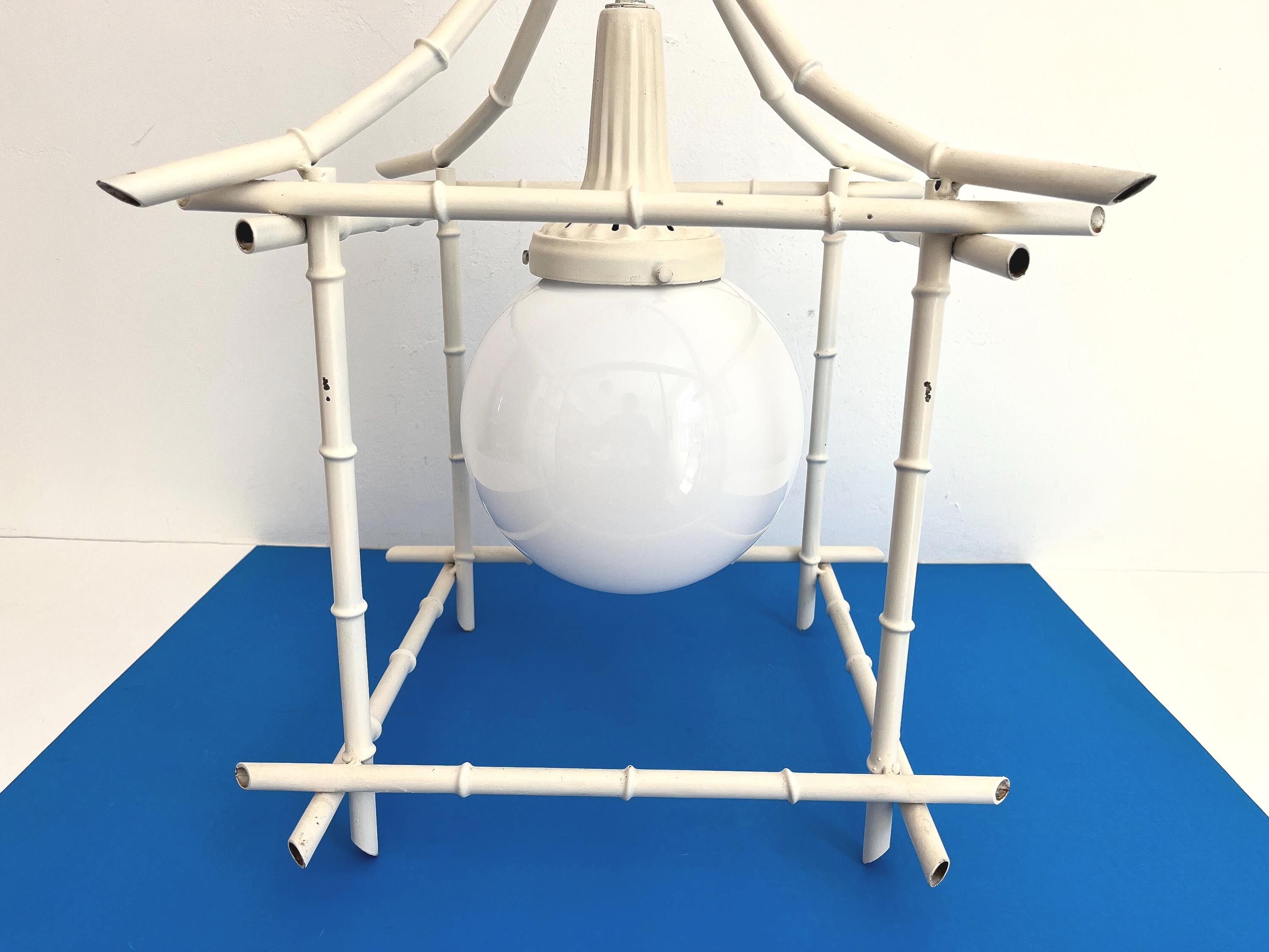 Big Italian bamboo style pagoda pendant light from the 1960s in its original bone white finish with sculptural open squared tole frame and central milk glass globe light. Professionally restored with new wiring and porcelain socket for standard bulb.