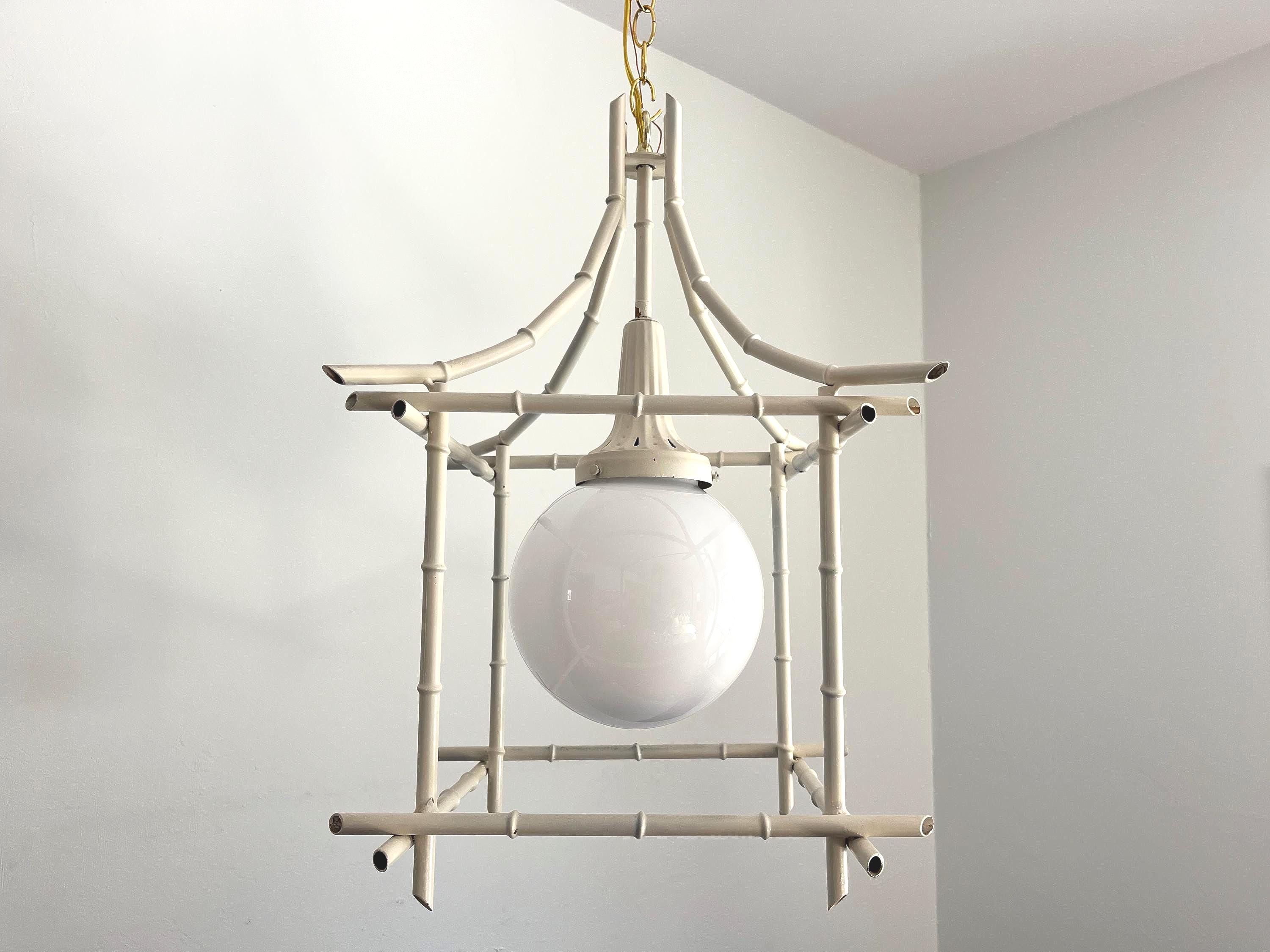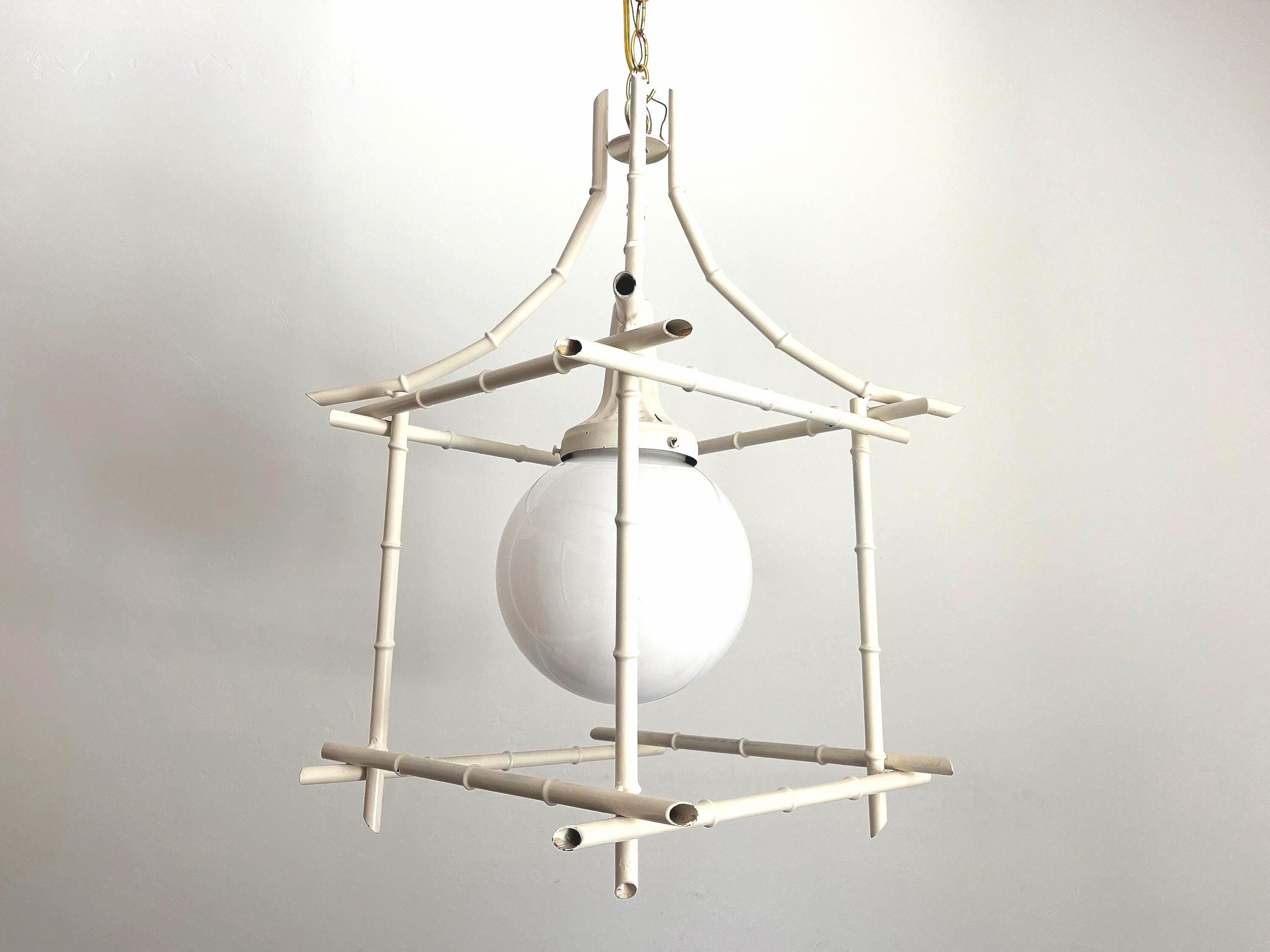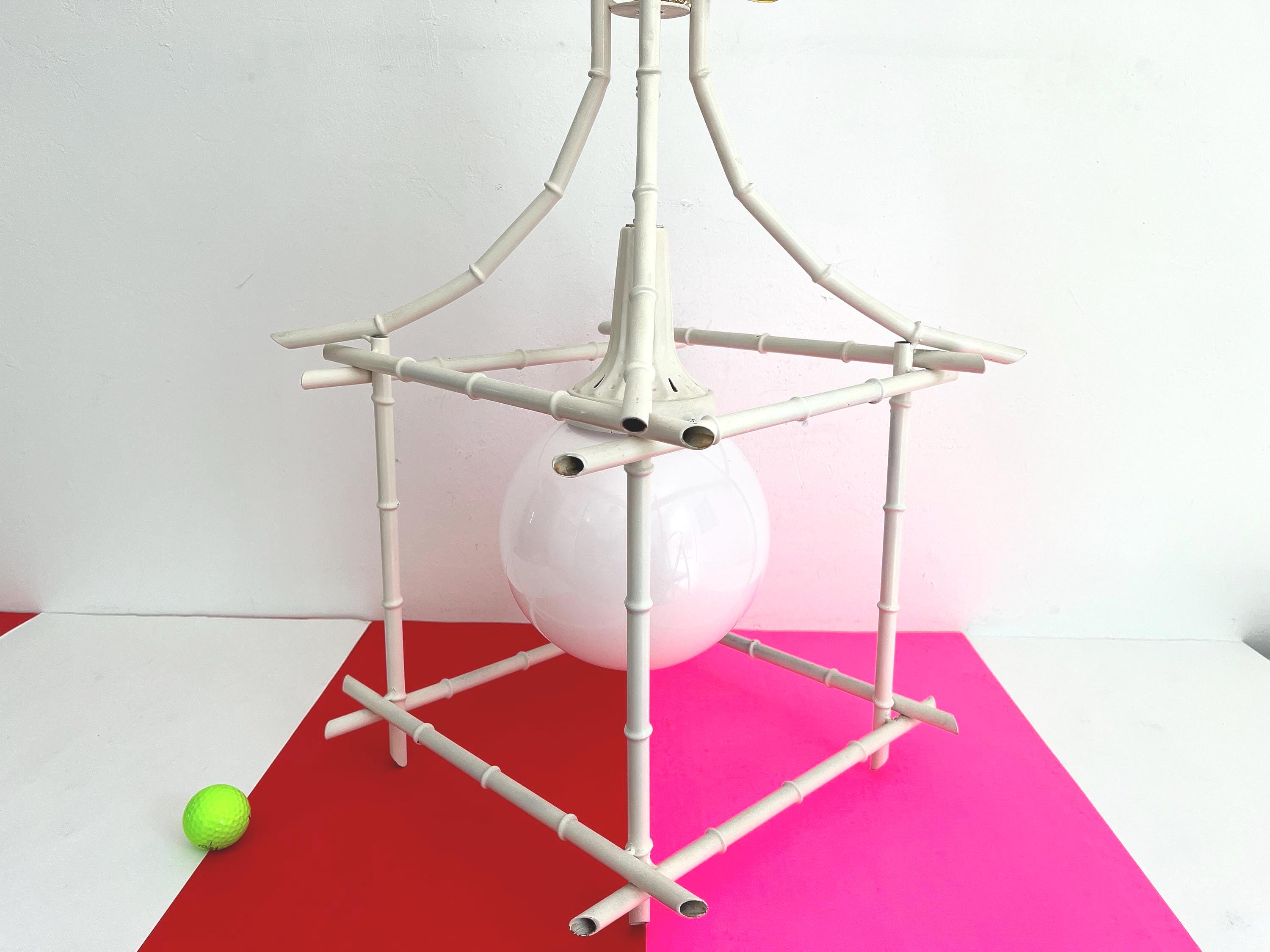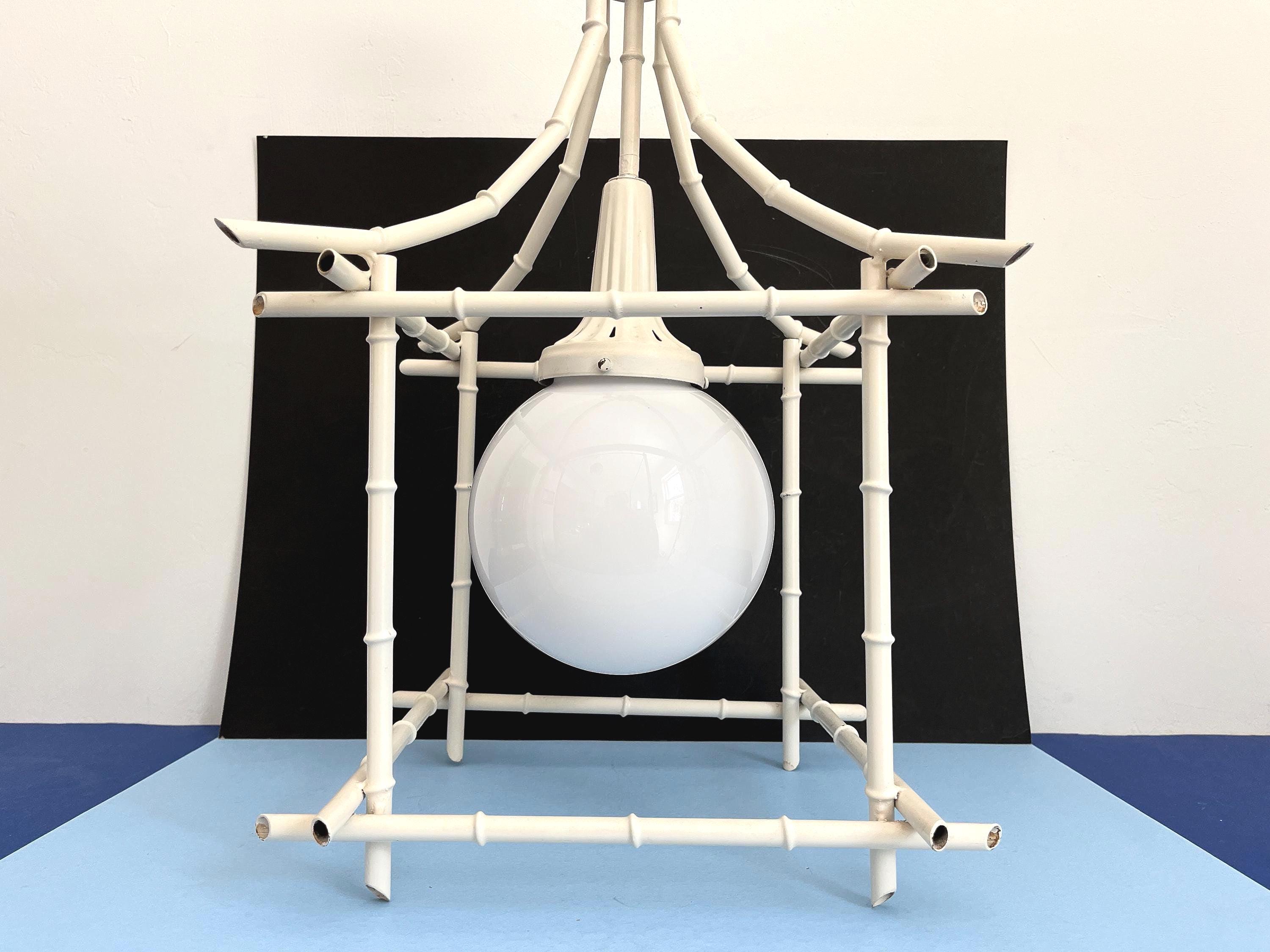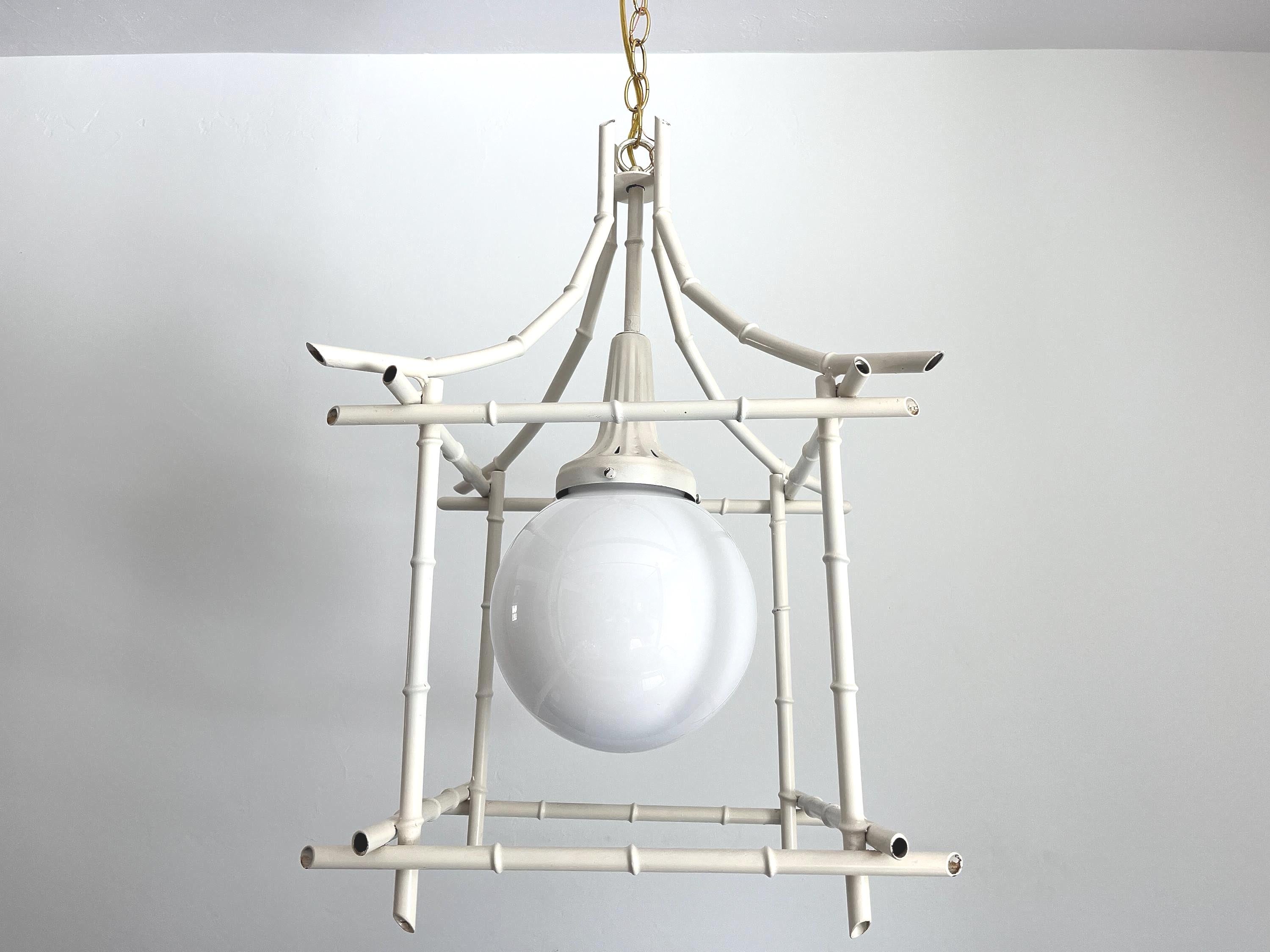 Big Italian bamboo style pagoda pendant light from the 1960s in its original bone white finish with sculptural open squared tole frame and central milk glass globe light. Professionally restored with new wiring and porcelain socket for standard bulb.