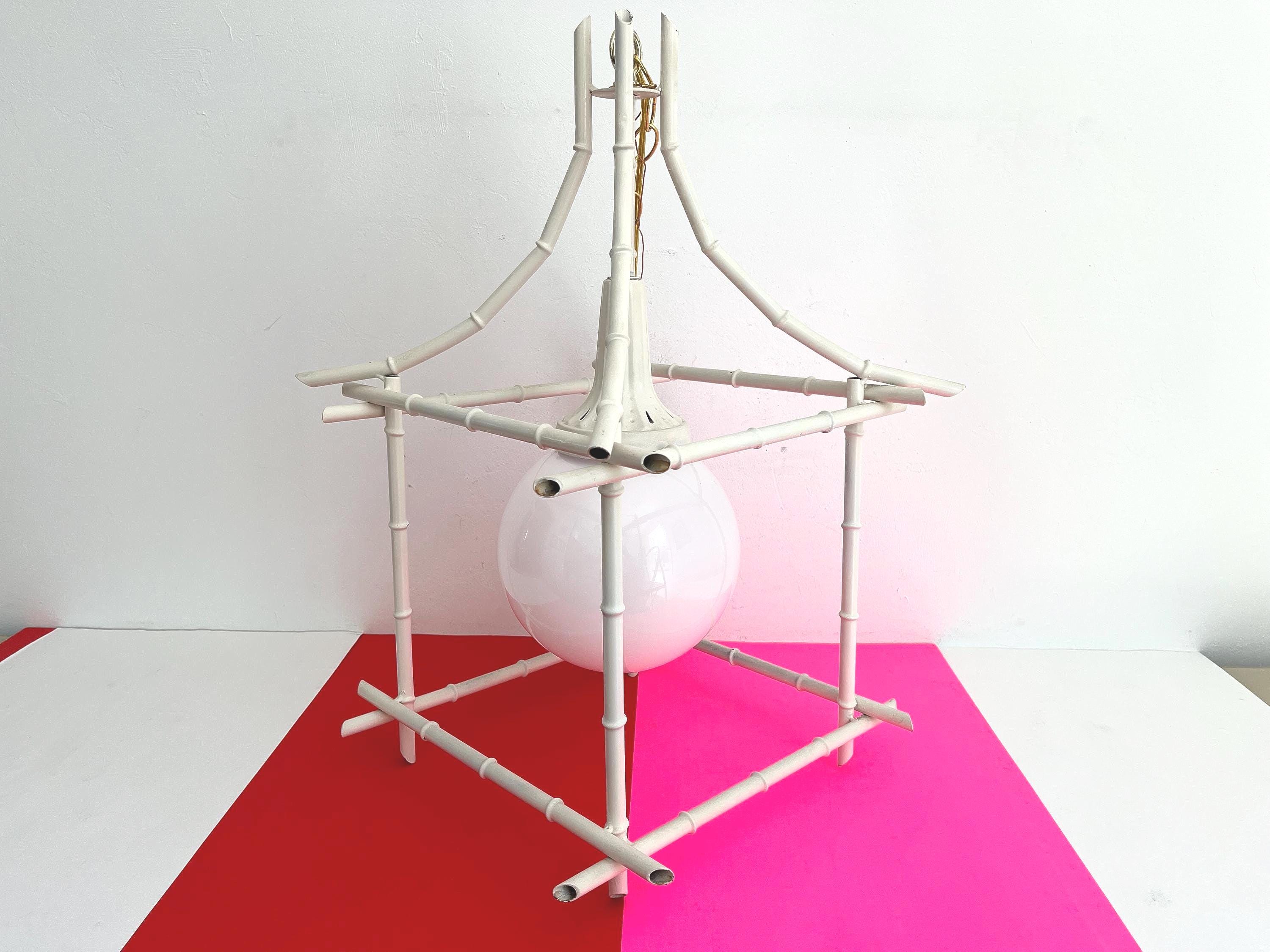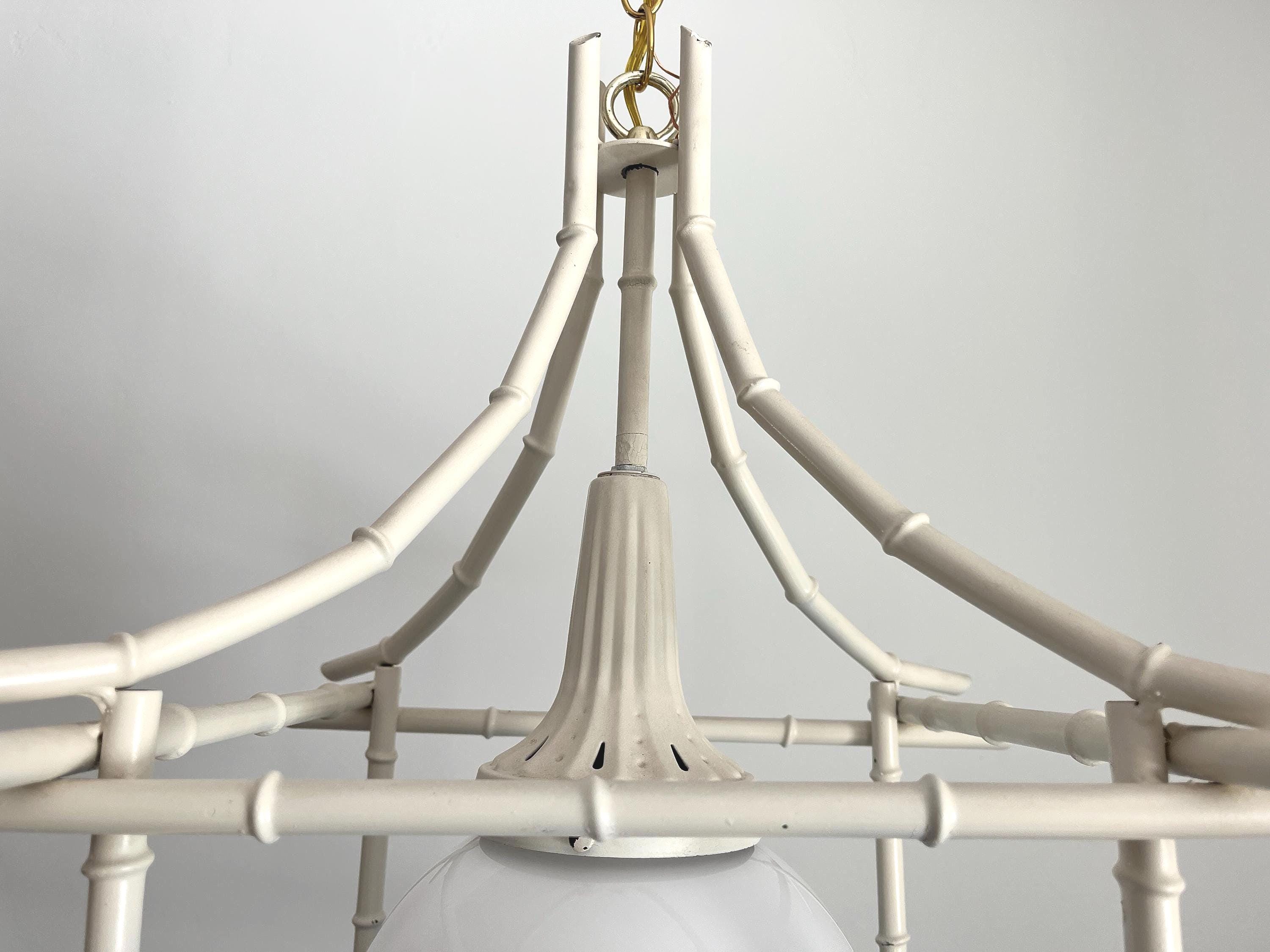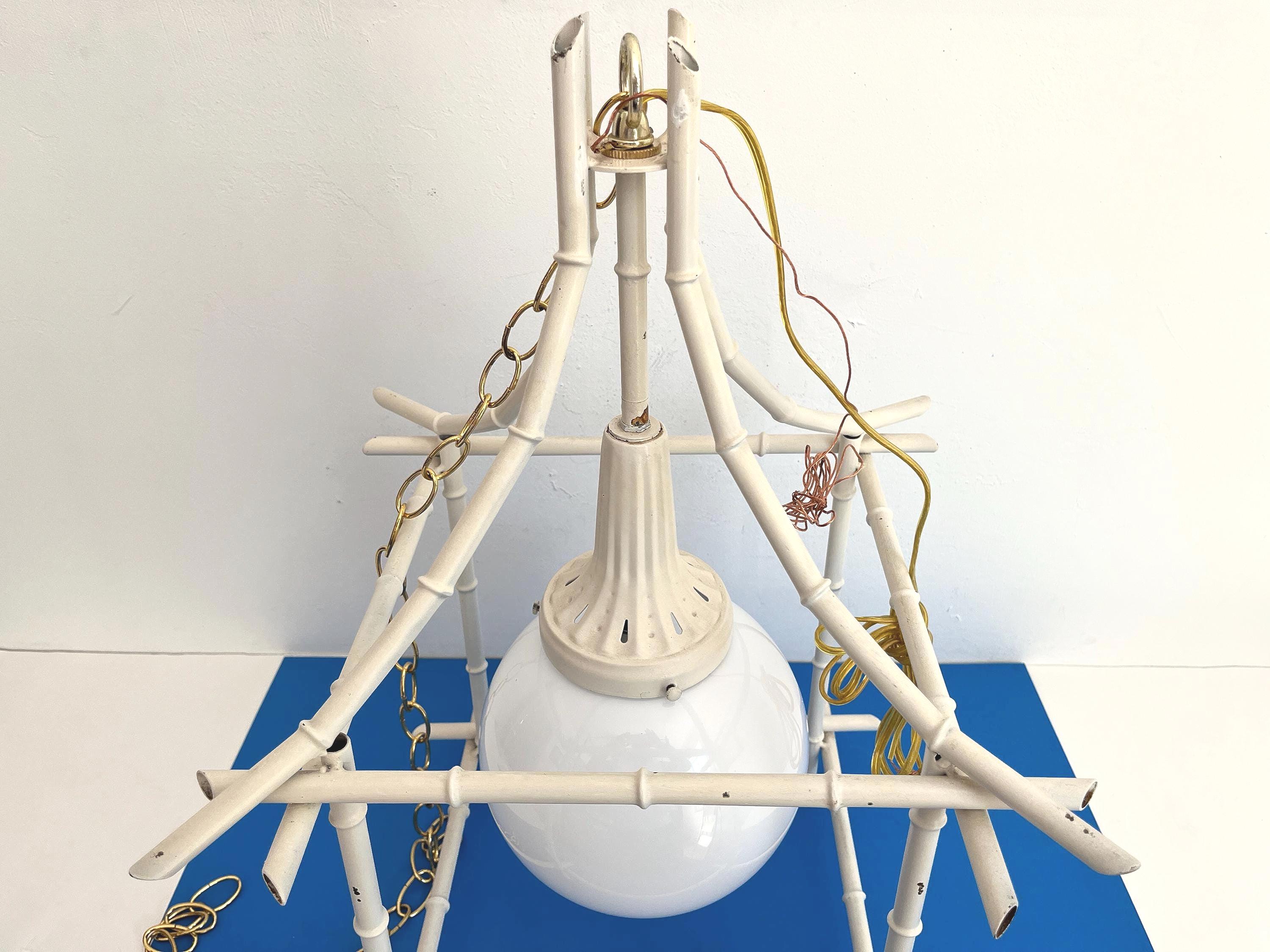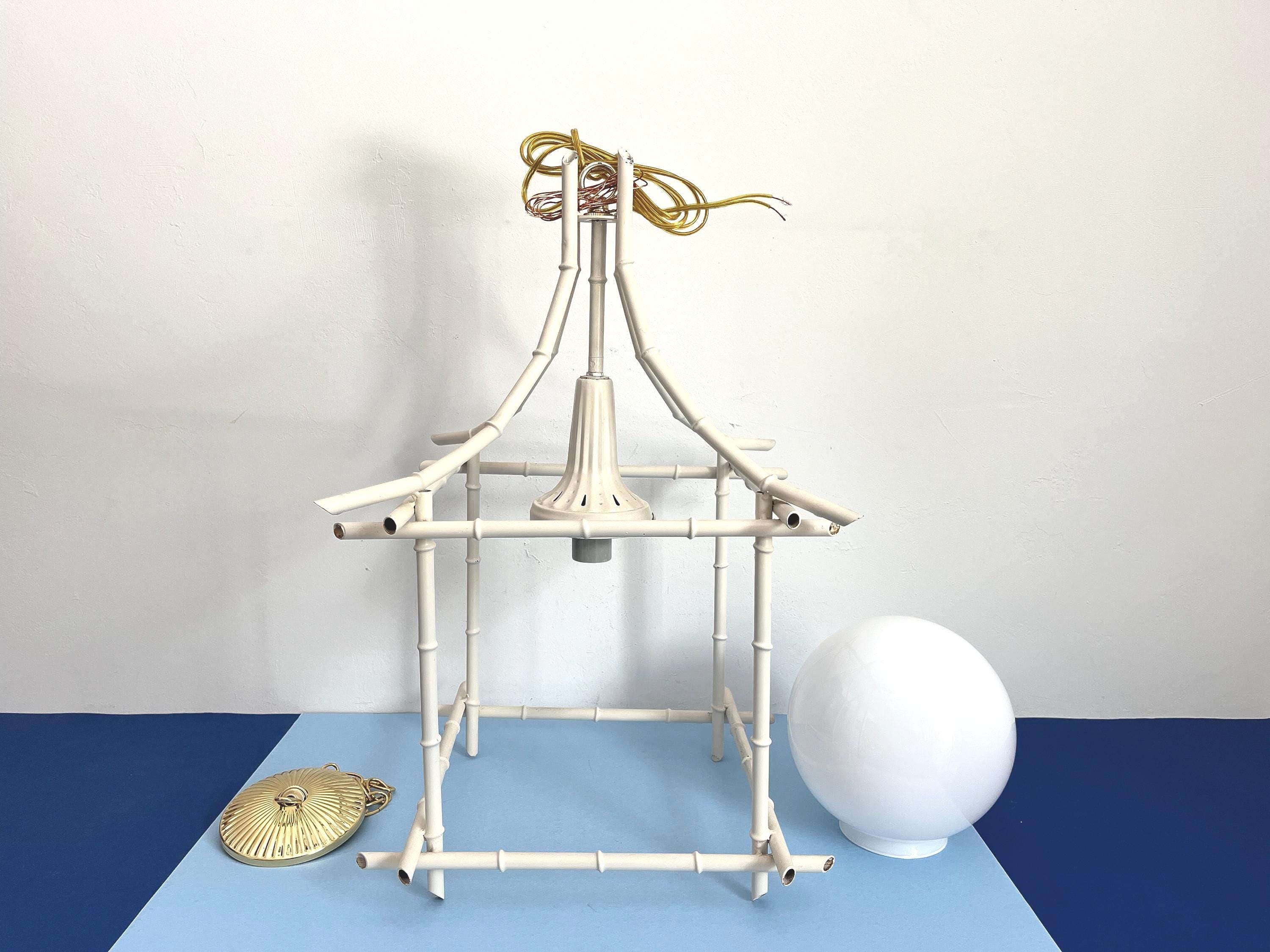 Big Italian bamboo style pagoda pendant light from the 1960s in its original bone white finish with sculptural open squared tole frame and central milk glass globe light. Professionally restored with new wiring and porcelain socket for standard bulb.