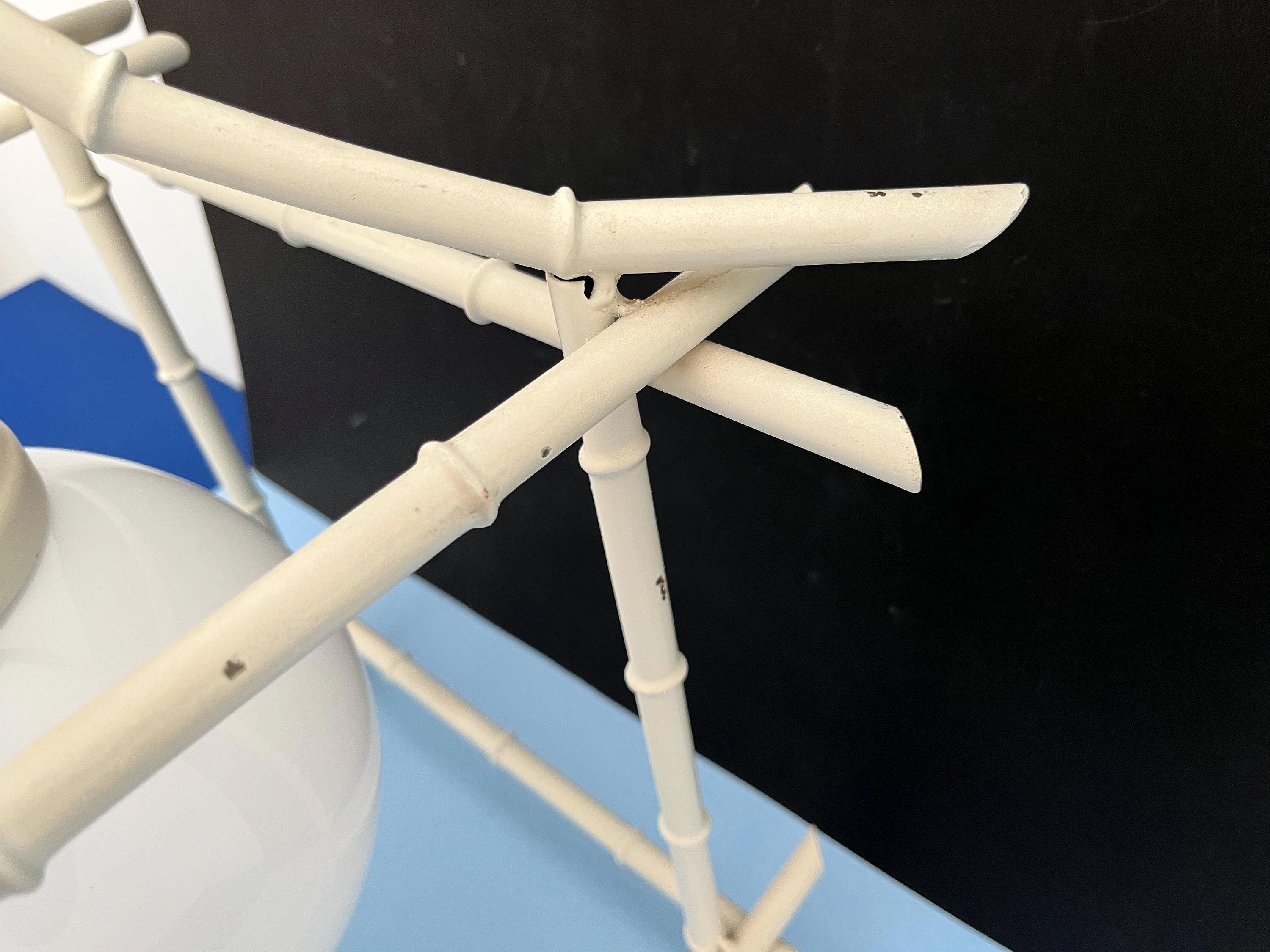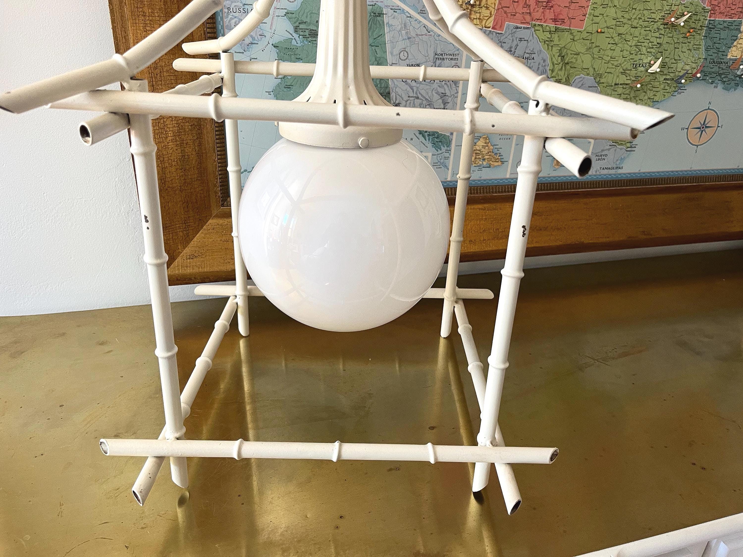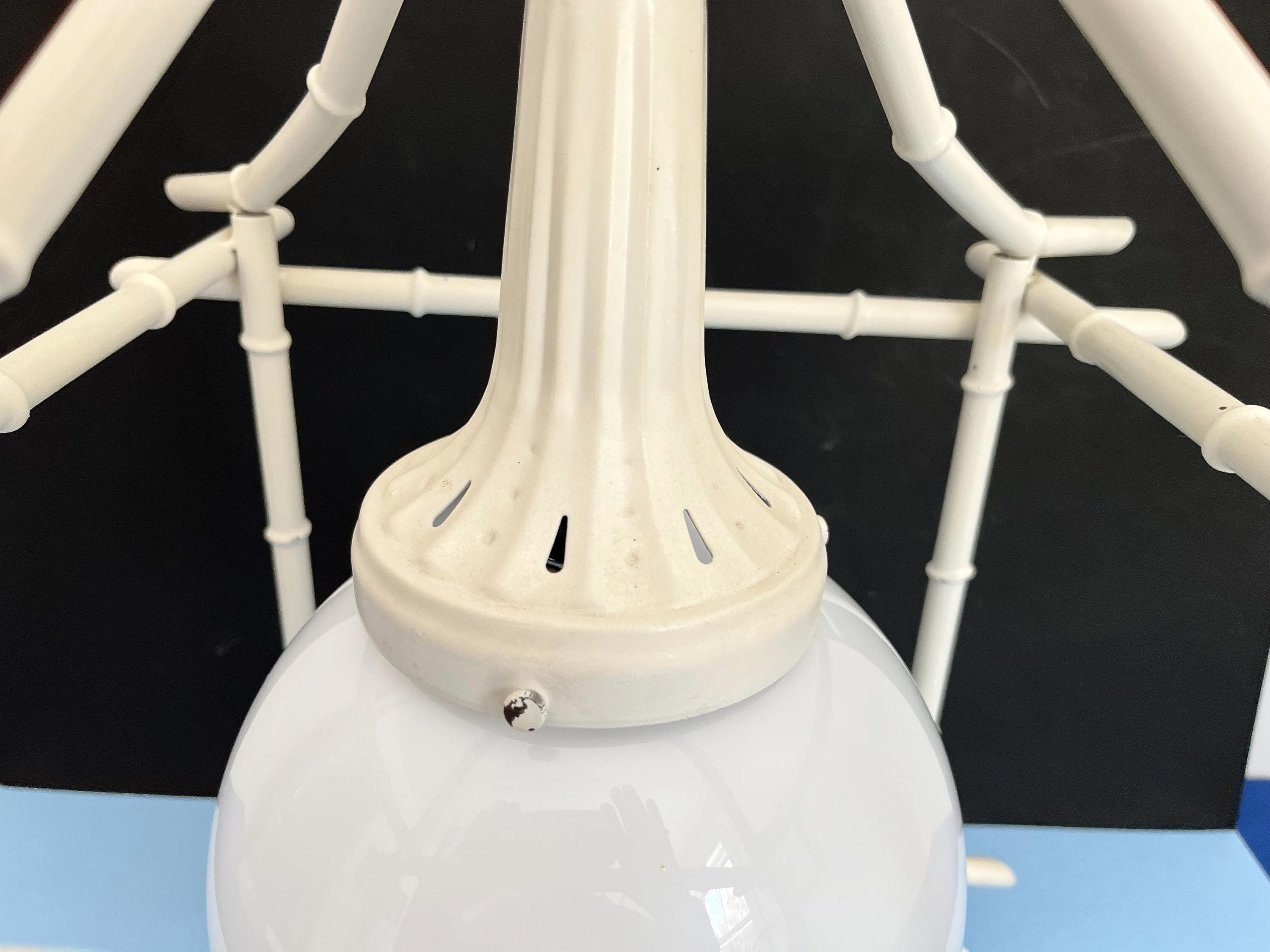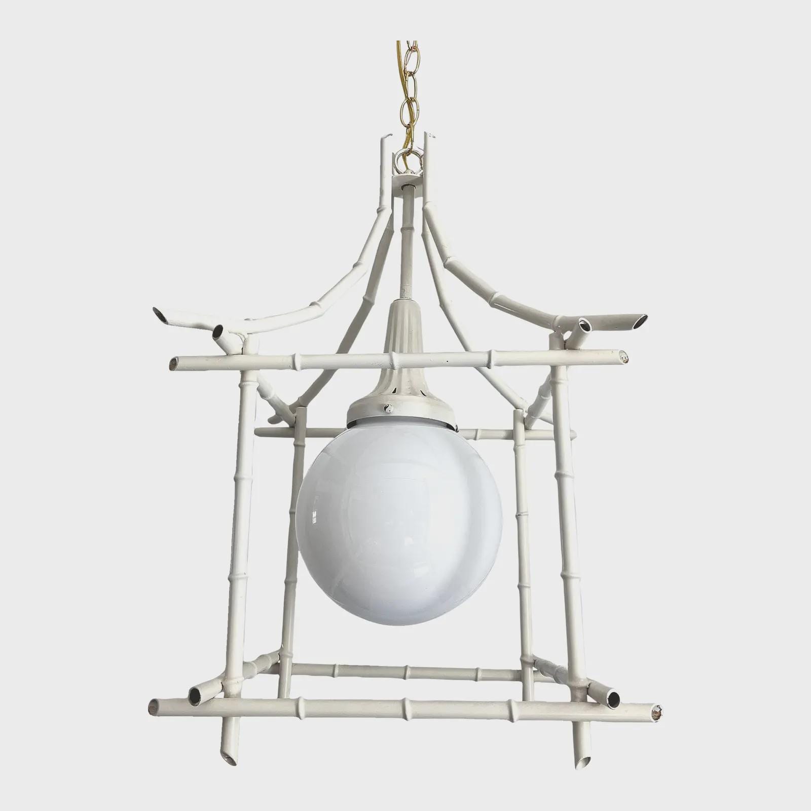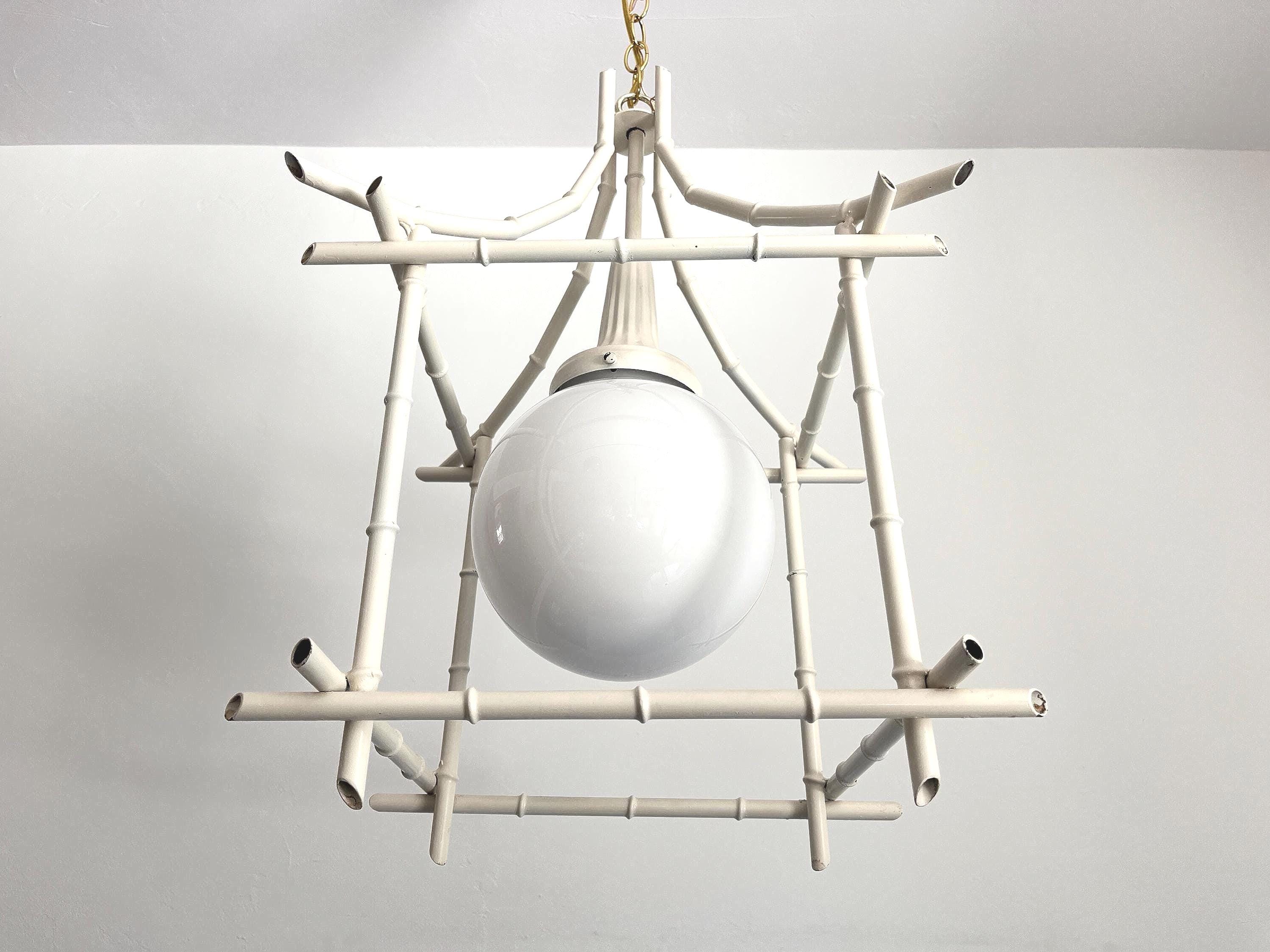 Big Italian bamboo style pagoda pendant light from the 1960s in its original bone white finish with sculptural open squared tole frame and central milk glass globe light. Professionally restored with new wiring and porcelain socket for standard bulb.
