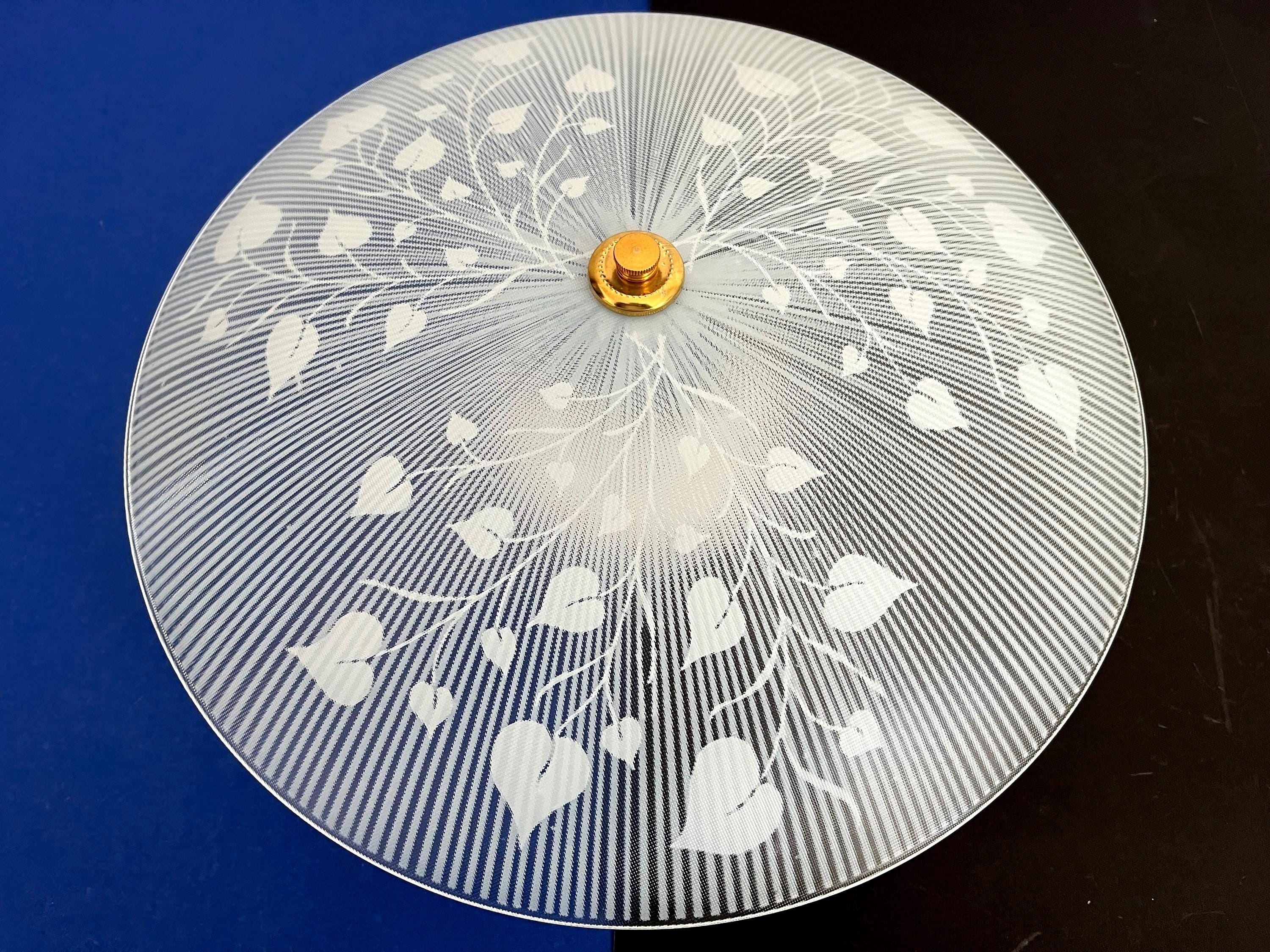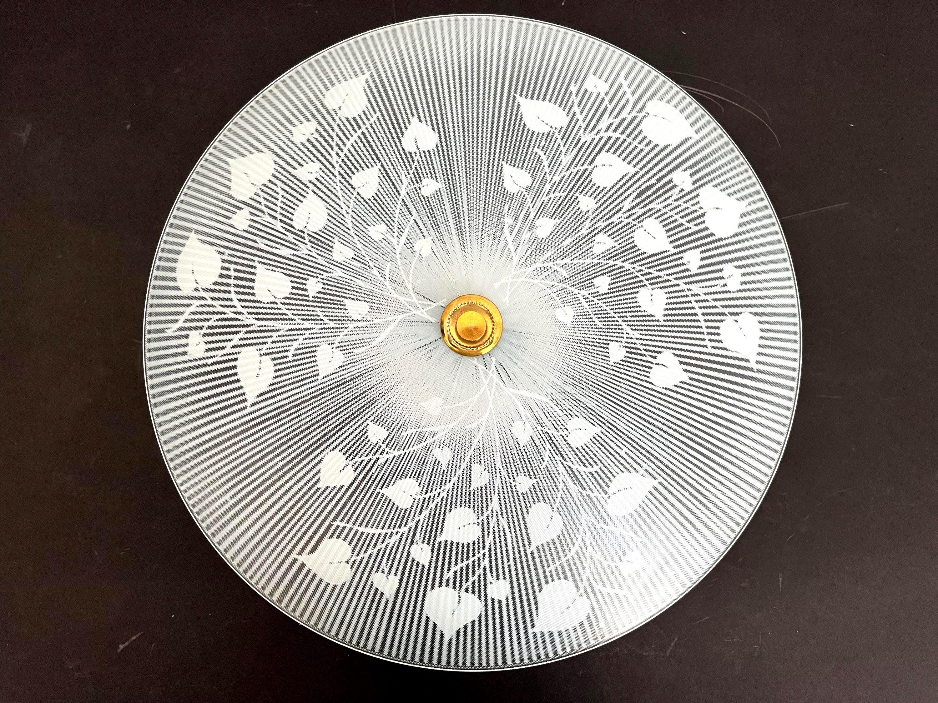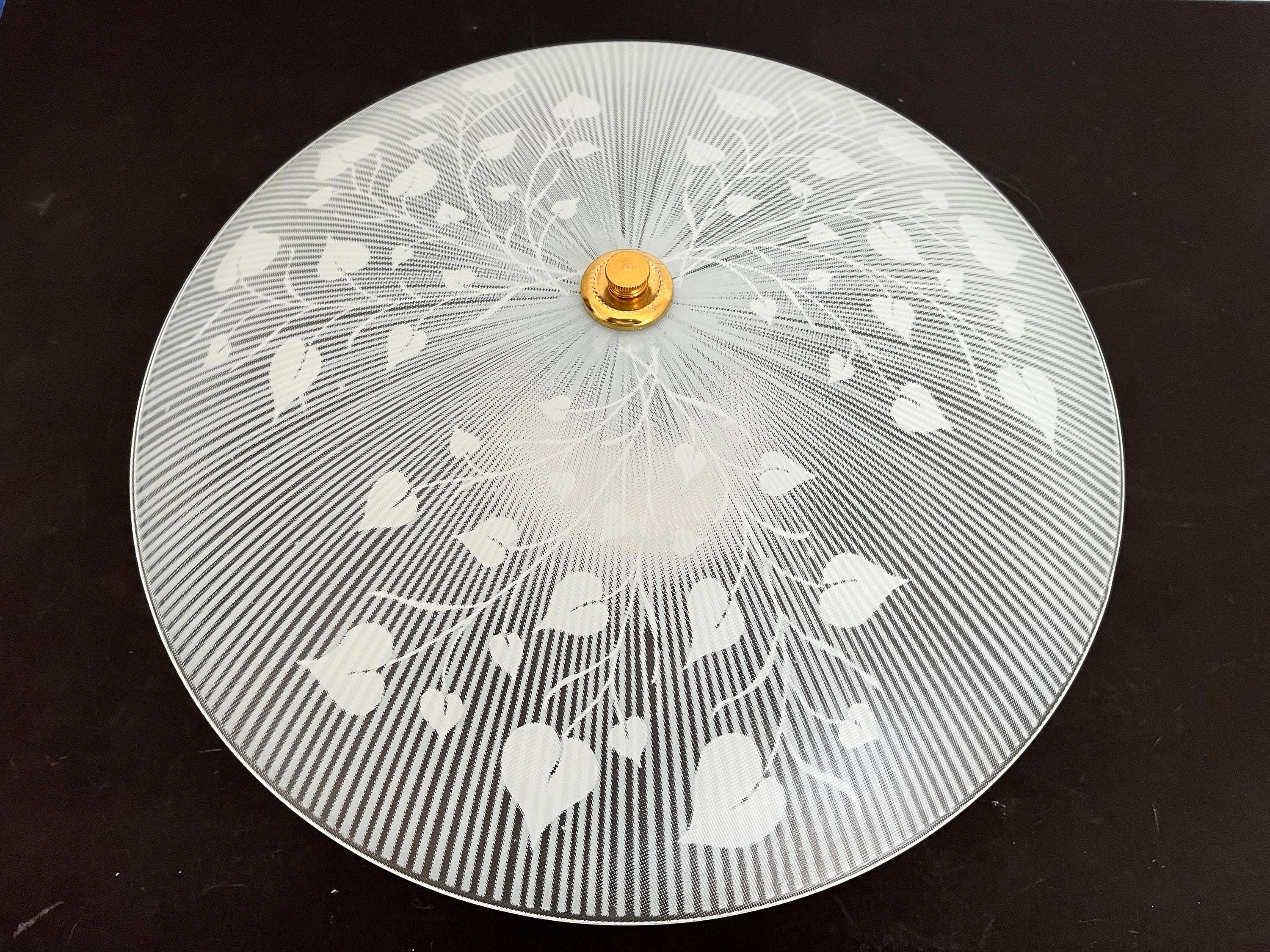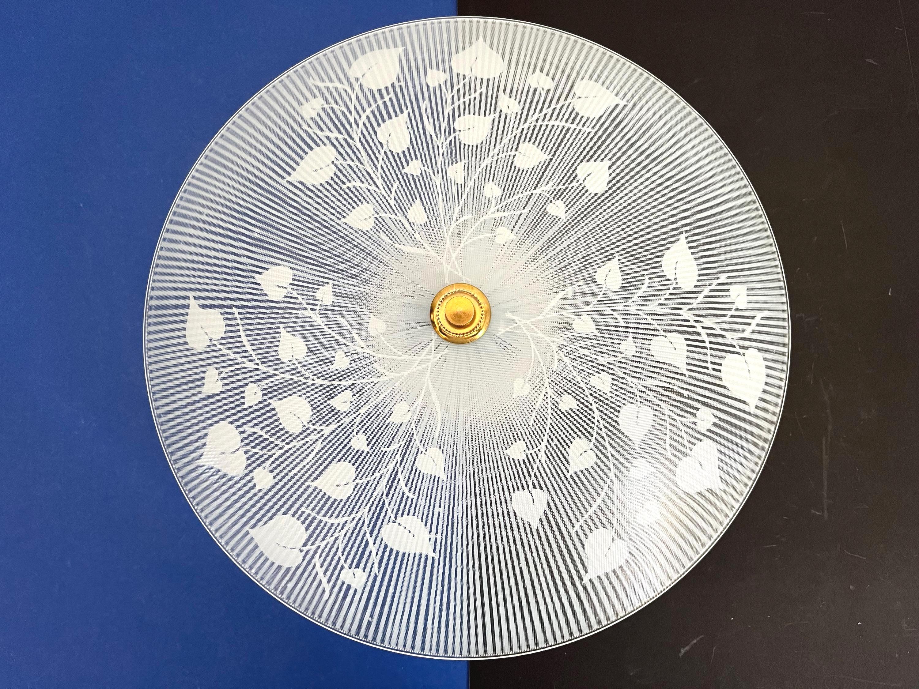 Lovely mid century textured glass flush mount ceiling light reverse painted in white stripes overlaid with trailing heart-shaped leaves and two lights. New wiring and sockets for standard bulbs.