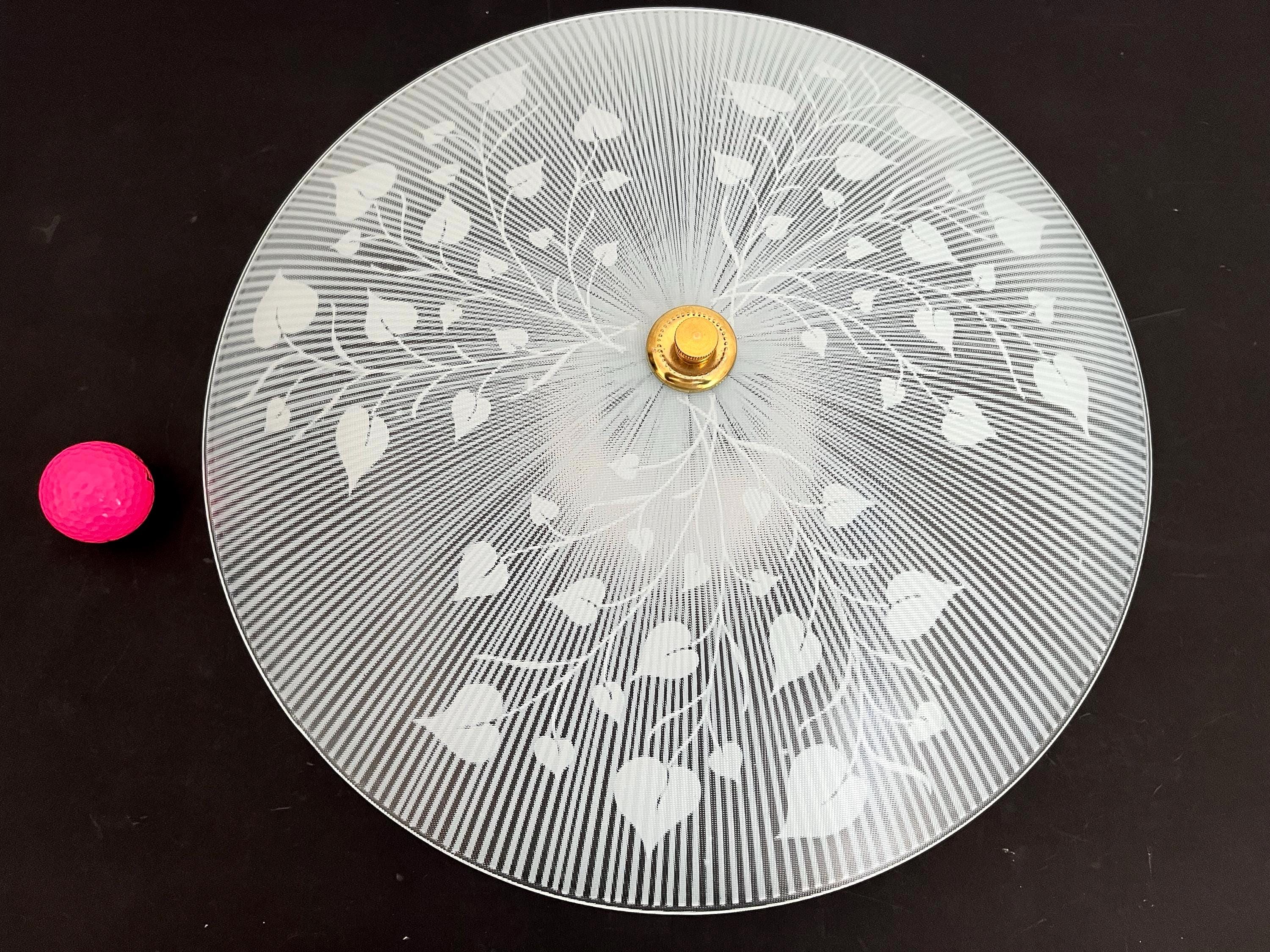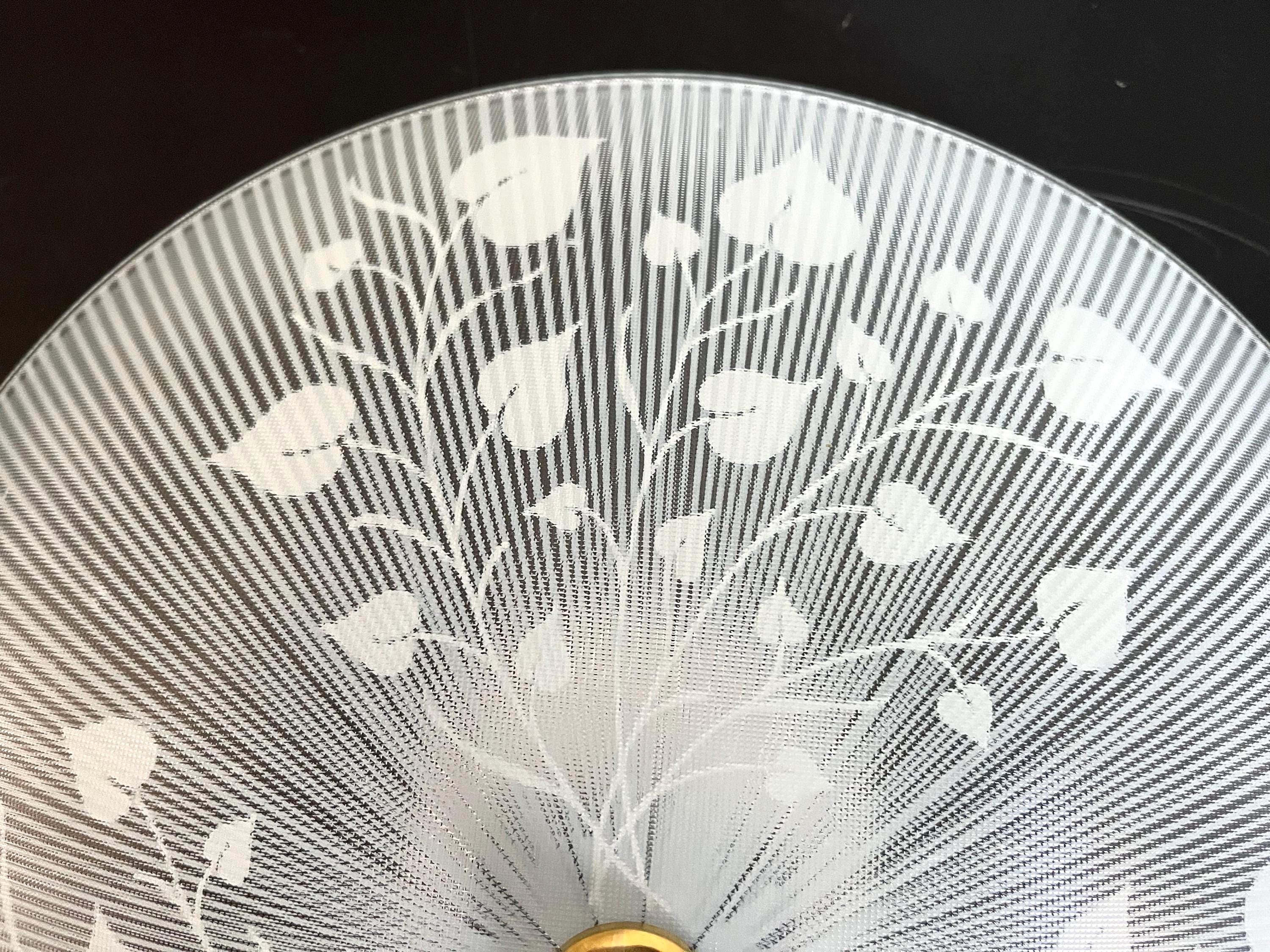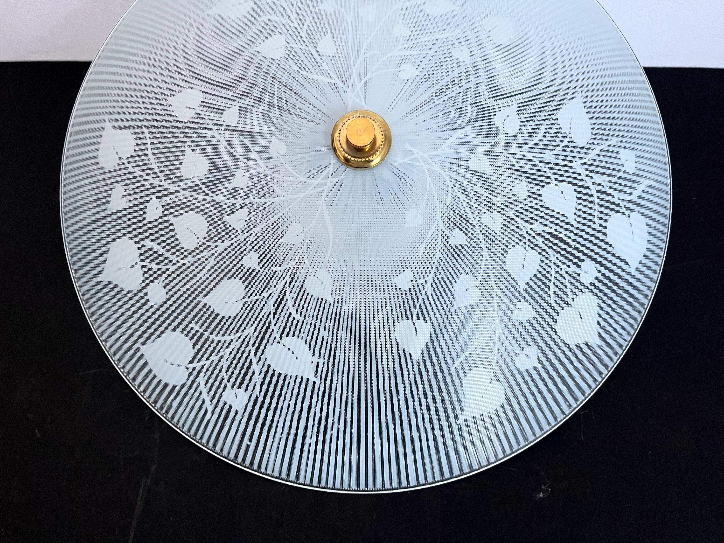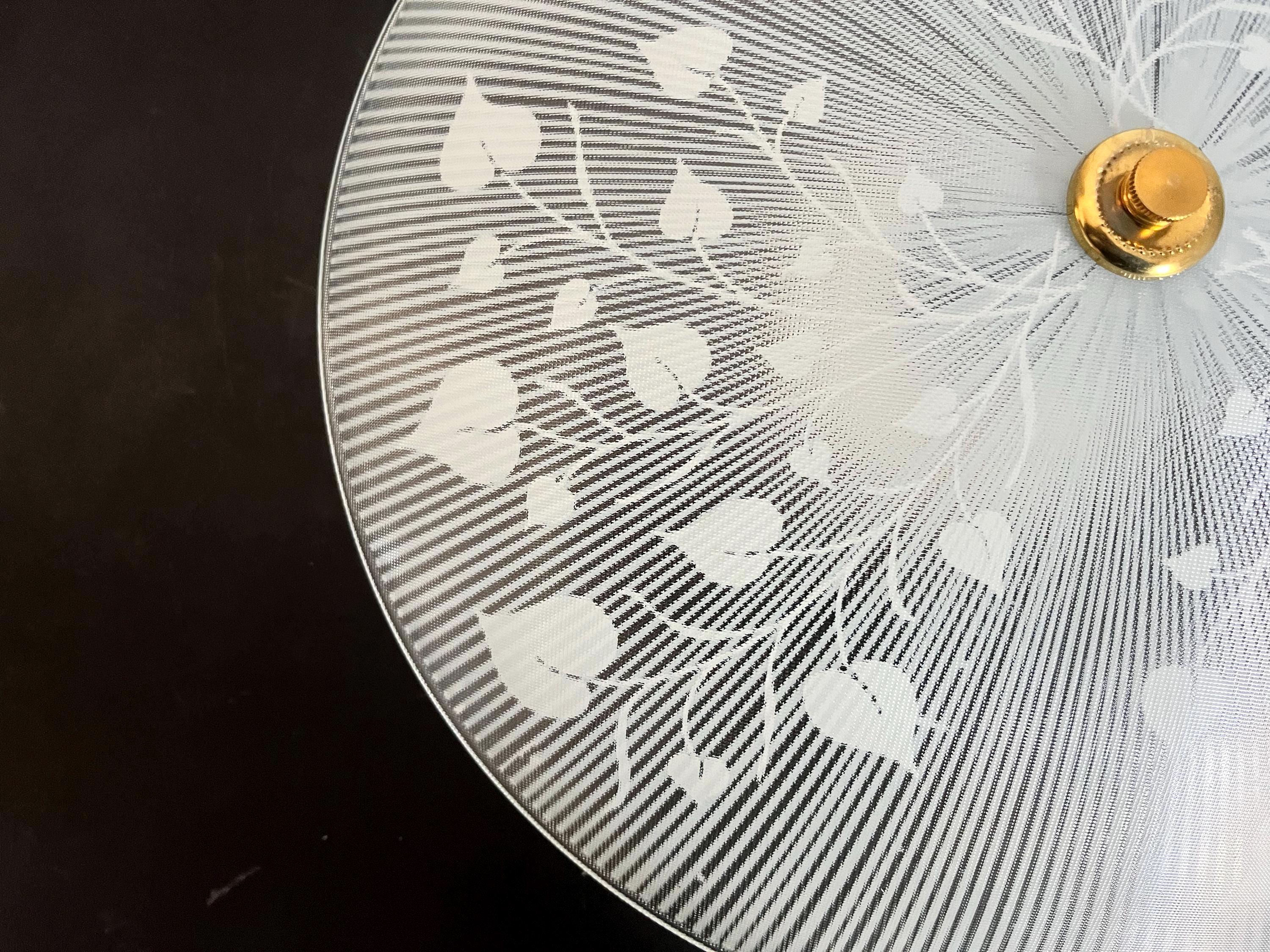 Lovely mid century textured glass flush mount ceiling light reverse painted in white stripes overlaid with trailing heart-shaped leaves and two lights. New wiring and sockets for standard bulbs.