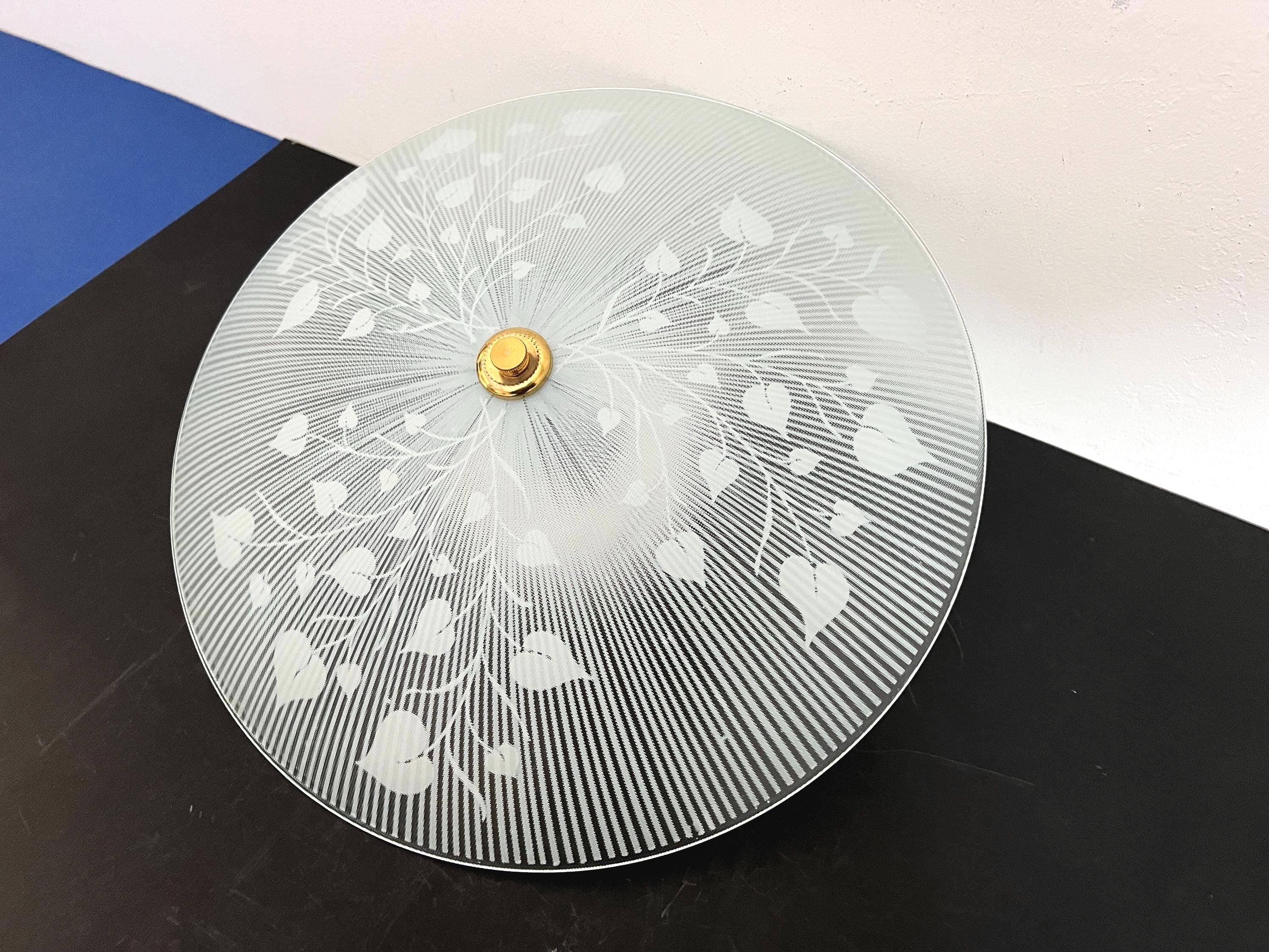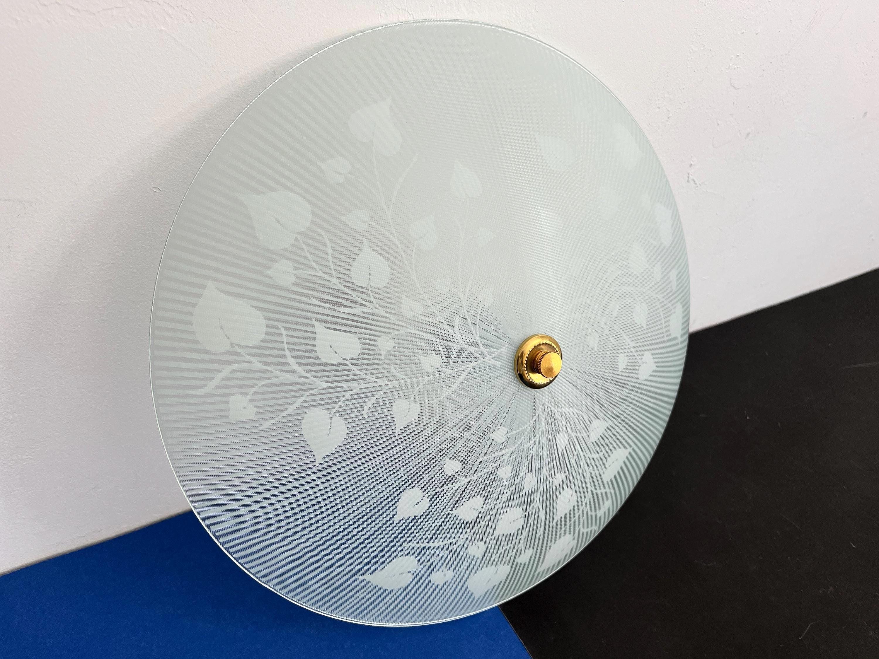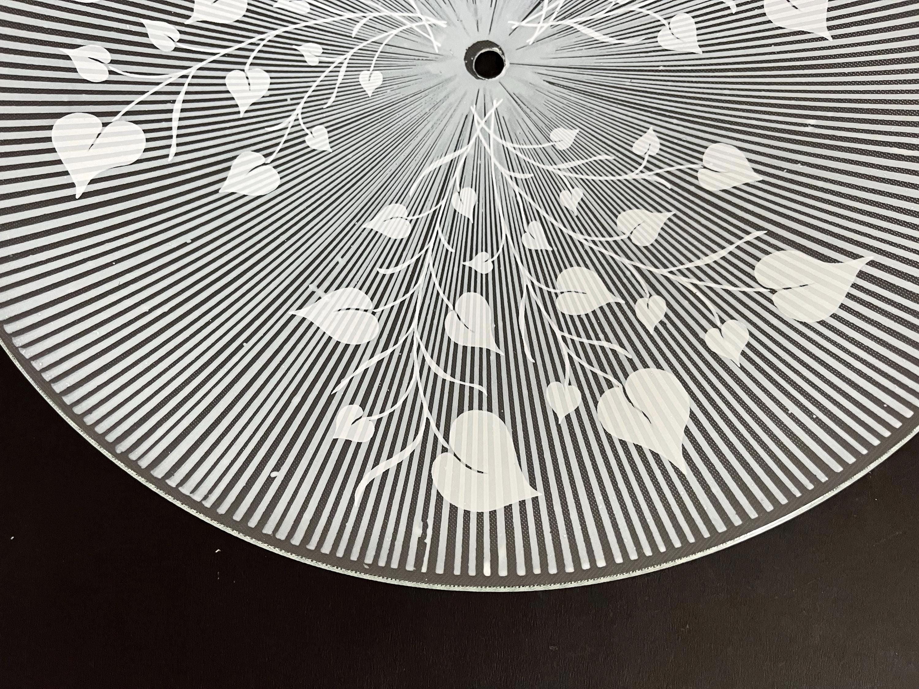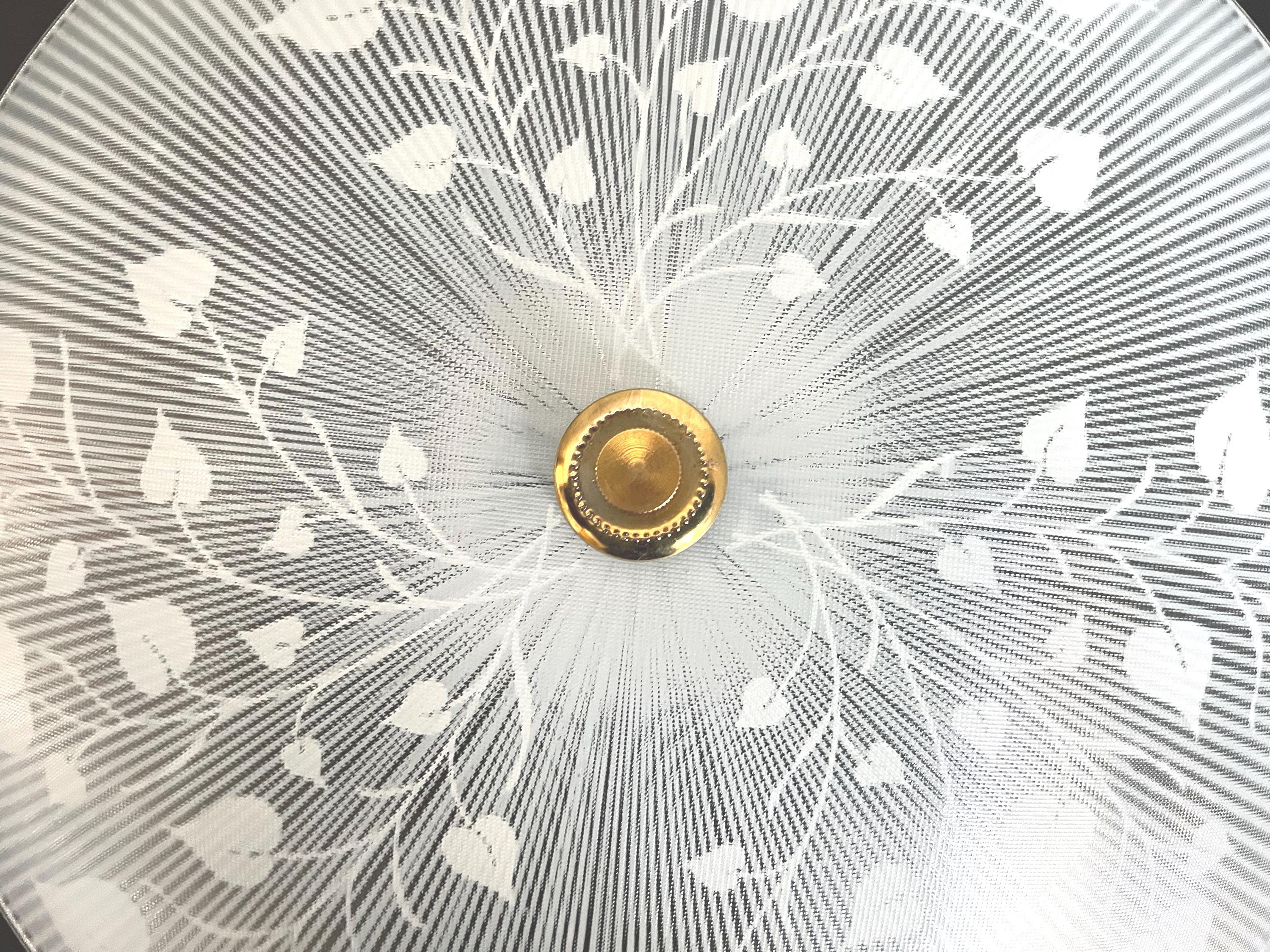 Lovely mid century textured glass flush mount ceiling light reverse painted in white stripes overlaid with trailing heart-shaped leaves and two lights. New wiring and sockets for standard bulbs.