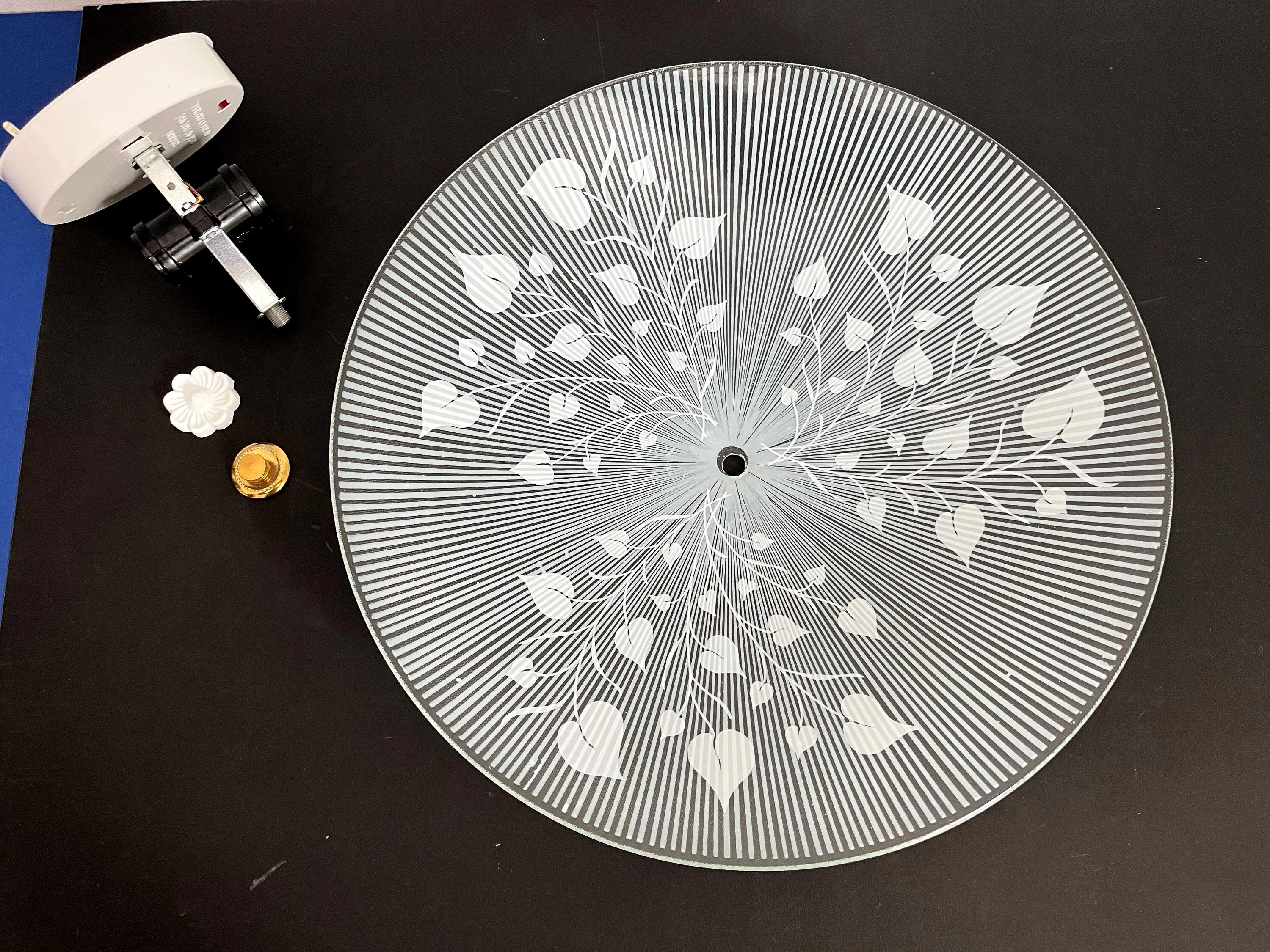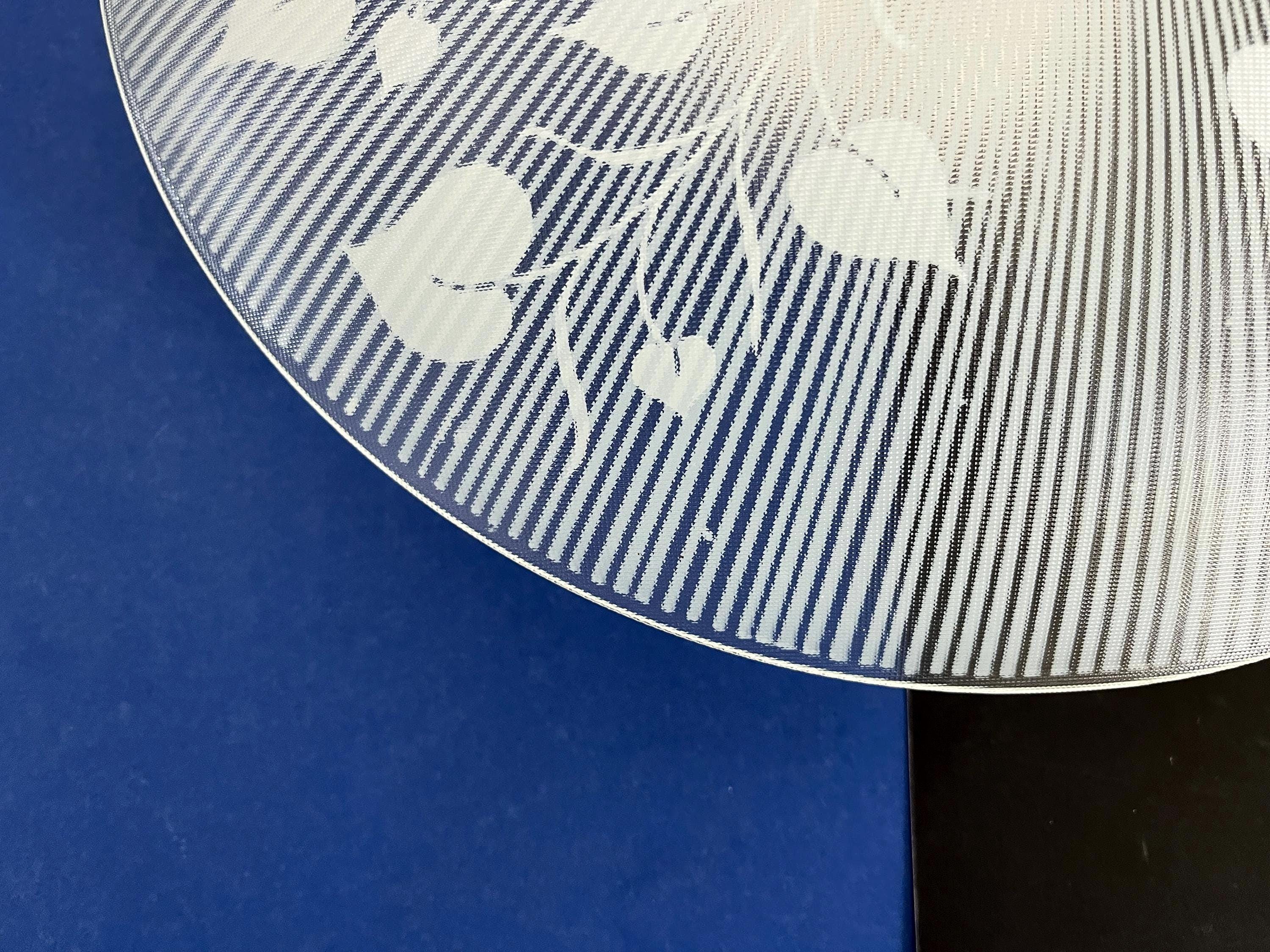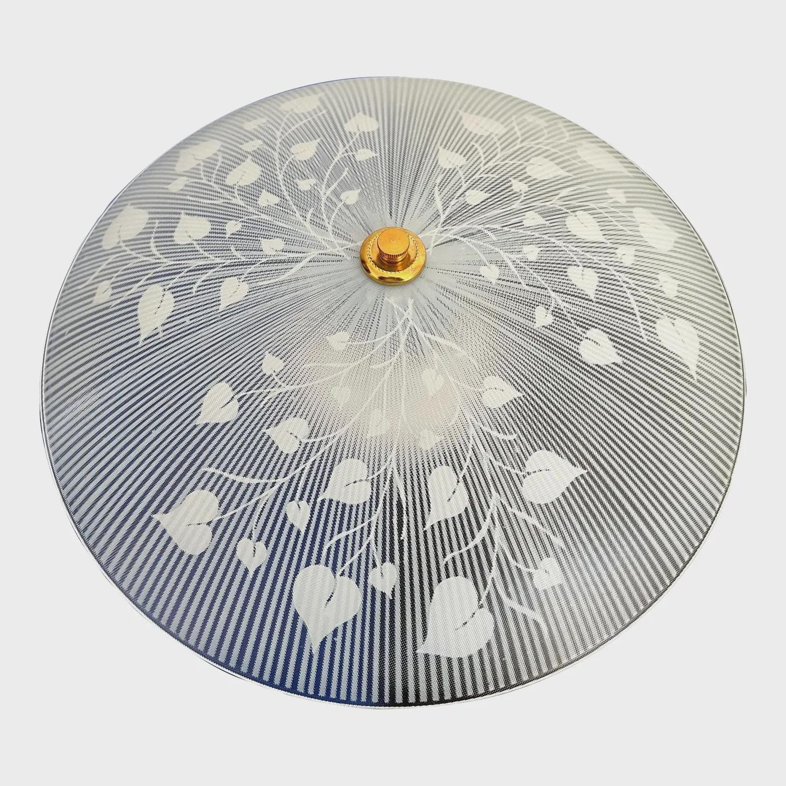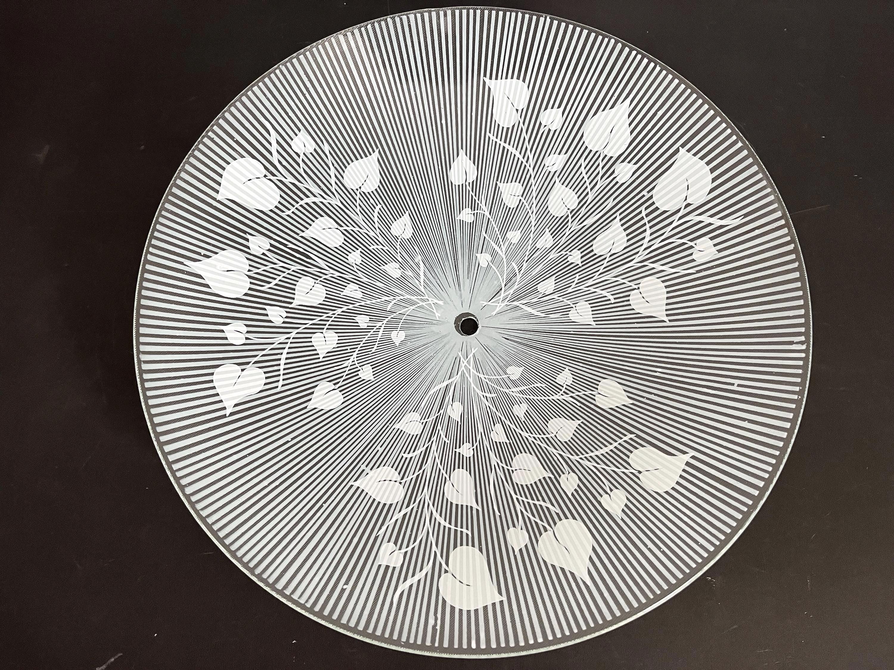 Lovely mid century textured glass flush mount ceiling light reverse painted in white stripes overlaid with trailing heart-shaped leaves and two lights. New wiring and sockets for standard bulbs.