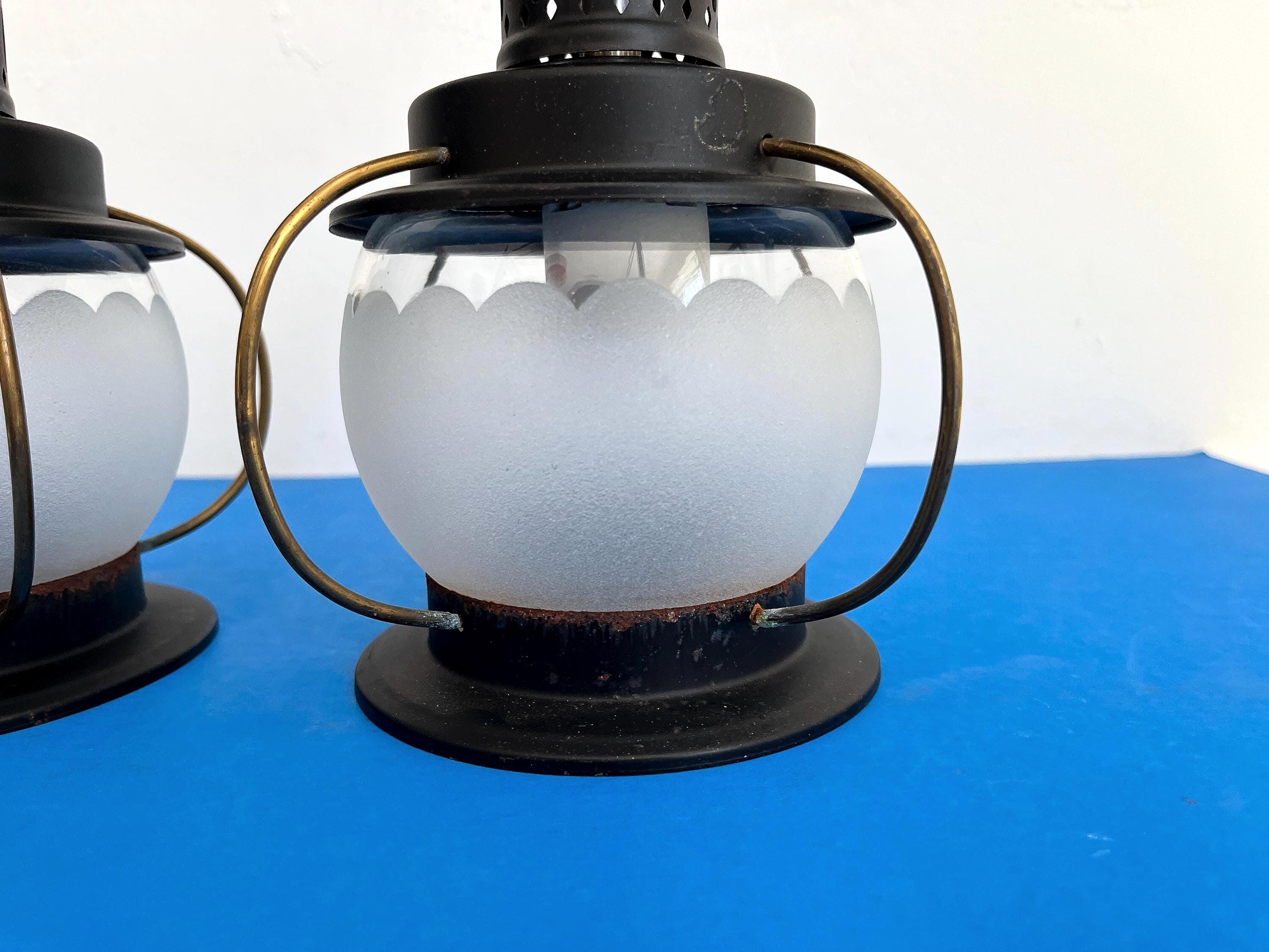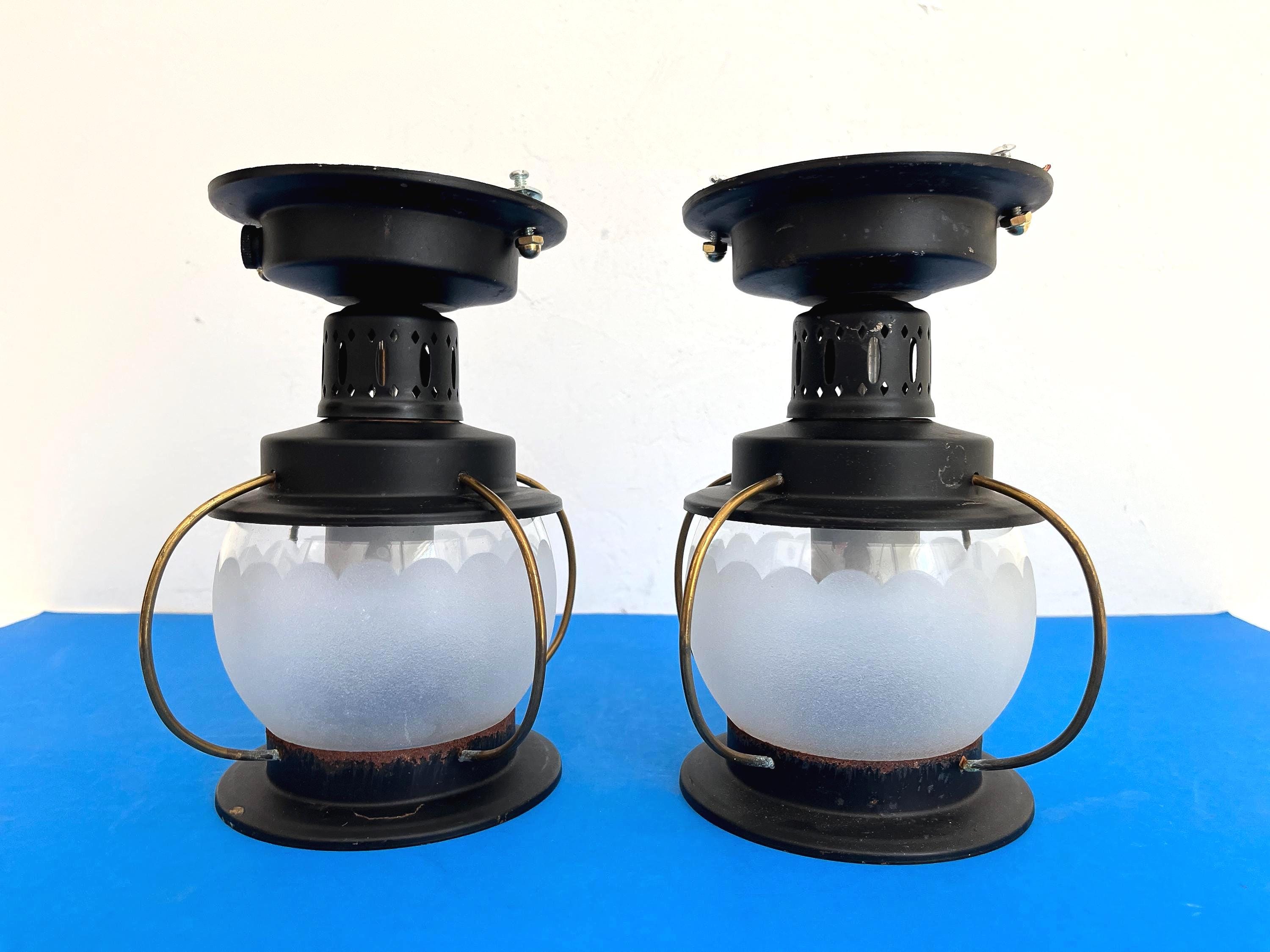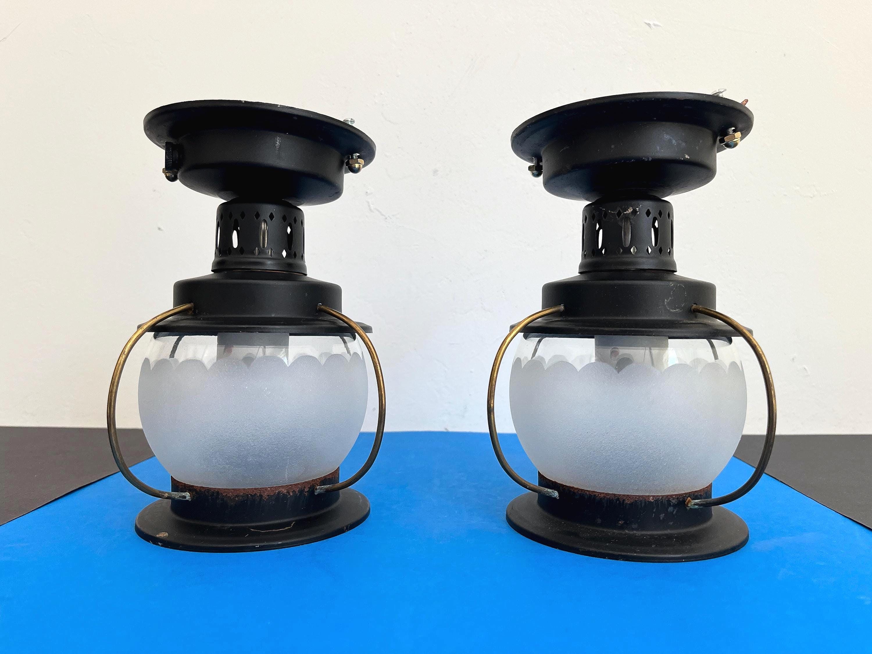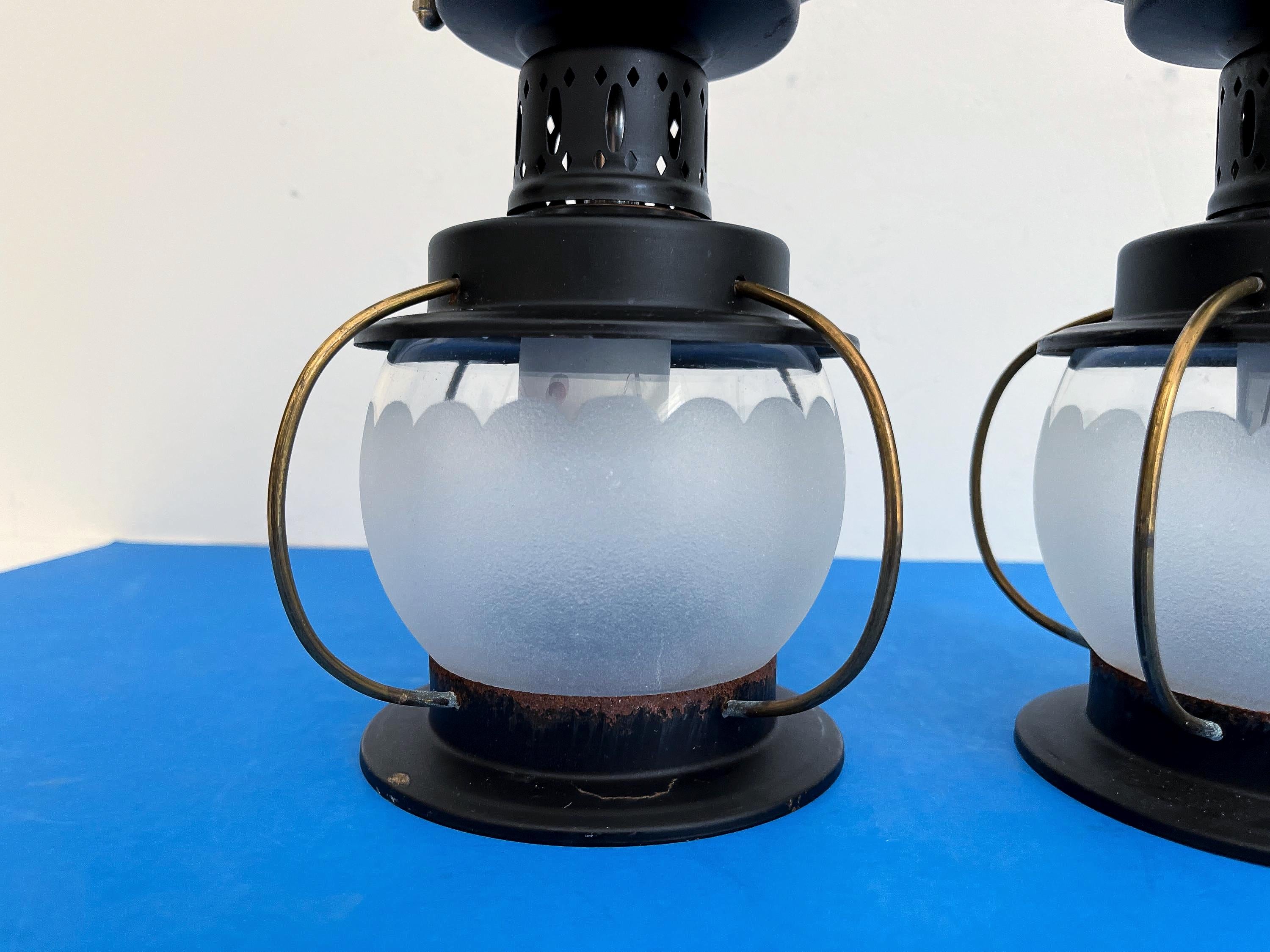 Petite 1950s caged iron semi flush ceiling lights in sleek nautical style with frosted and scalloped glass globes, pierced black iron finials, and gold brackets. Professionally restored with new wiring and porcelain sockets for standard bulbs.