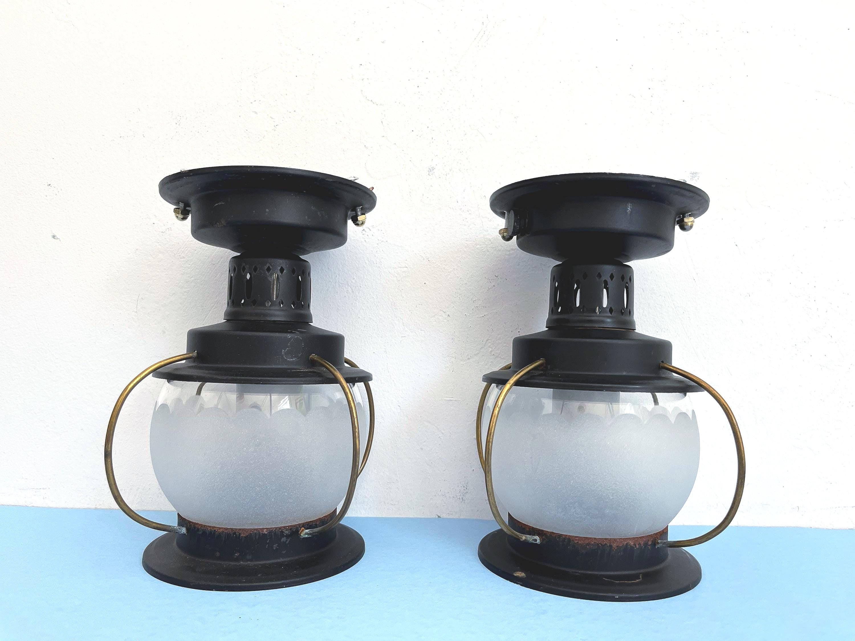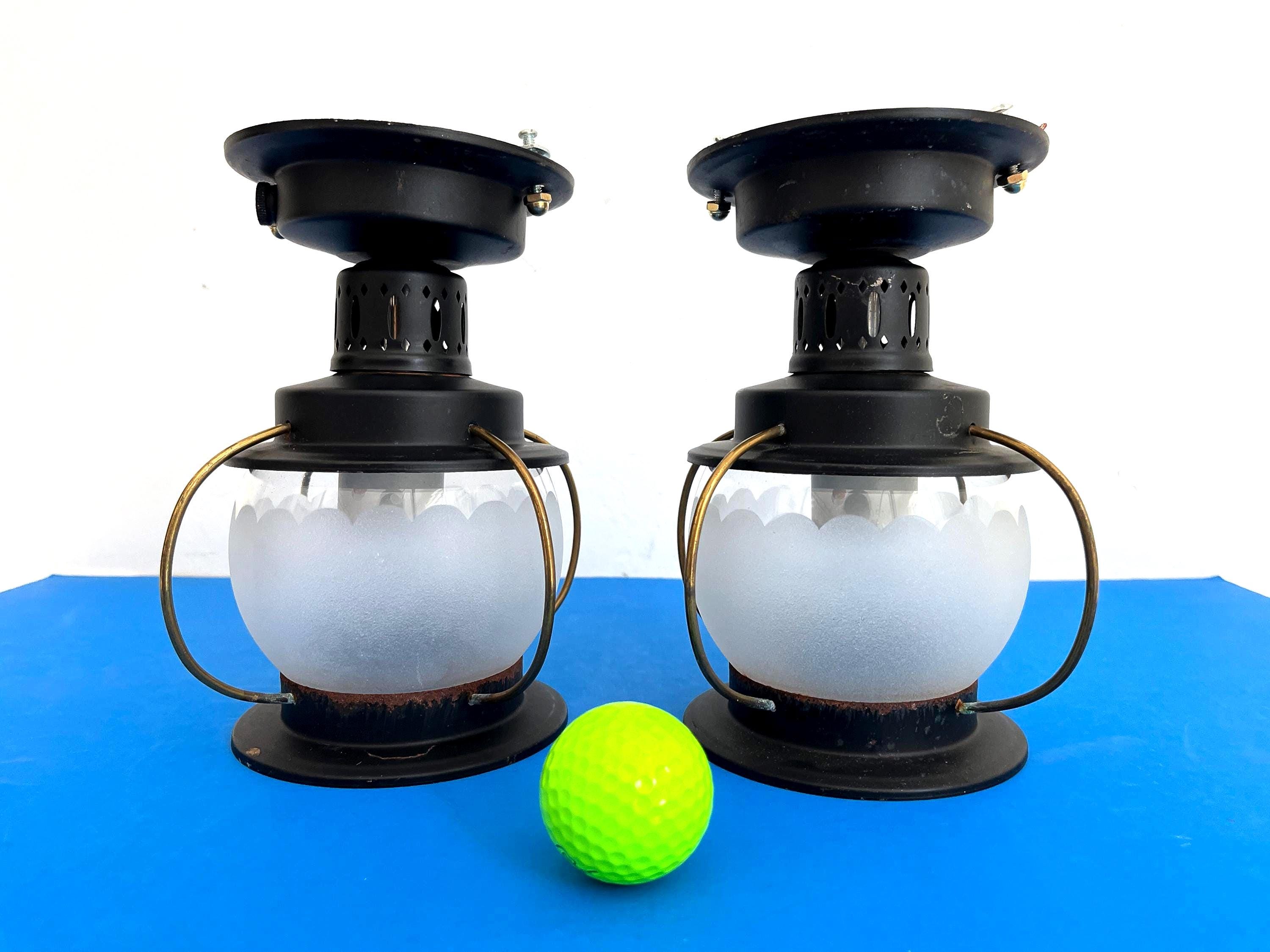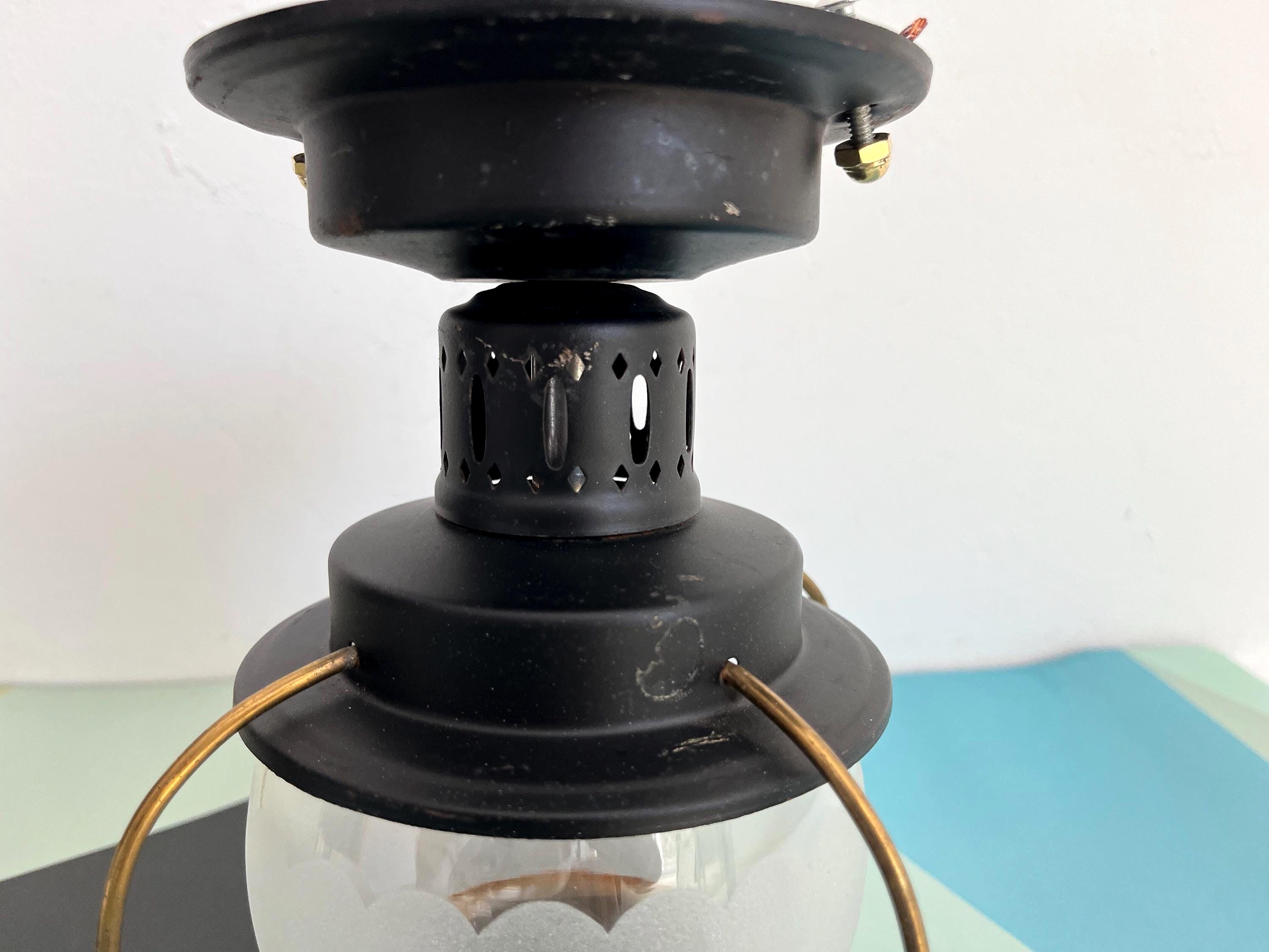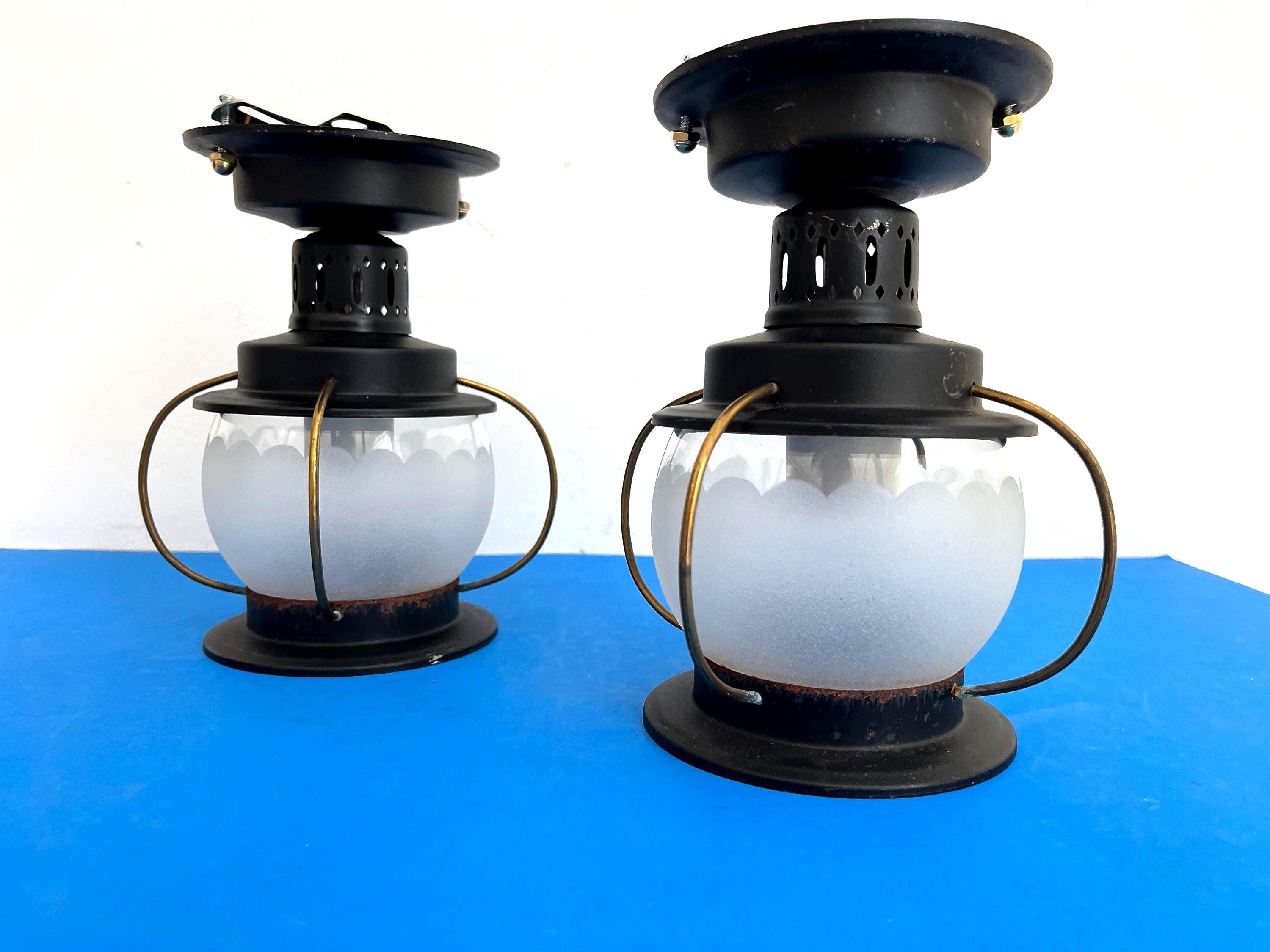 Petite 1950s caged iron semi flush ceiling lights in sleek nautical style with frosted and scalloped glass globes, pierced black iron finials, and gold brackets. Professionally restored with new wiring and porcelain sockets for standard bulbs.