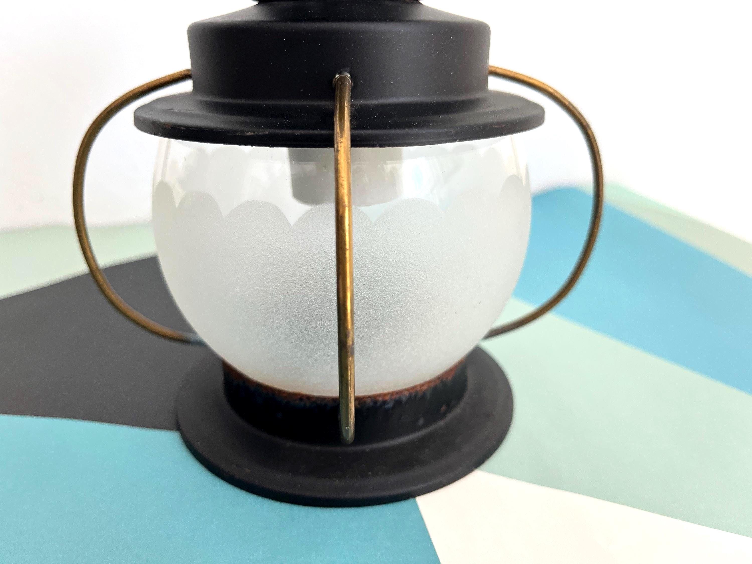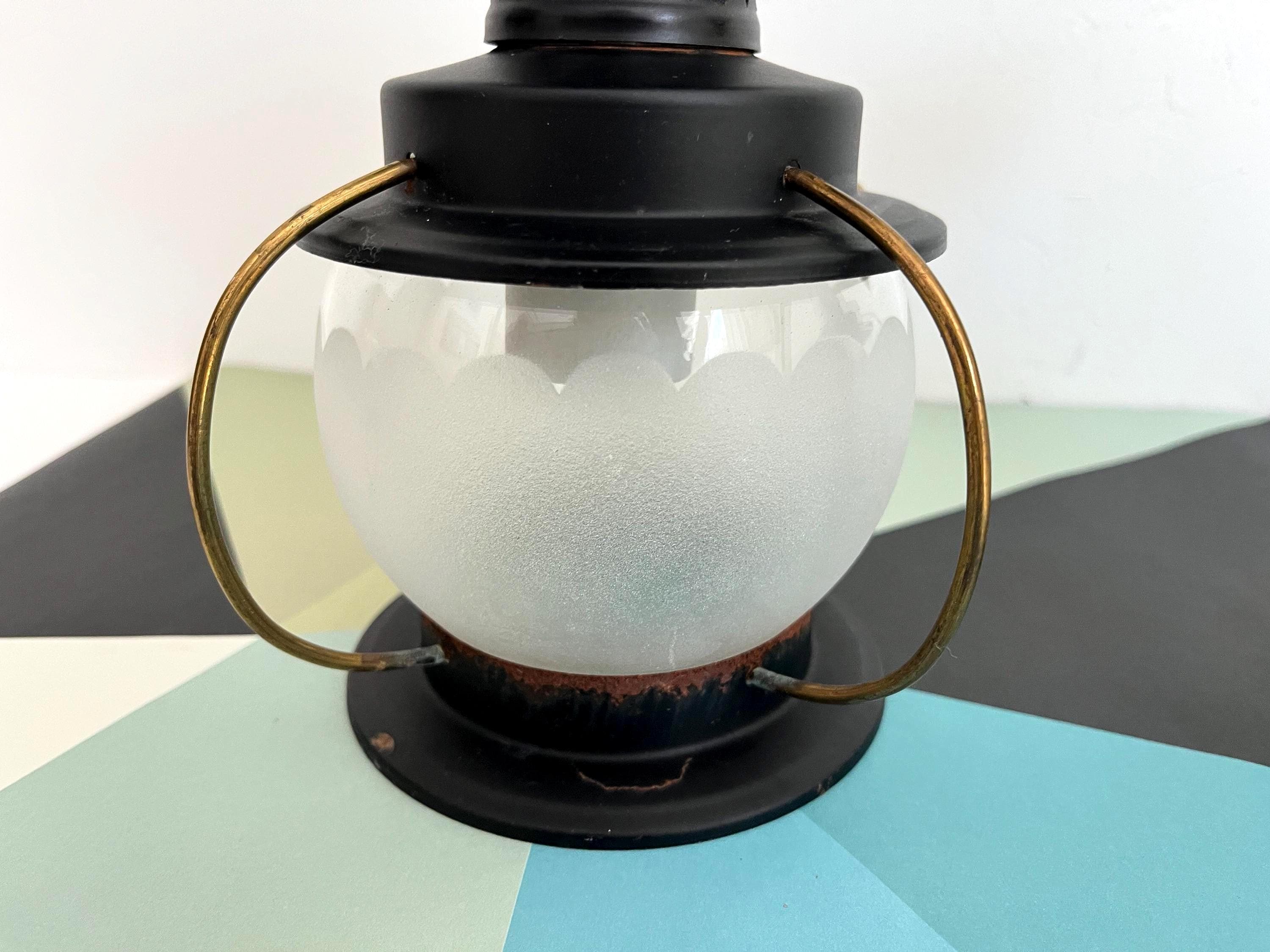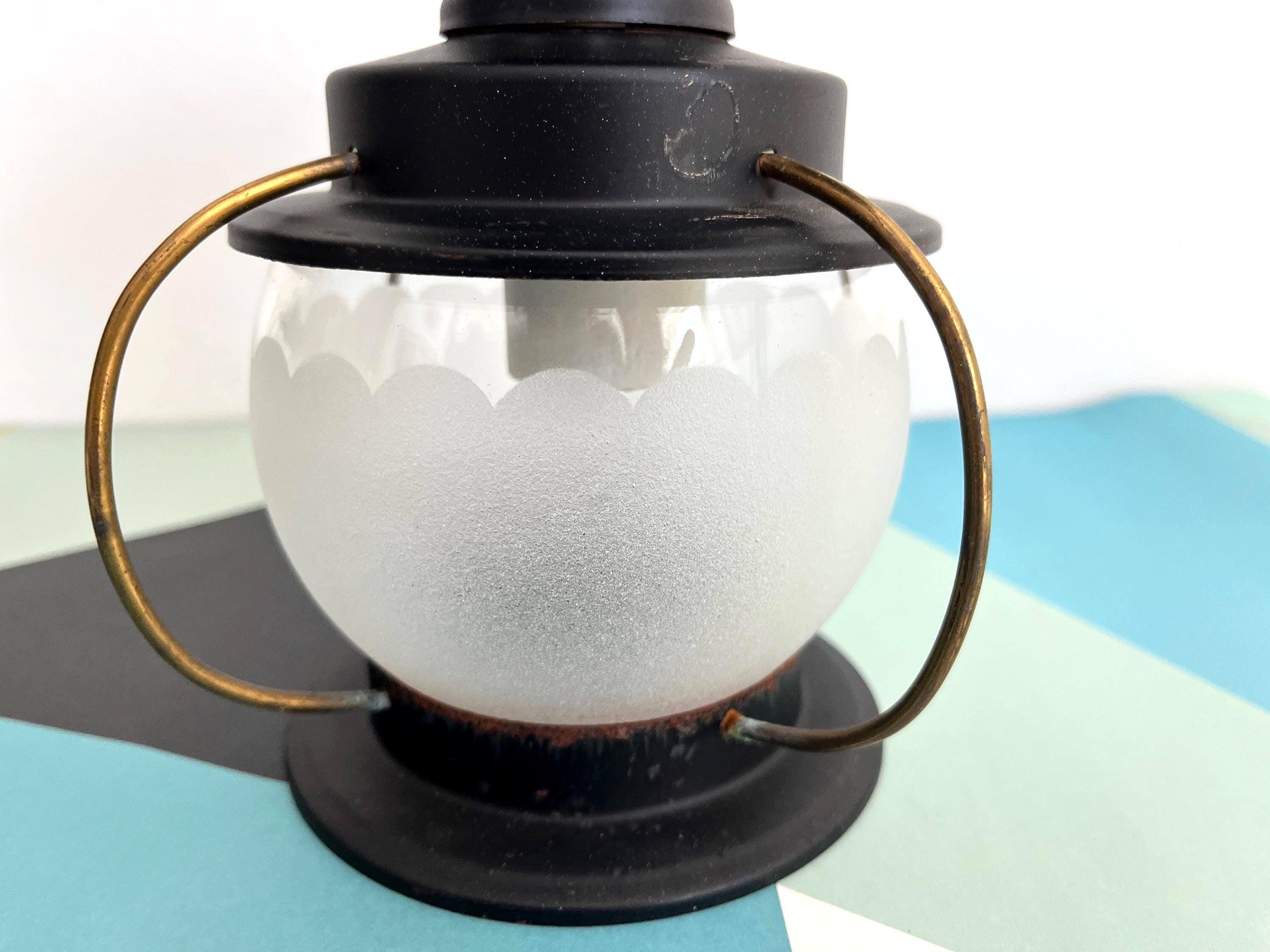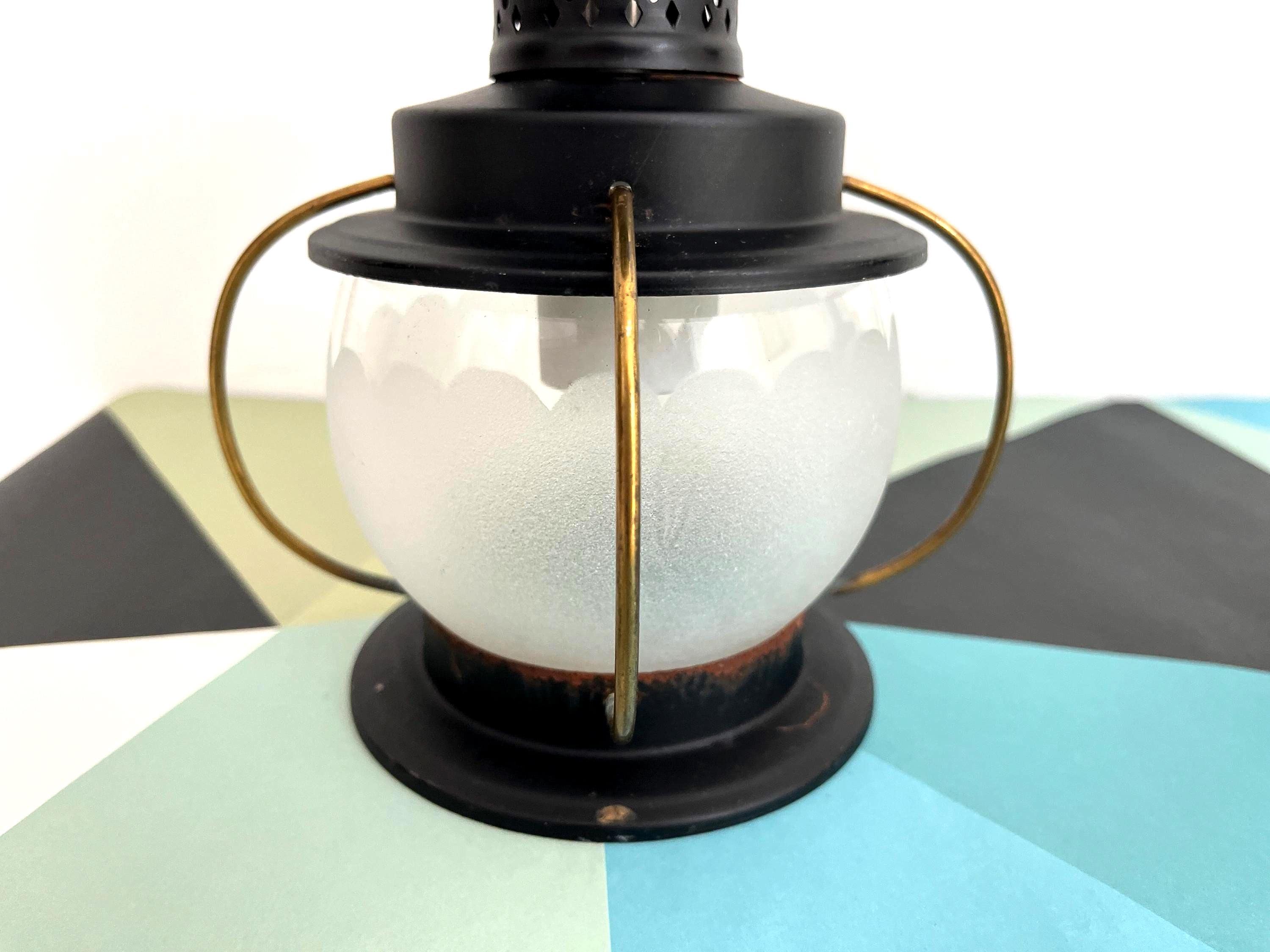 Petite 1950s caged iron semi flush ceiling lights in sleek nautical style with frosted and scalloped glass globes, pierced black iron finials, and gold brackets. Professionally restored with new wiring and porcelain sockets for standard bulbs.
