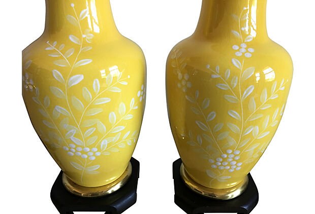 Large pair of Frederick Cooper lamps from the 1960s featuring painted ginger jars on their original wood bases. Chinoiserie-style lamps feature a sunshine yellow crackle glaze with raised white florals that are finished on all sides.