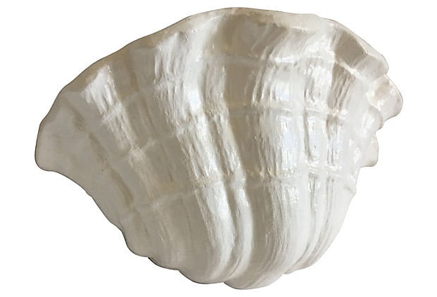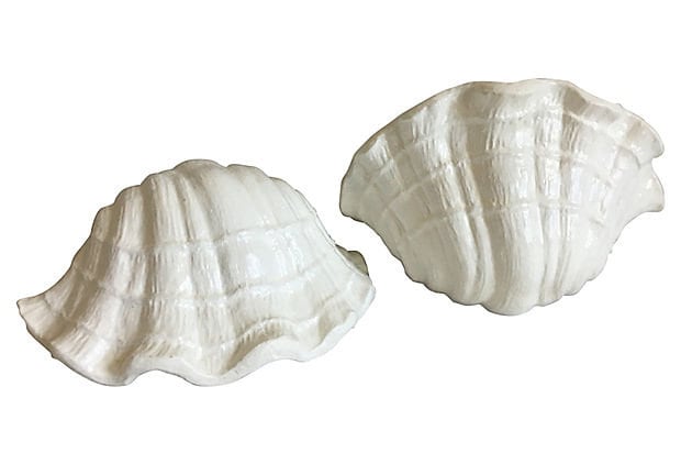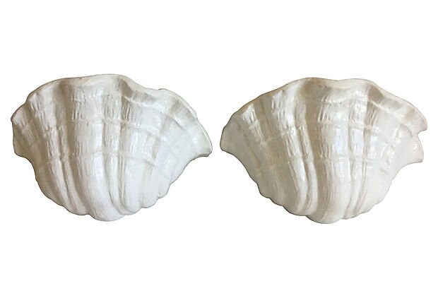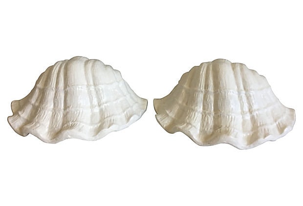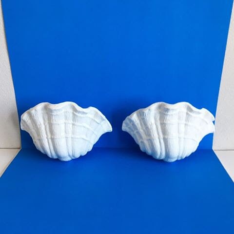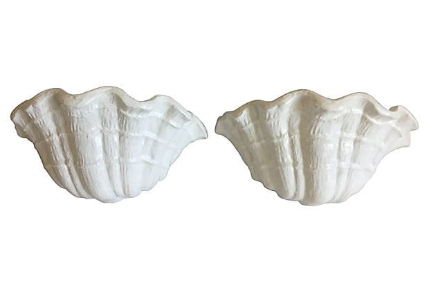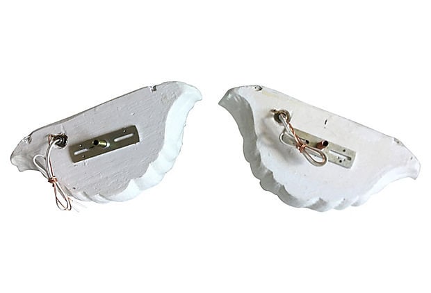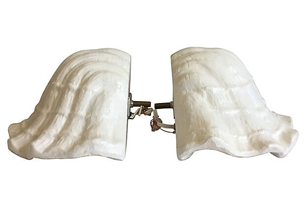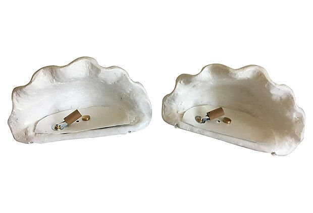 Hand-crafted pair of 1970s plaster clam shell sconces or wall lights styled after Giacometti's plaster shell lighting of the 1920s. Sculptural design features lifelike textured scalloped borders with one light each.