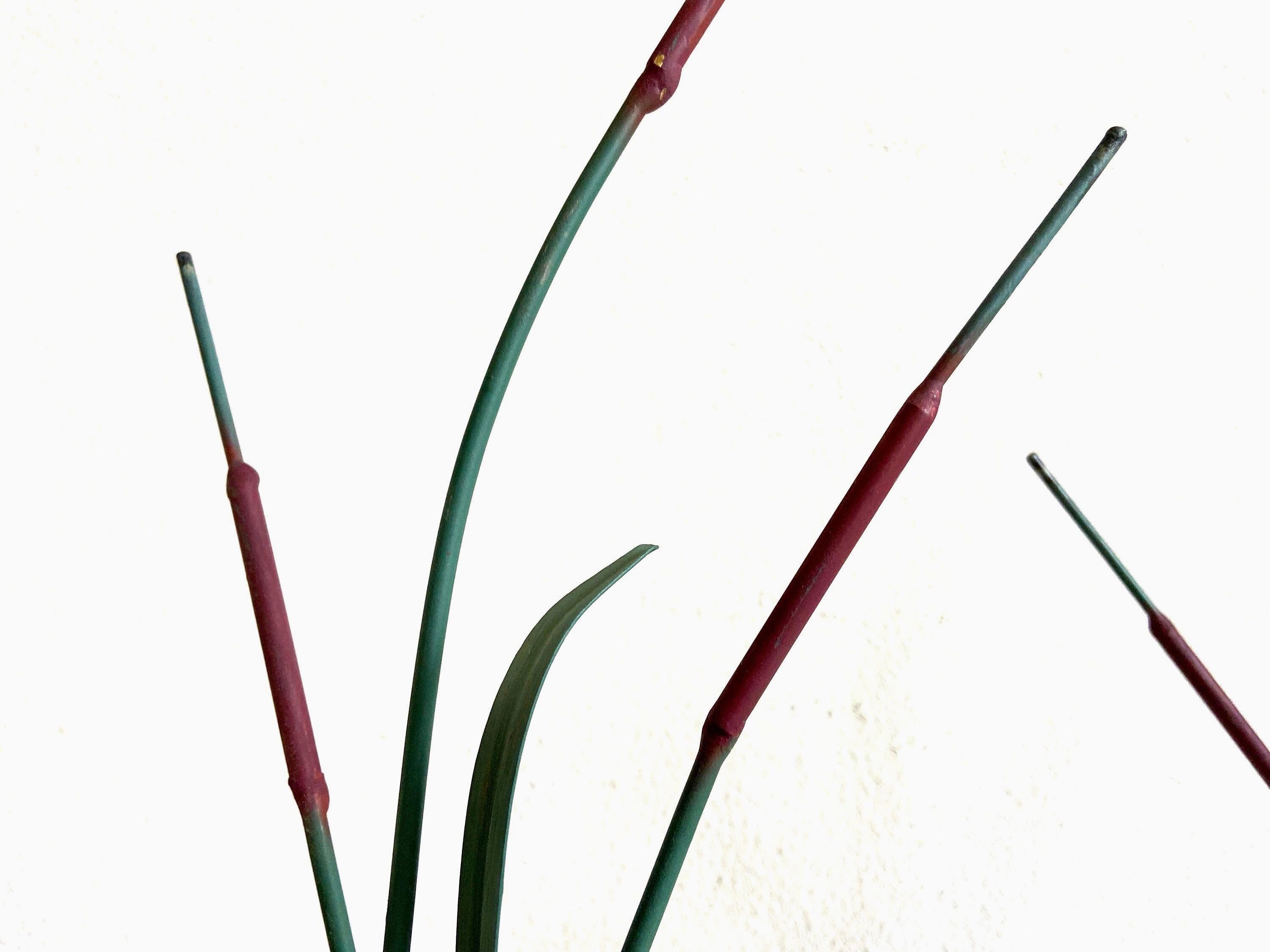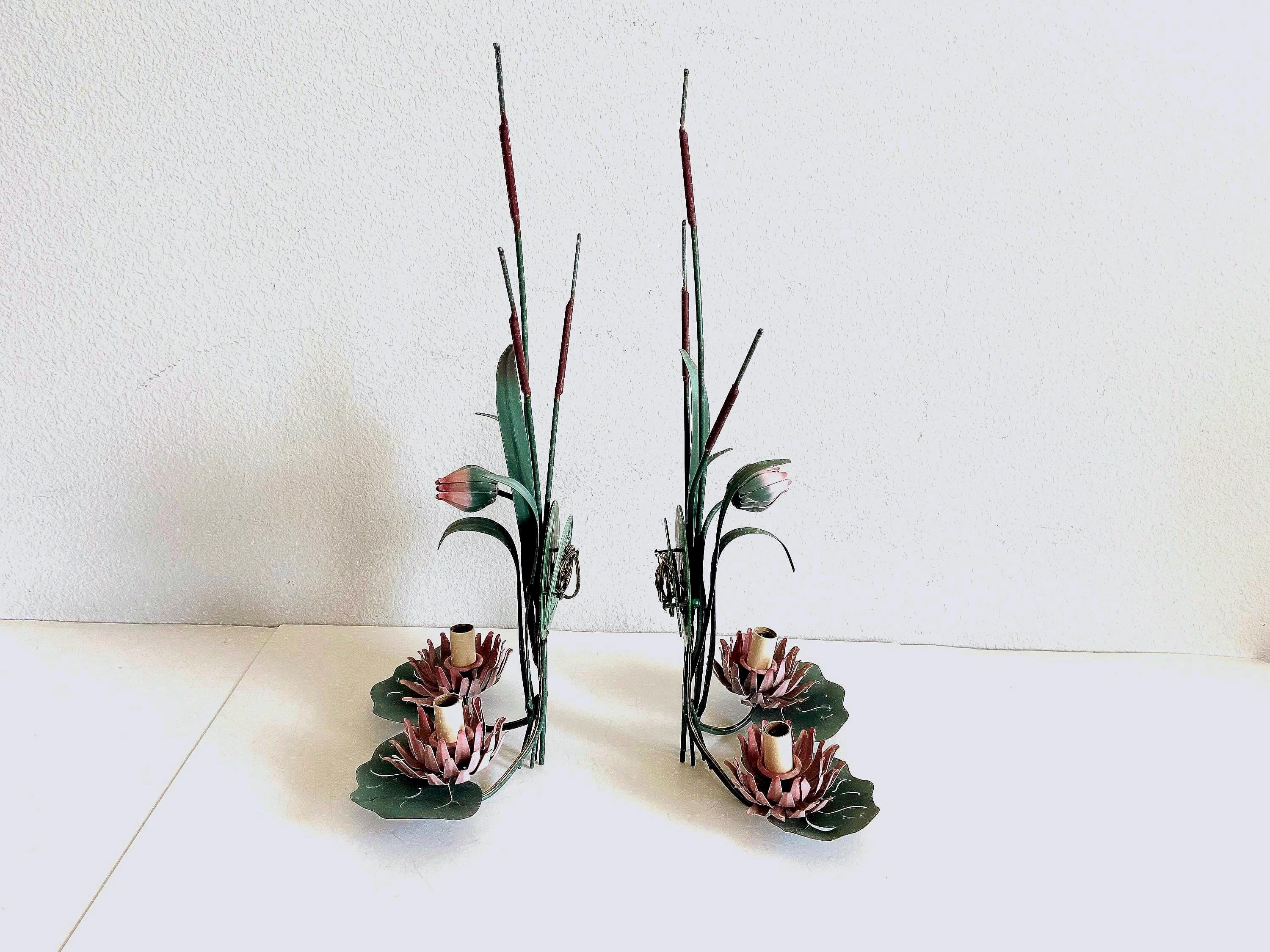 Big beautiful pair of two-arm tole lily pad sconces with lifelike cattail sprays, central buds, and layered pink lotus blossoms on pierced leaves in the original matte painted finish.